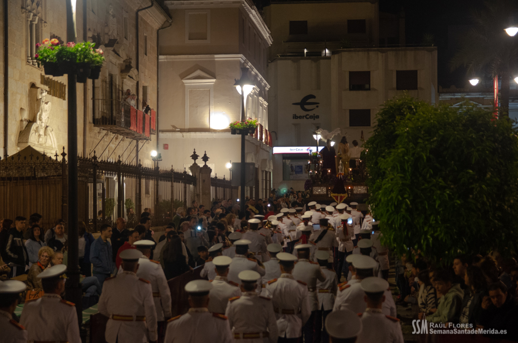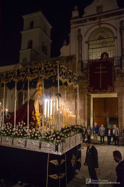 La emoción es palpable hasta en los andares y la Hermandad respira en su llegada a la Plaza de España. Se luce. Se recrea a su paso por la Concatedral ante la atenta miradas de los amantes de la semana de pasión emeritense y las miles de personas que llenan estos días las calles de la ciudad.