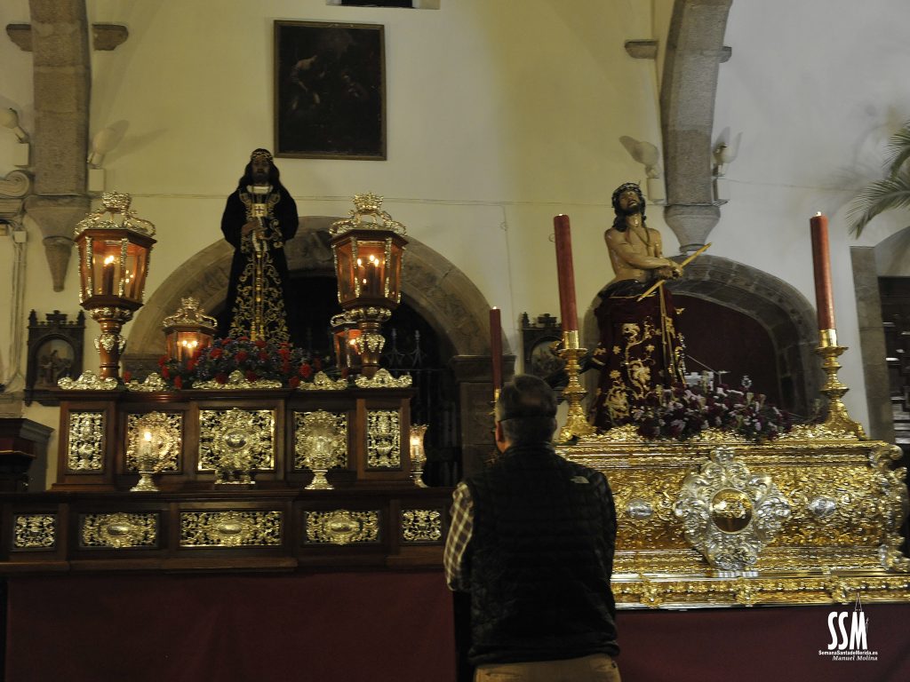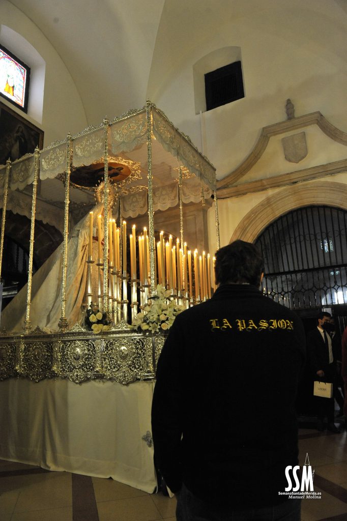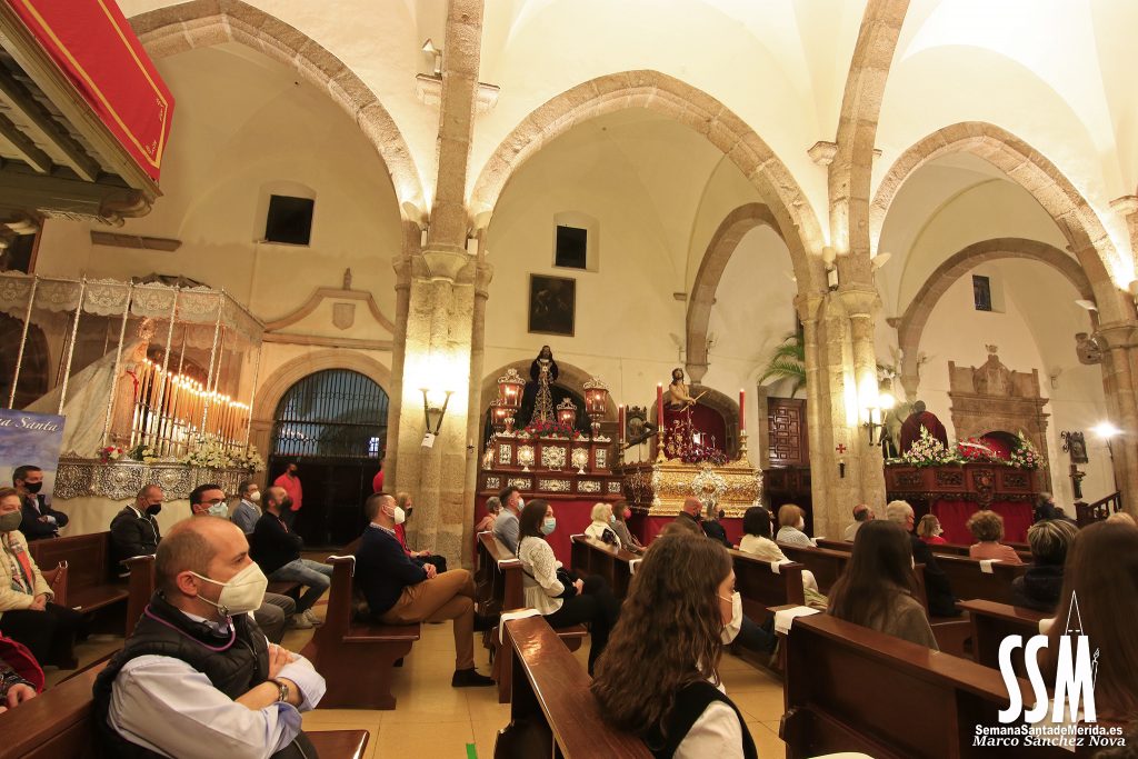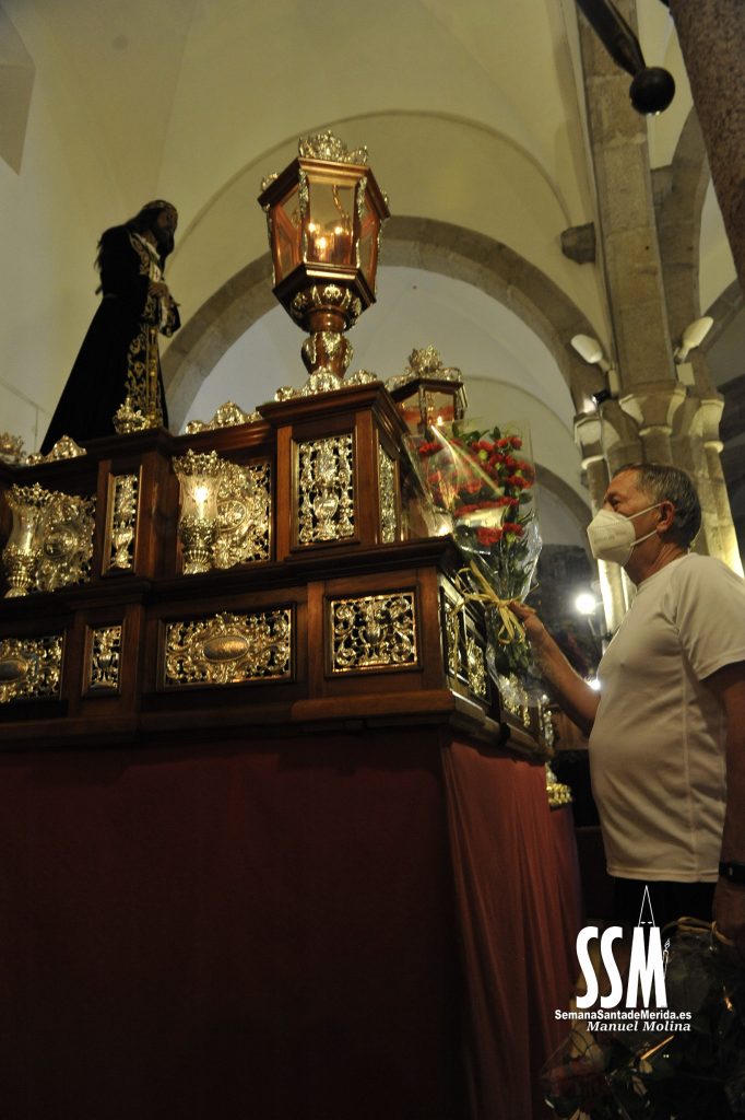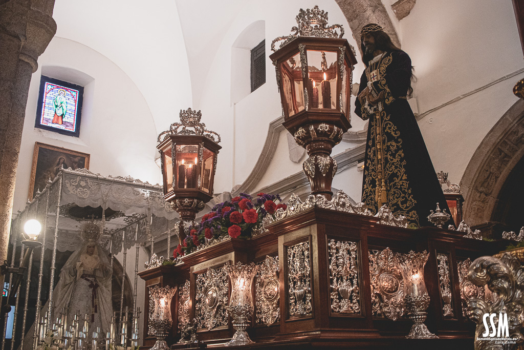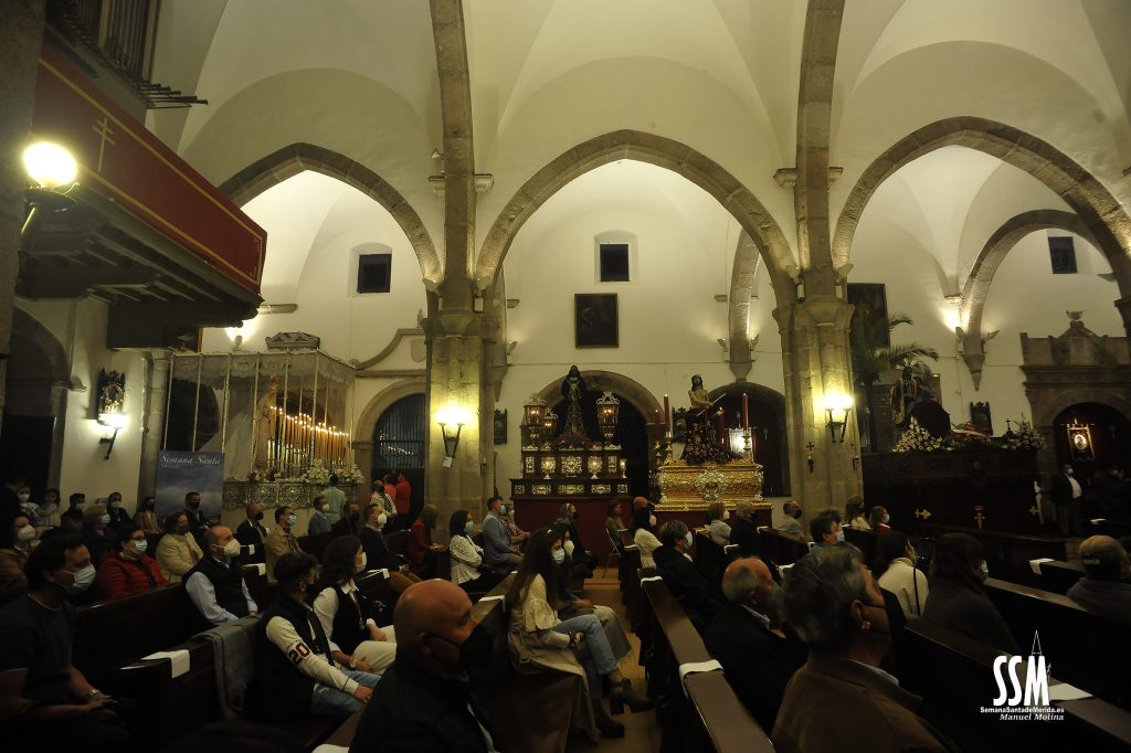 Tampoco vimos esa estampa íntima y sobrecogedora de la Hermandad entre los muros del convento de las “Encerradas” y de nuevo nos faltó el soberbio caminar del Cristo de las Injurias y el elegante paseo del Medinaceli, pero sí pudimos mirarlos de cerca, observar cada detalle y casi sentir lo que ellos sienten. No vimos a la luna traspasar el palio y hacer destellos entre los rosarios de plata, ni pudimos disfrutar del discurrir de la Hermandad por el Templo de Diana, pero sí pudimos dirigirnos a las tres imágenes de una forma íntima y paciente, un rato de liturgia en torno a lo esencial de todo esto. La mirada del Cristo no pudo observar el cielo, pero hace tiempo que nosotros lo hacemos por él y también cargamos con su cruz.