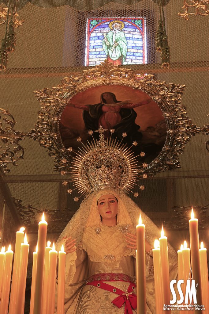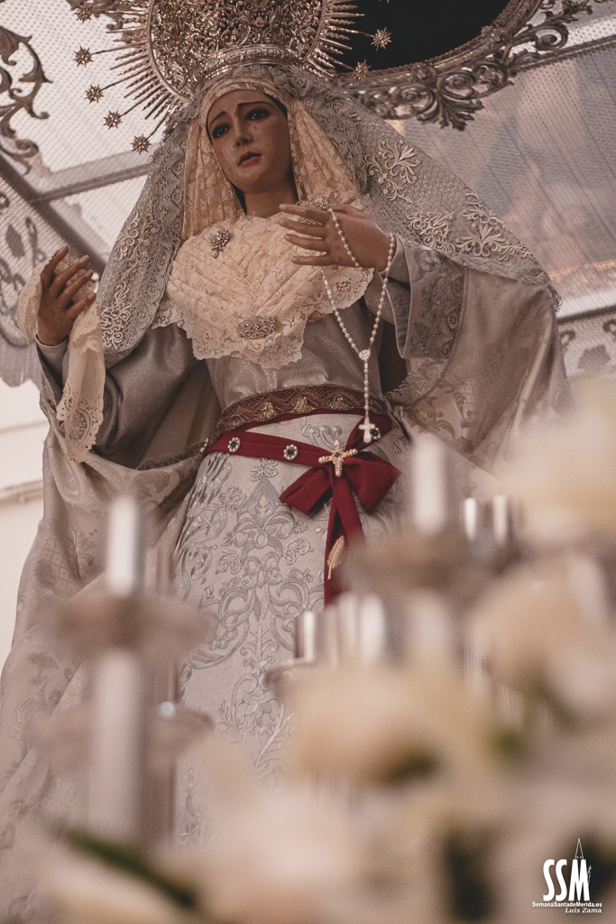 El empedrado de la Plaza de España no se tiñó de rojo con el mosaico que forman las capas de los infantiles, y no sonaron cornetas y tambores para anunciar que Nuestra Señora del Rosario ya estaba en la calle, pero sí se dibujaron sonrisas y abrazos. Sí se pintó un lazo rojo, con el color rojo infantil, que unió -más si cabe- a los hermanos de esta cofradía. No hubo racheo en los pies de los portadores, ni cubrerostro ni aplausos. No escuchamos el desgarrador gemido tras una levantá de los costaleros, pero sí hubo lágrimas, hasta del cielo. Sonó la palabra, sonó la oración y también hubo sones cofrades en el interior templo gracias al violín de Alejandro.