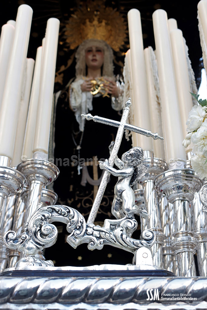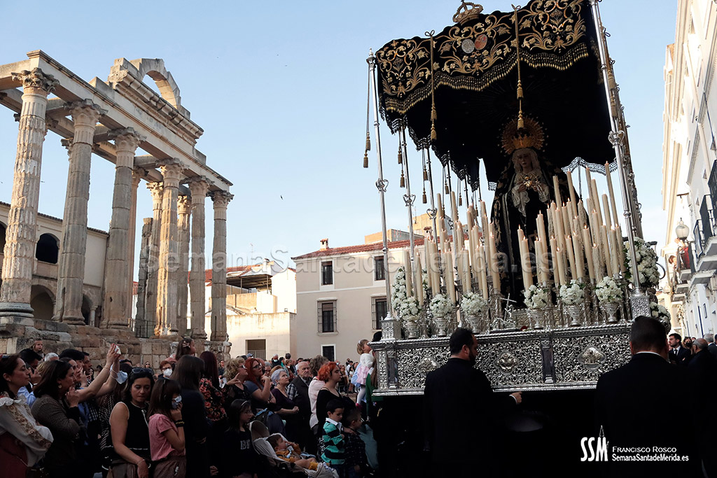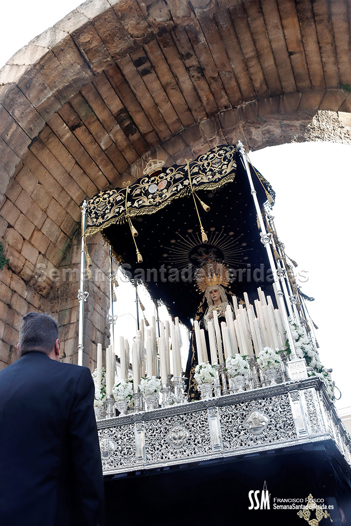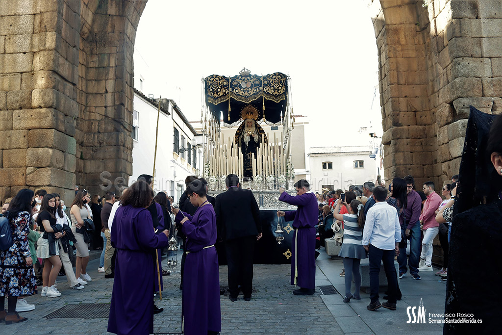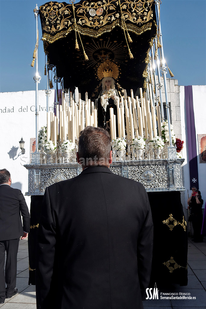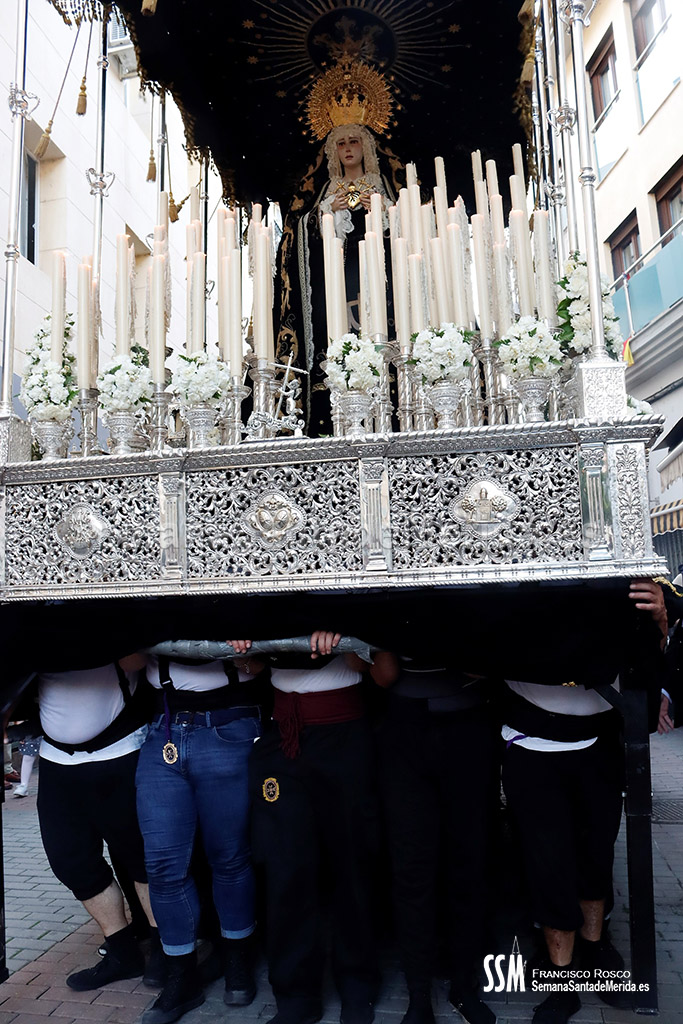 Aires decimonónicos de la Santísima Virgen de los Dolores, ese palio que, cada Viernes Santo, se convierte en el cierre mariano de la Pasión y Muerte de Cristo. Pausada, con mimo y elegancia, paseó su dolor desde el Calvario, ofreciendo también estampas de otros años, sobre todo de los 70 cuando paseaba por Romero Leal y Berzocana. Todo un acierto recuperar esta estampa, ahora a todo color, en una ciudad que se abre a la Semana Santa.