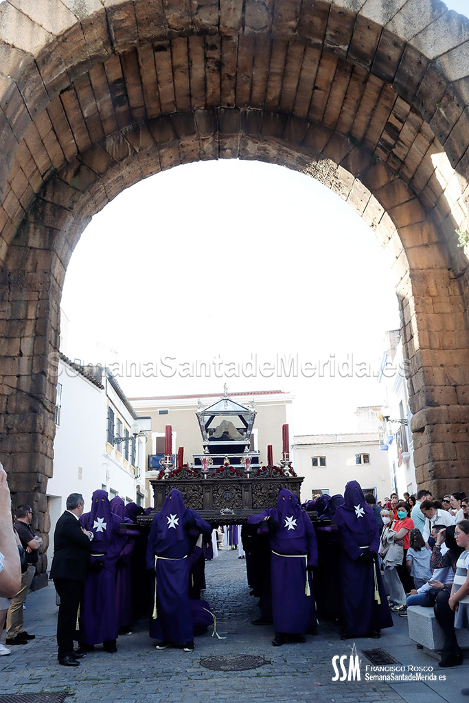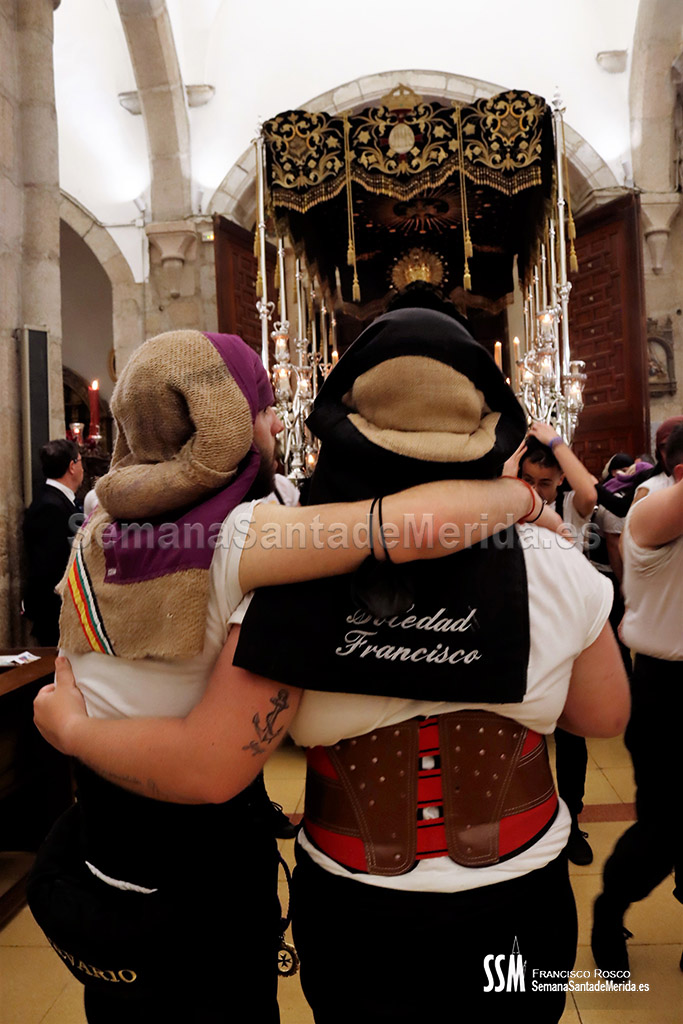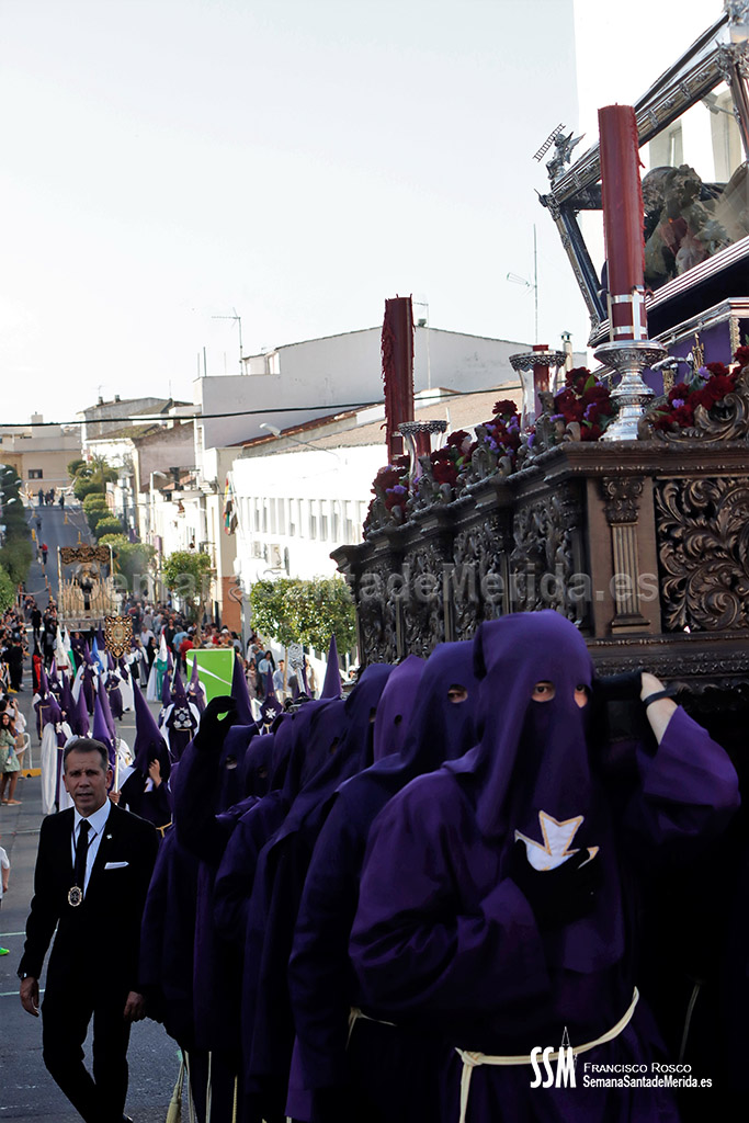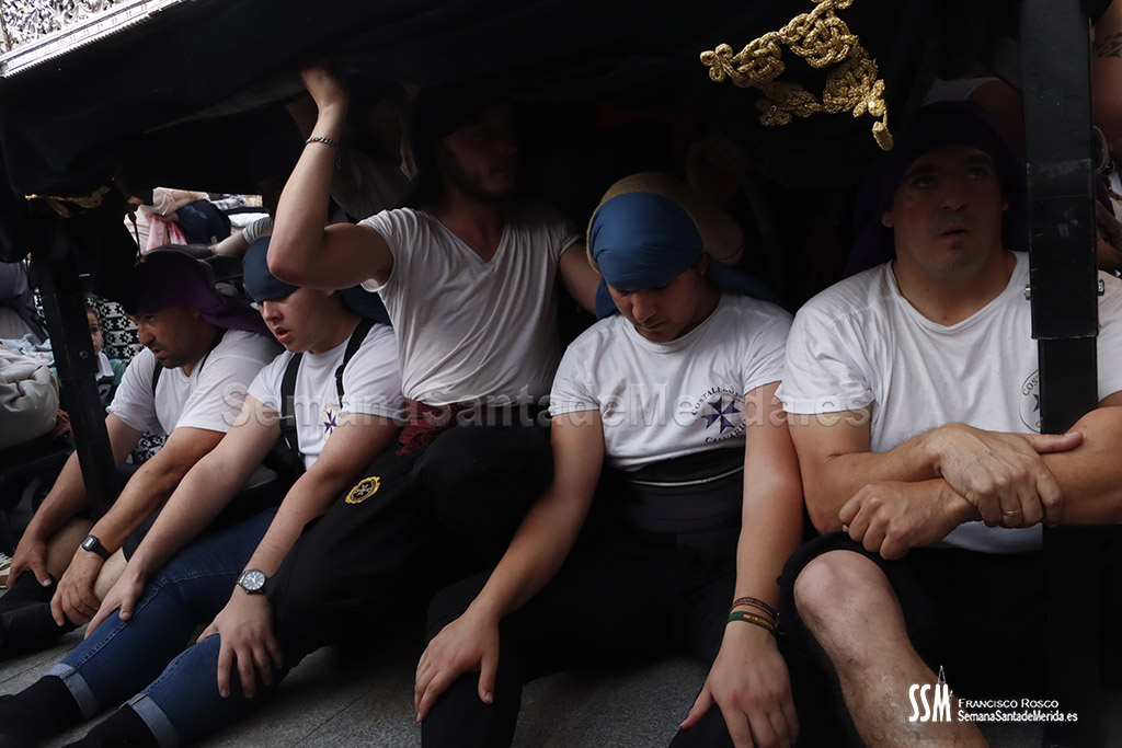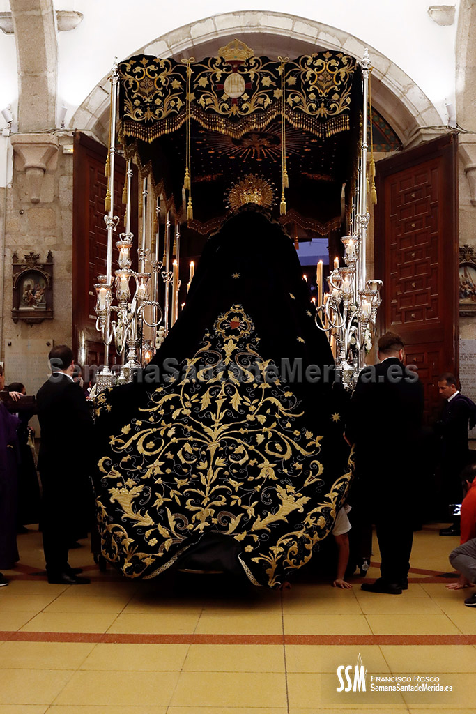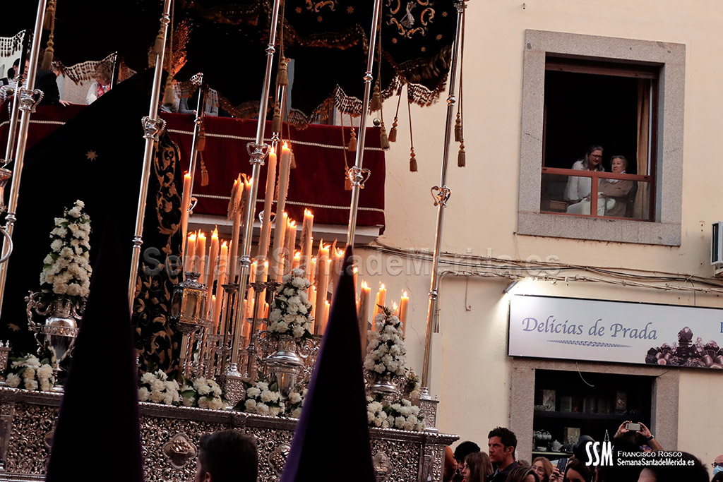 Aires decimonónicos de la Santísima Virgen de los Dolores, ese palio que, cada Viernes Santo, se convierte en el cierre mariano de la Pasión y Muerte de Cristo. Pausada, con mimo y elegancia, paseó su dolor desde el Calvario, ofreciendo también estampas de otros años, sobre todo de los 70 cuando paseaba por Romero Leal y Berzocana. Todo un acierto recuperar esta estampa, ahora a todo color, en una ciudad que se abre a la Semana Santa.