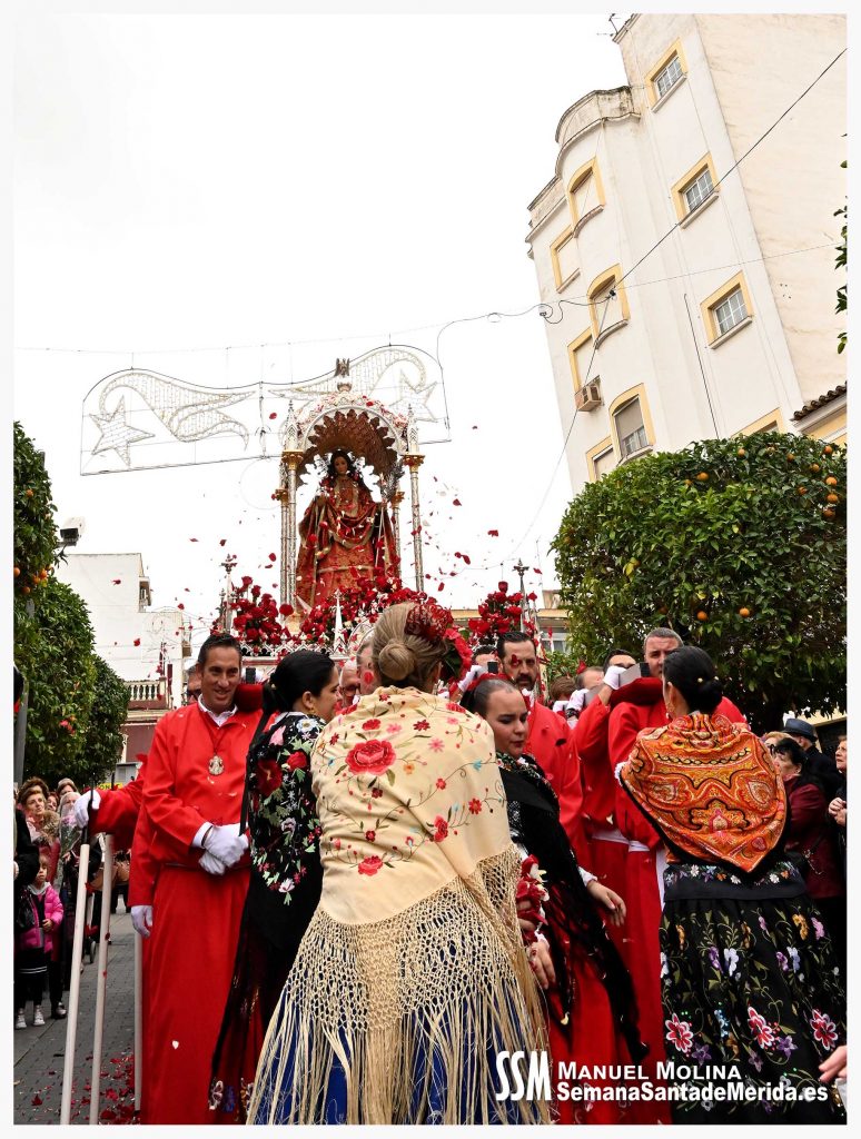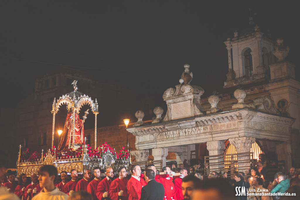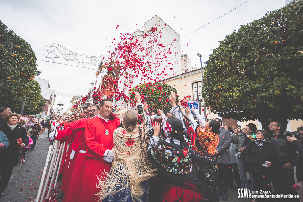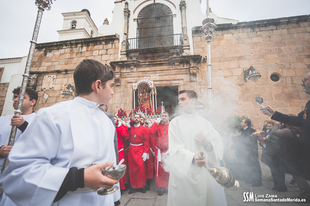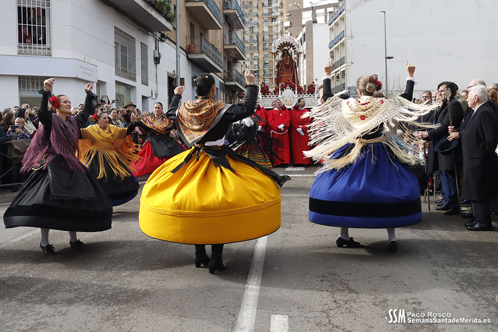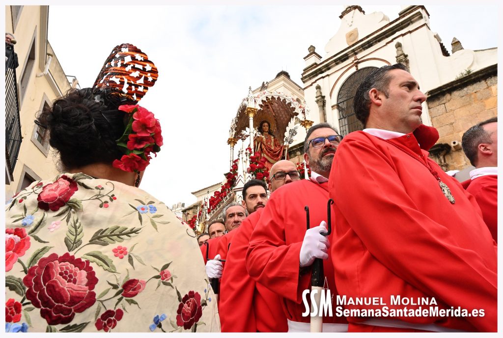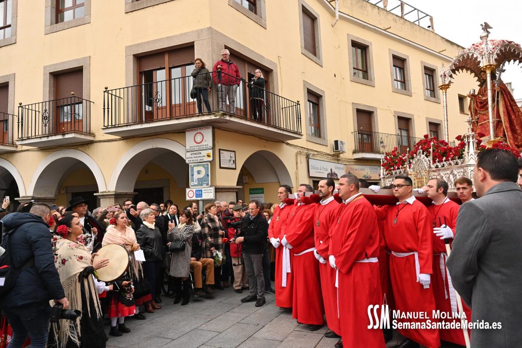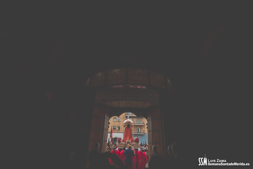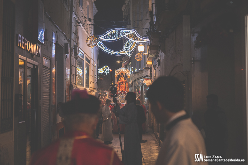 Valiente, Eulalia salió al reencuentro con su pueblo, no llovía, ni había previsión de que lo fuera a hacer. El caso es que Eulalia comenzó su recorrido triunfal por las calles de Mérida apareciendo en su atrio, con toque manual de campanas y fandangos de Huelva, como si quisiera extender su manto a los pueblos onubenses que la tienen por patrona.