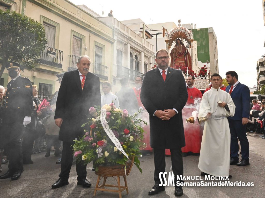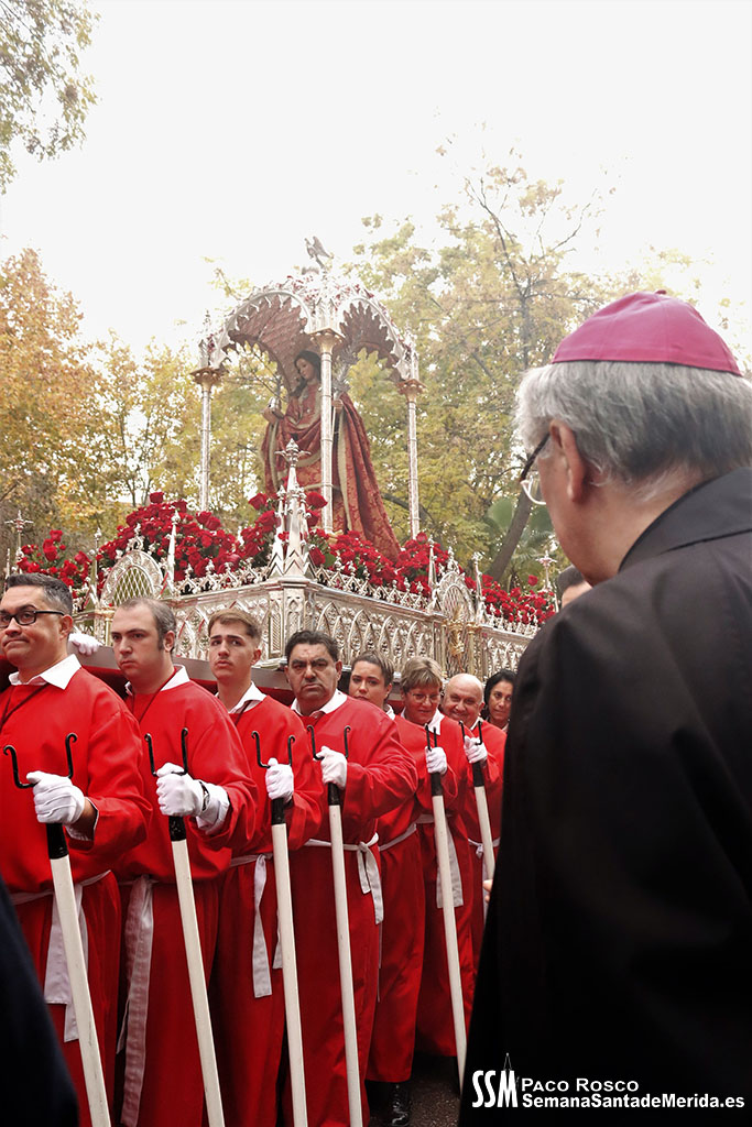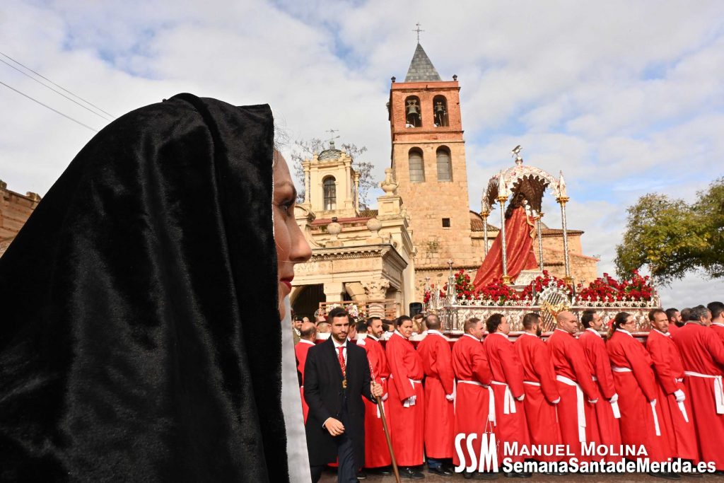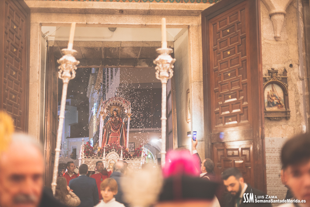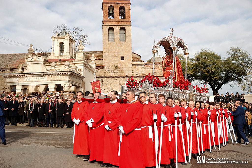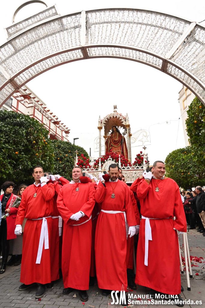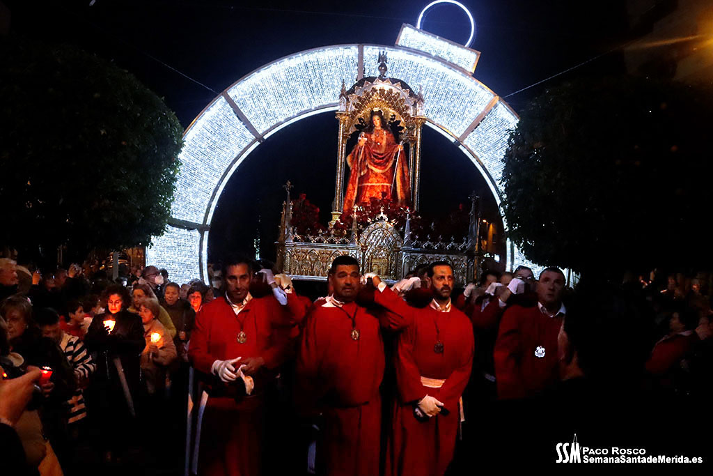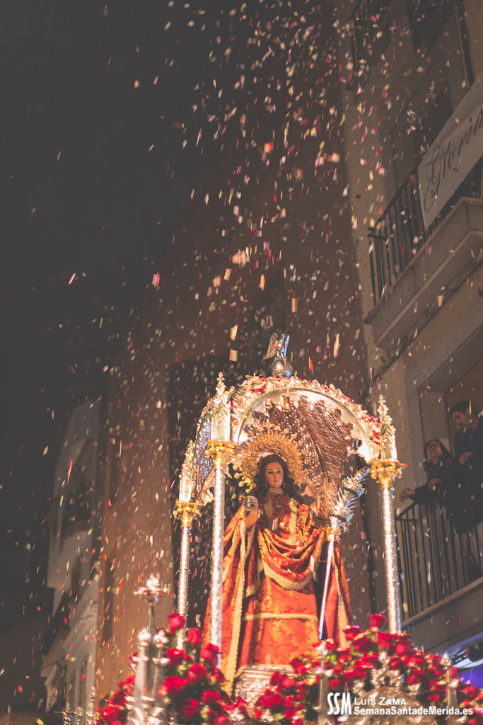 Valiente, Eulalia salió al reencuentro con su pueblo, no llovía, ni había previsión de que lo fuera a hacer. El caso es que Eulalia comenzó su recorrido triunfal por las calles de Mérida apareciendo en su atrio, con toque manual de campanas y fandangos de Huelva, como si quisiera extender su manto a los pueblos onubenses que la tienen por patrona.