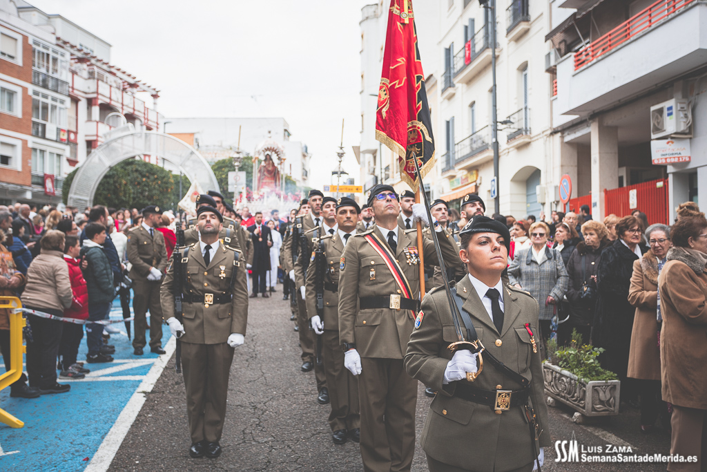 A la mañana siguiente todos estaban en su sitio, desde las asociaciones religiosas hasta el piquete del GACA XI que acompaña anualmente a la patrona. Desde las bandas a la Asociación de la Antigua que llegaba cuajada de cantes y flores. Y no faltaba, por supuesto, la Corporación Municipal.