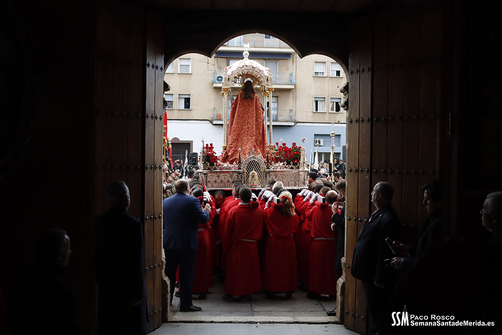 Ya en el Templo de Diana, la Mártir se creció y sacó arrojo para avanzar entre la multitud de paraguas que se abrían a su paso. Una intensa petalá comenzaba a caer sobre Ella en la calle Romero Leal, al tiempo que la lluvia se hacía más insistente por lo que, en Plaza del Rastro, reviró con elegancia para enfilar la Plaza de España y entrar, directamente, en Santa María.