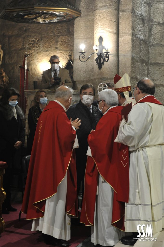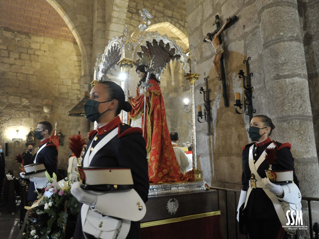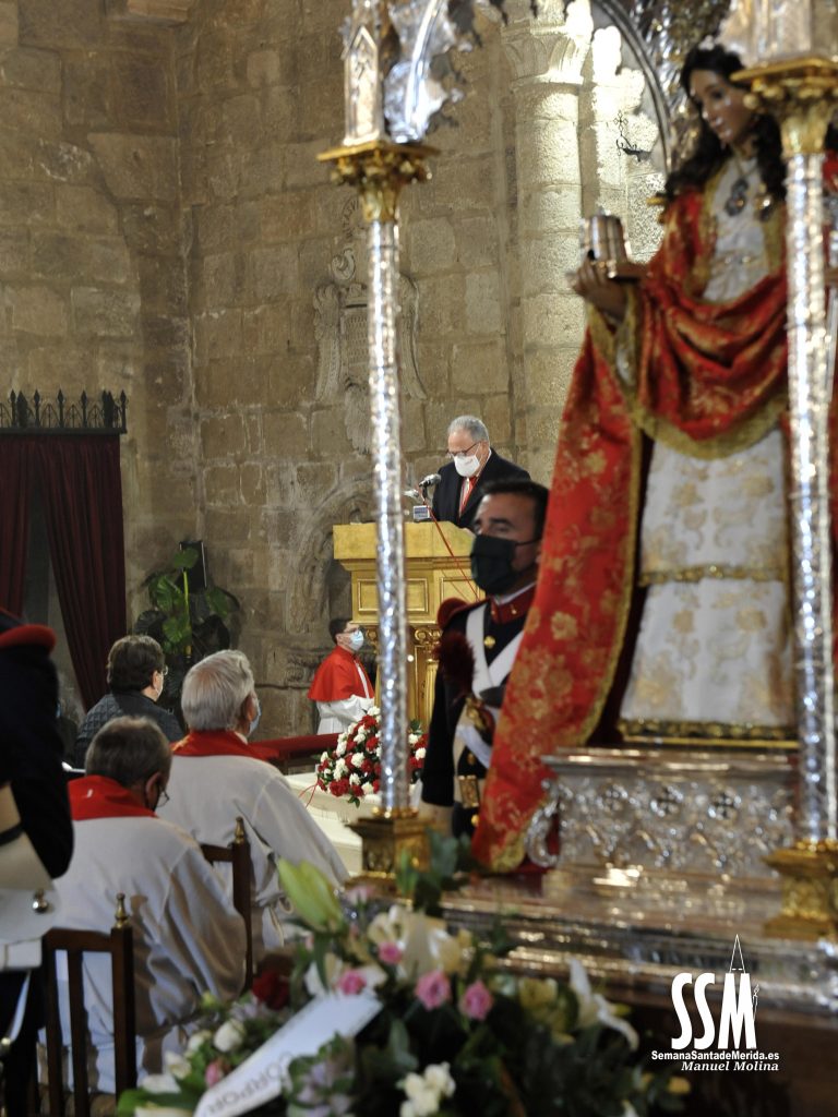 Como si del Trecenario se tratara, se organizaron cuatro misas para la jornada y en la de las 12, la Mártir recibió en su Basílica a las autoridades civiles y militares, a la sociedad emeritense que siempre la acompaña en este día y, en ambiente solemne, el Arzobispo Don Celso Morga nos recordó la importancia del testimonio de la joven emeritense.