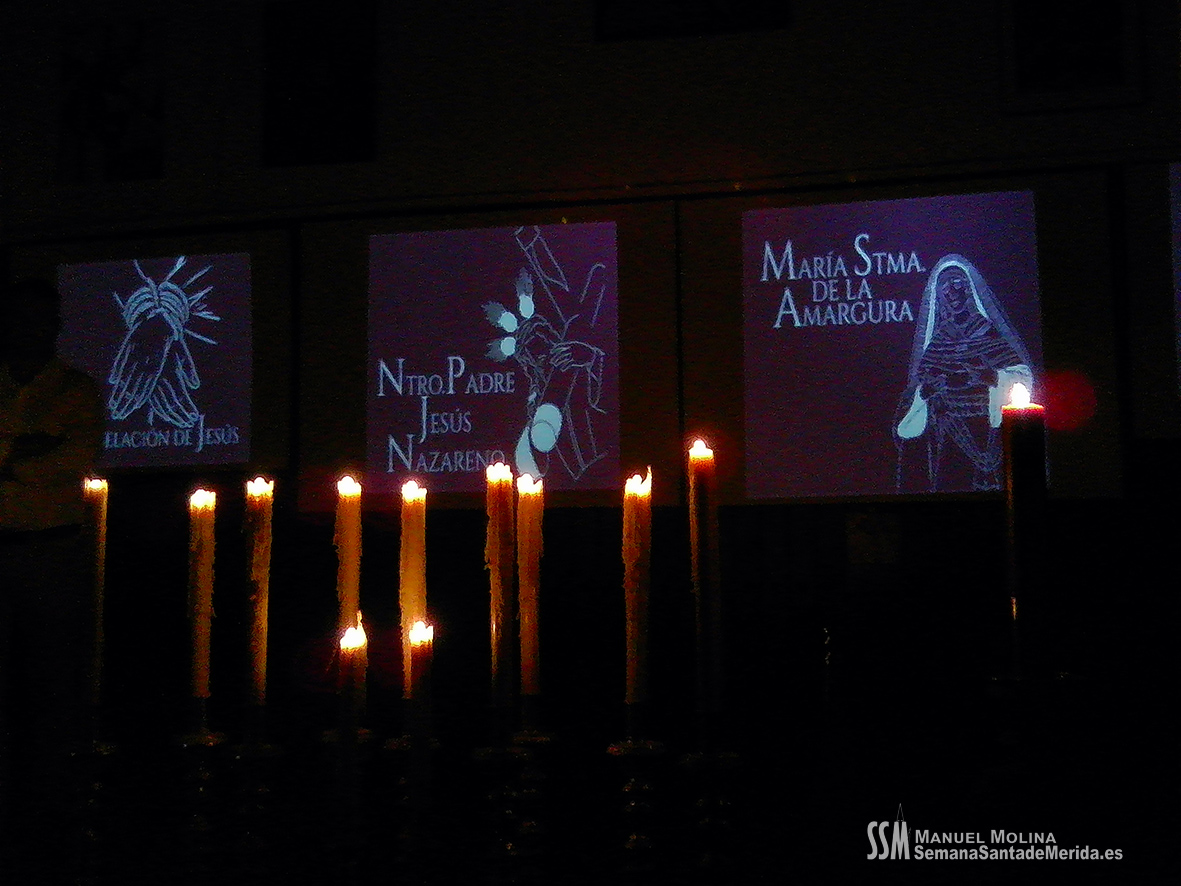 Y es que nada más atravesar la cortina de acceso a la sede nos encontramos con la única luz de las velas de la candelería de María Santísima de la Amargura en un rincón, junto a la urna que conserva las que fueran sus primeras manos, realizadas por Pineda Calderón en las que, los más avispados, encuentran ese sello personal del imaginero, alejado del de Luis Álvarez Duarte, que ejecutó las manos de una dolorosa más bonitas de cuantas haya en la Semana Santa de Mérida.