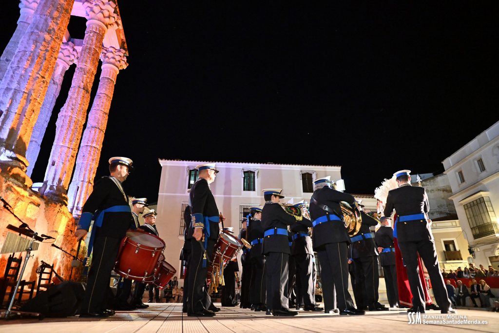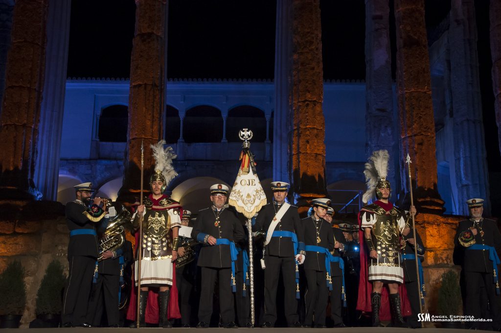 La Banda de Cornetas y Tambores de la OJE de Mérida puso sus sones mientras el publico llegaba, acompañados por miembros de la Centuria Romana, enmarcados ante las columnas.