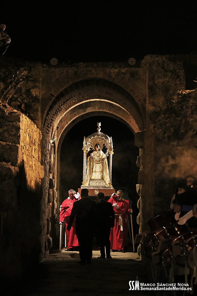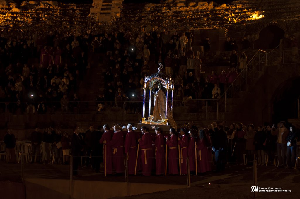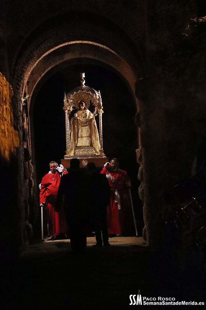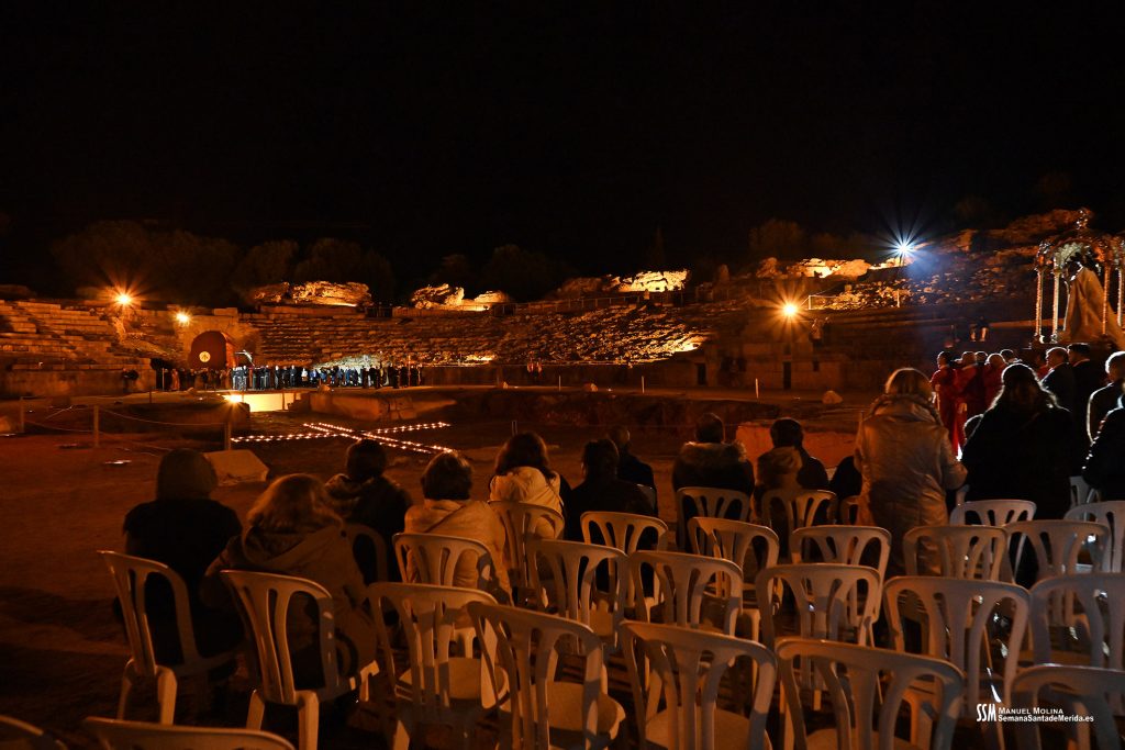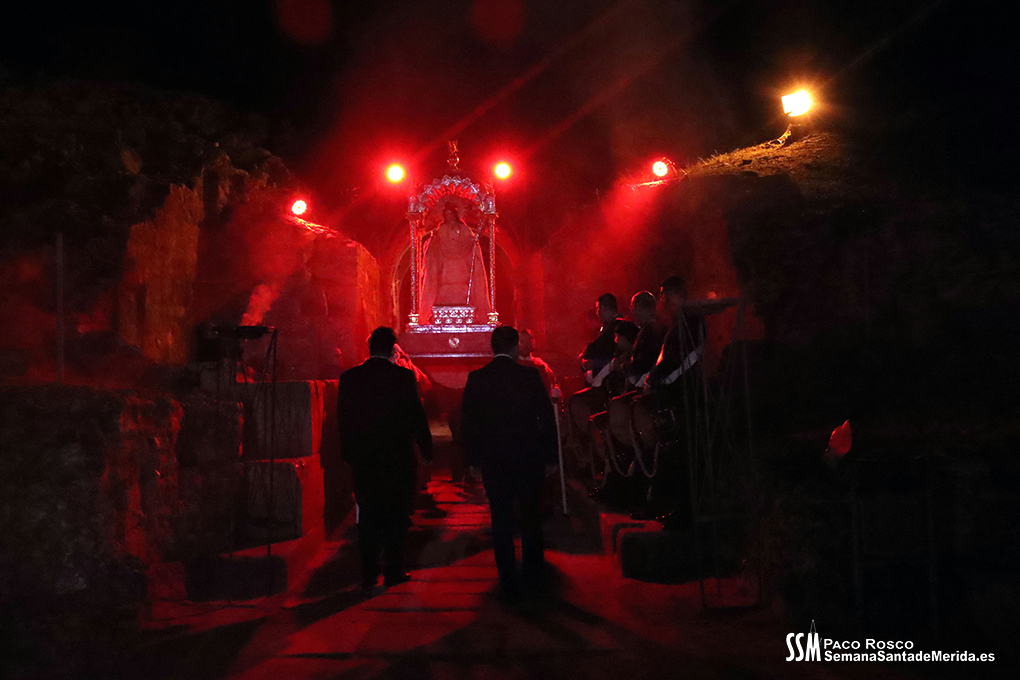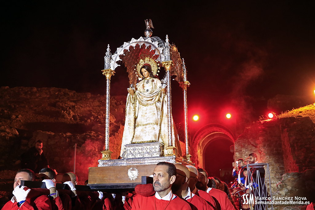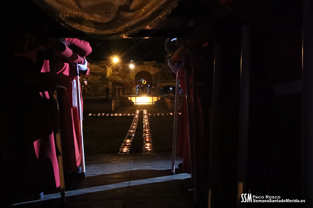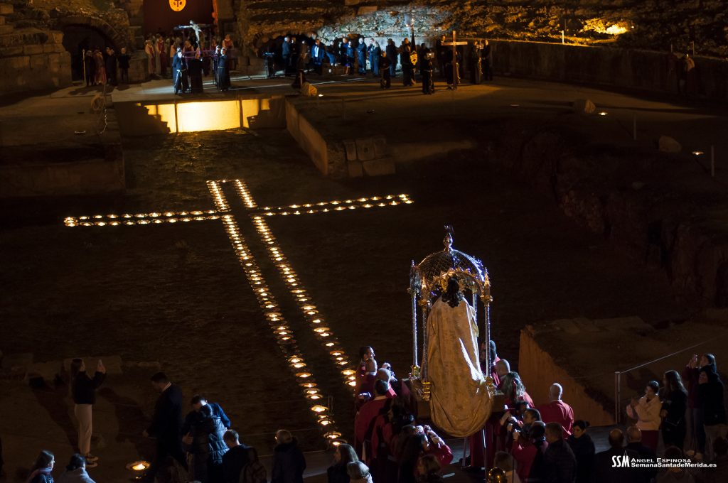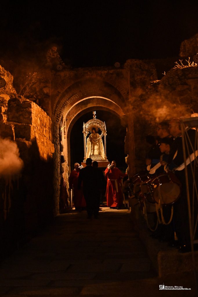 Parecía Viernes Santo, pero no lo era. La disposición de todos los elementos en el recinto era la misma, pero no era Viernes Santo. Sonaban tambores roncos, de la OJE de Mérida, y no era Viernes Santo. Era sábado y, a lo lejos, en esa hora de la noche, comenzaban a sonar las campanas anunciando que Santa Eulalia comenzaba su camino hacia el recinto monumental.