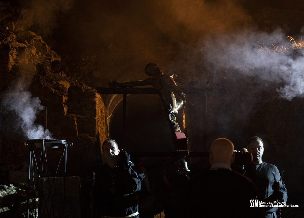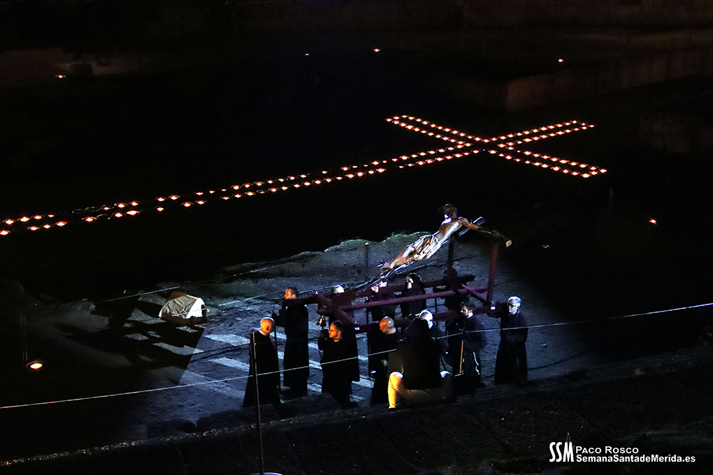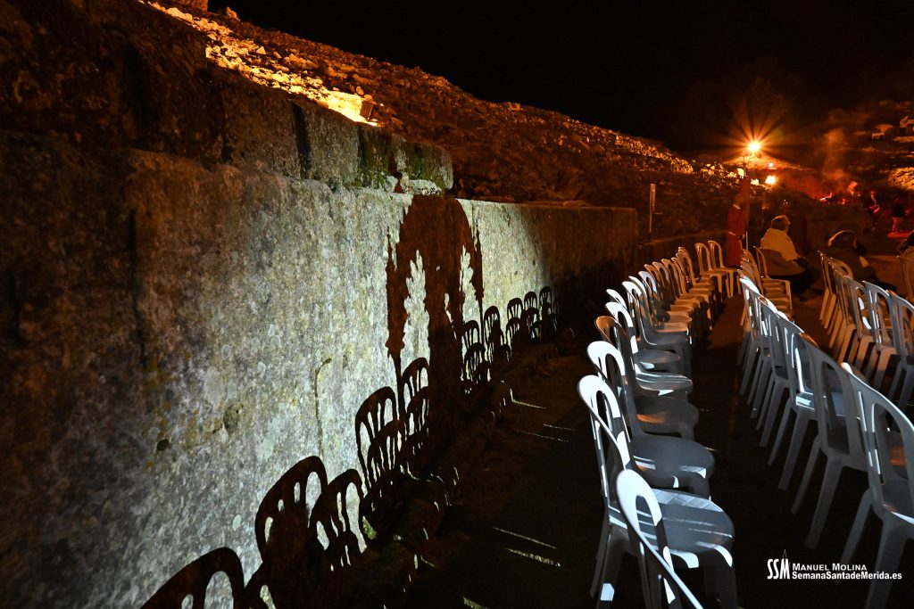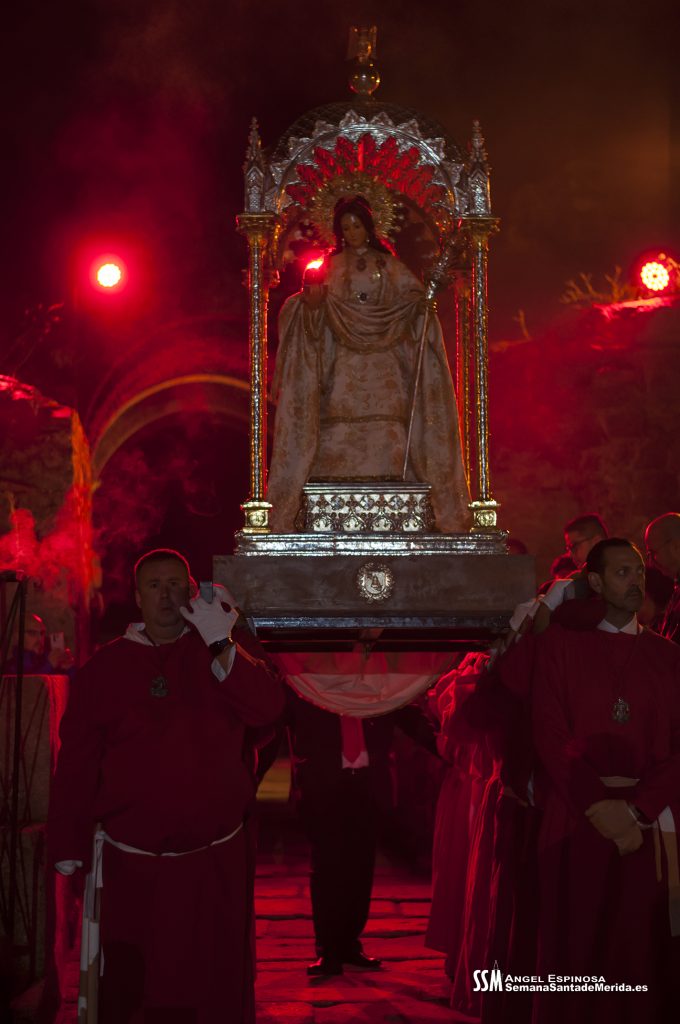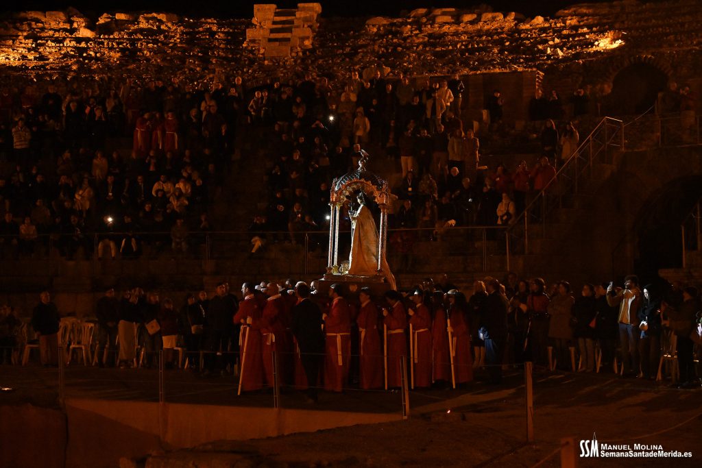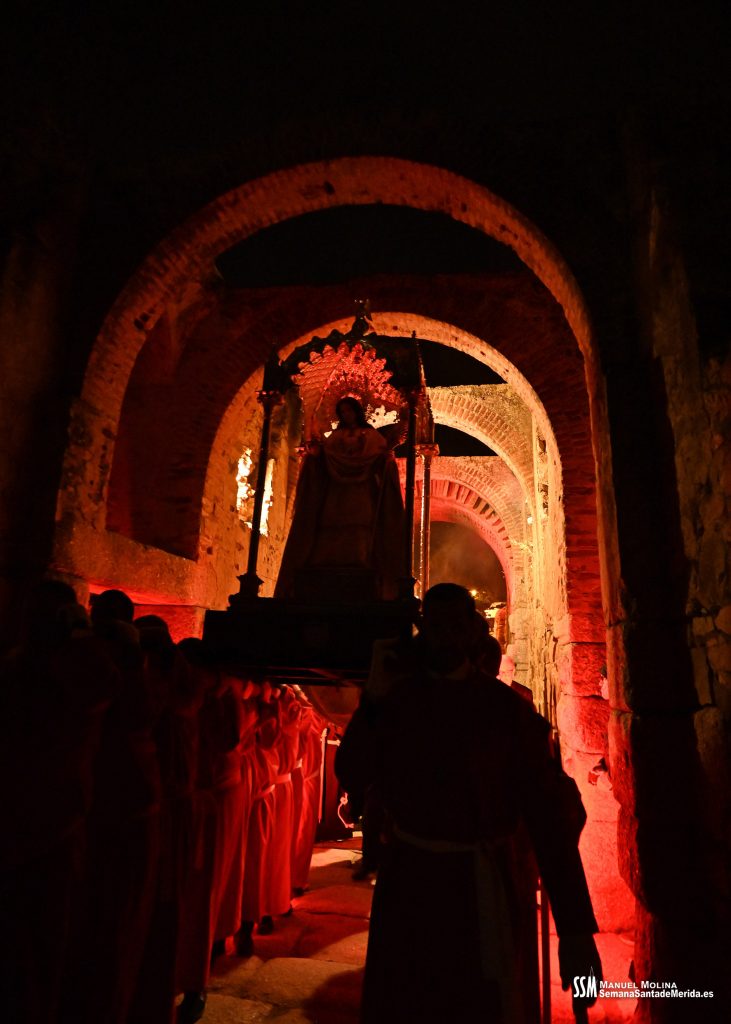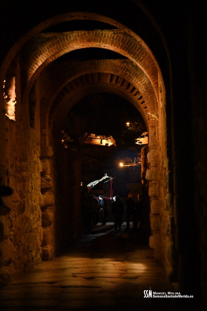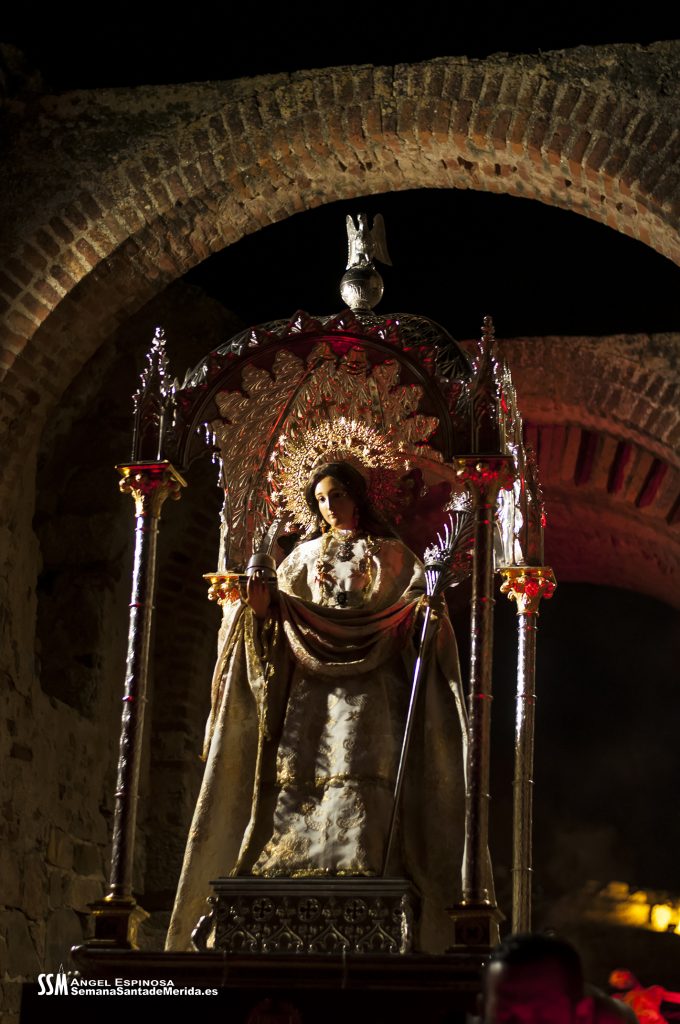 Parecía Viernes Santo, pero no lo era. La disposición de todos los elementos en el recinto era la misma, pero no era Viernes Santo. Sonaban tambores roncos, de la OJE de Mérida, y no era Viernes Santo. Era sábado y, a lo lejos, en esa hora de la noche, comenzaban a sonar las campanas anunciando que Santa Eulalia comenzaba su camino hacia el recinto monumental.