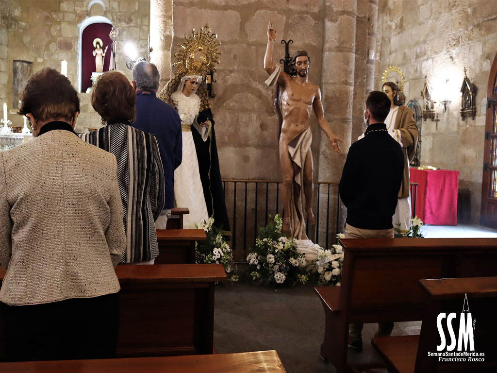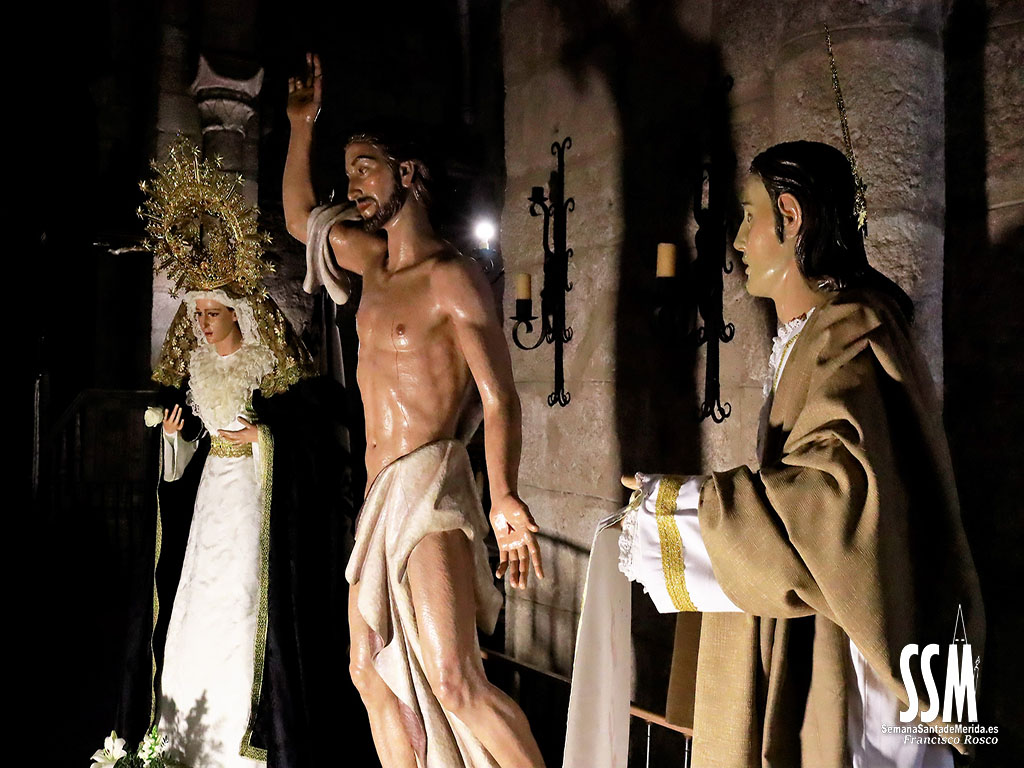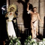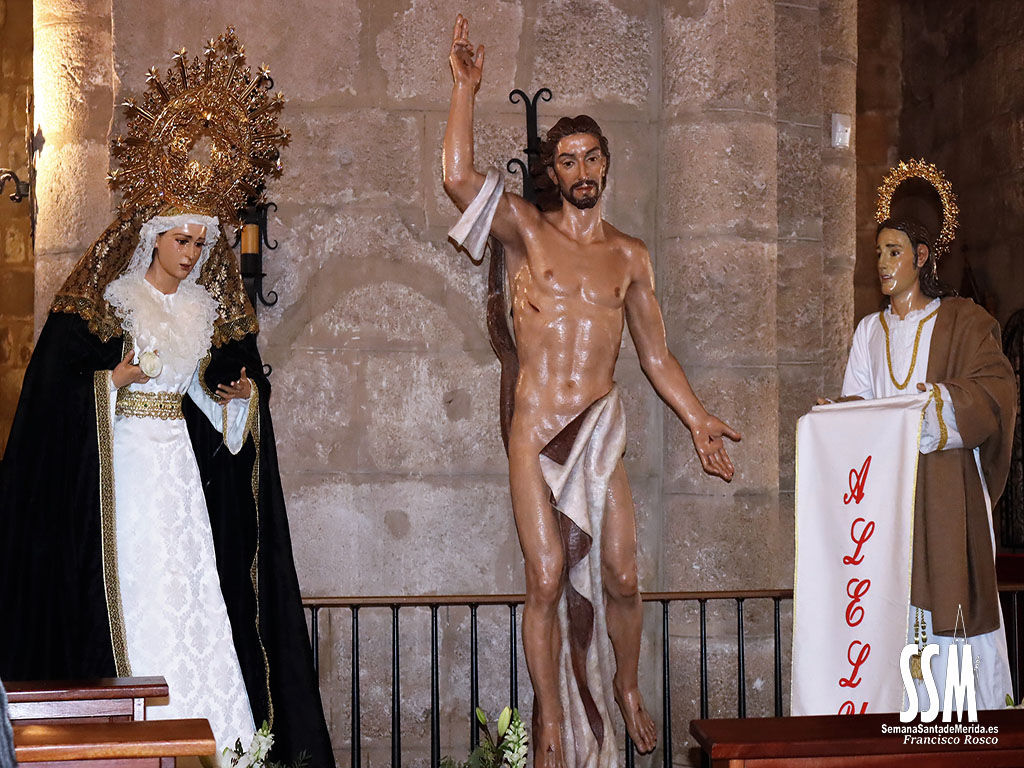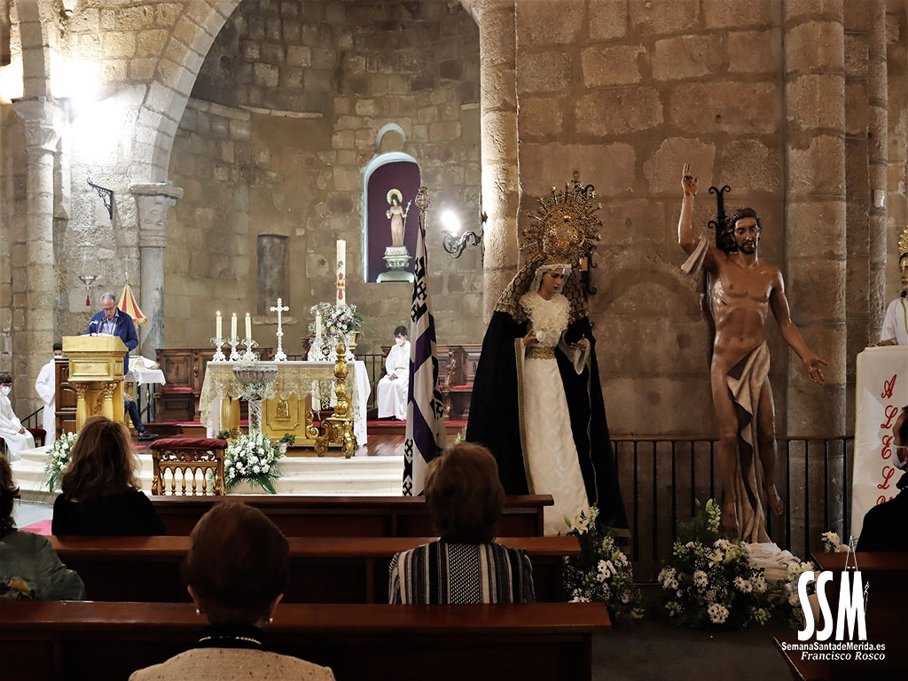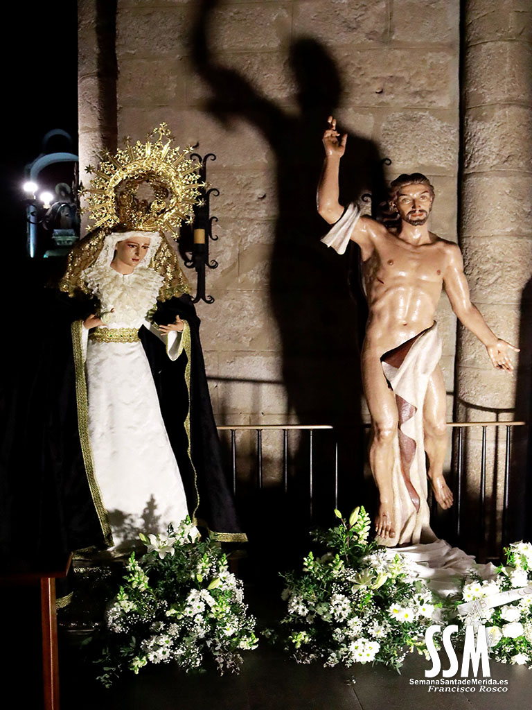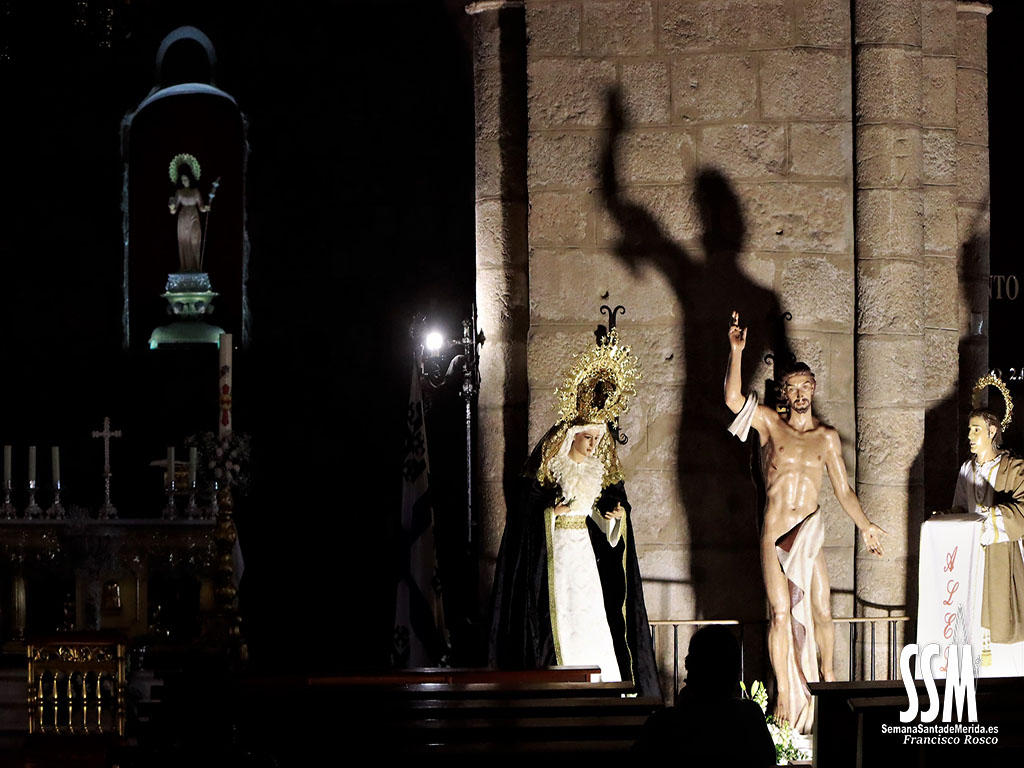 Y la certeza la encontrábamos en Santa Eulalia donde, nuevamente, San Juan ha anunciado la buena nueva y la Virgen del Mayor Dolor se ha encontrado con Jesús Resucitado. Una bellísima estampa que, junto al Altar Mayor, nos encontrábamos nada más entrar en la Basílica. Los colores rojo, verde y morado daban paso al blanco de la Resurrección.