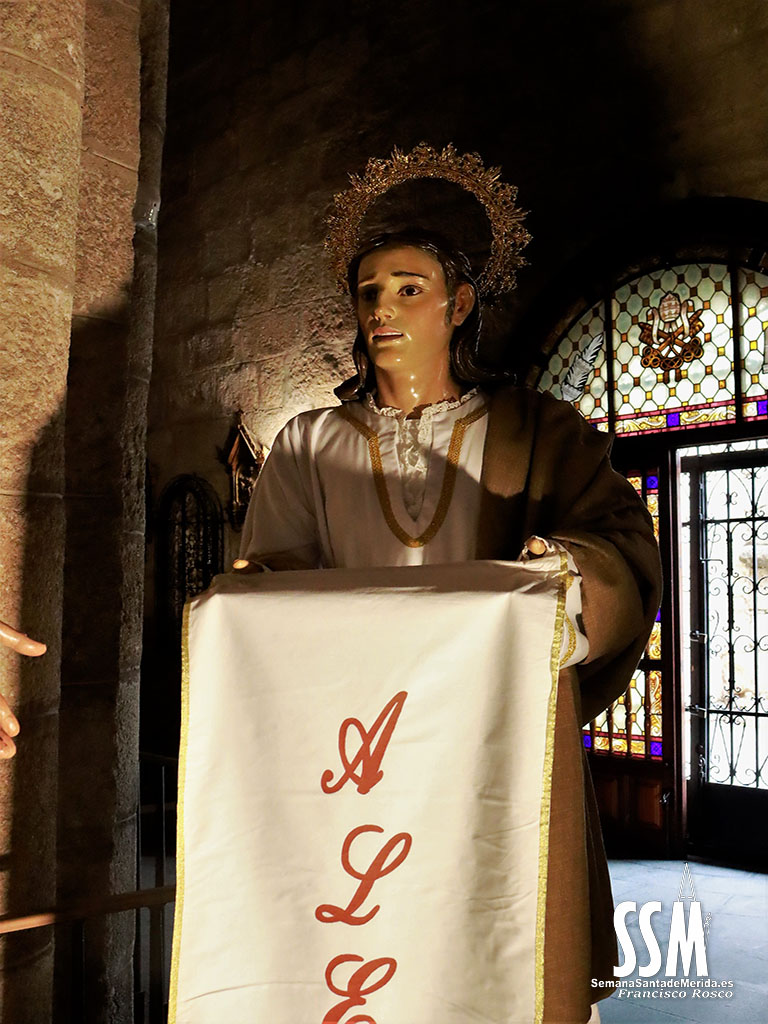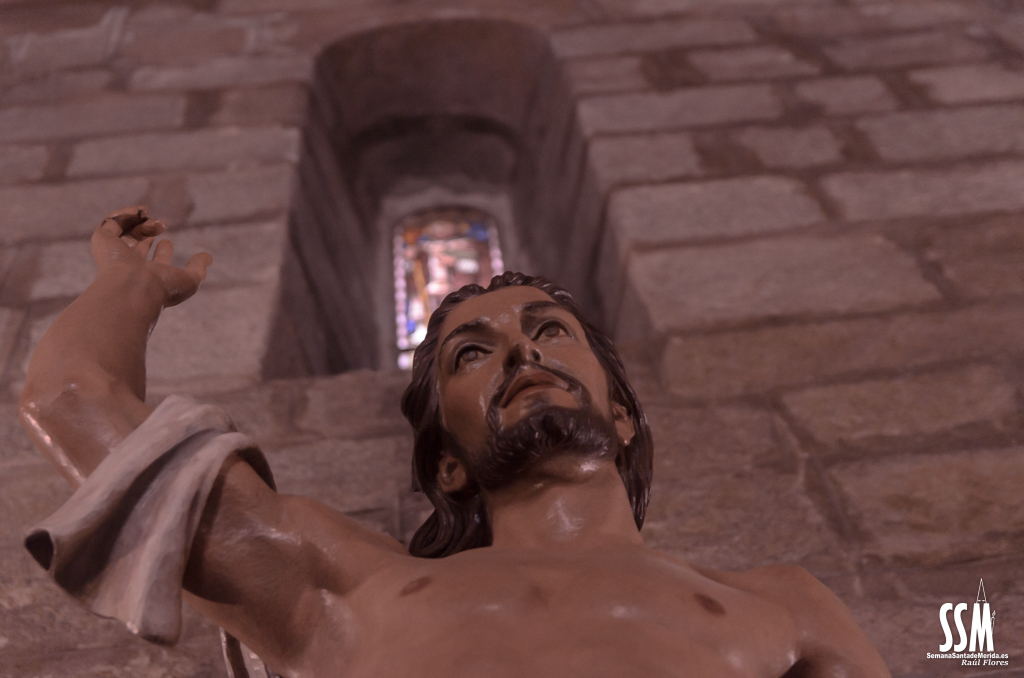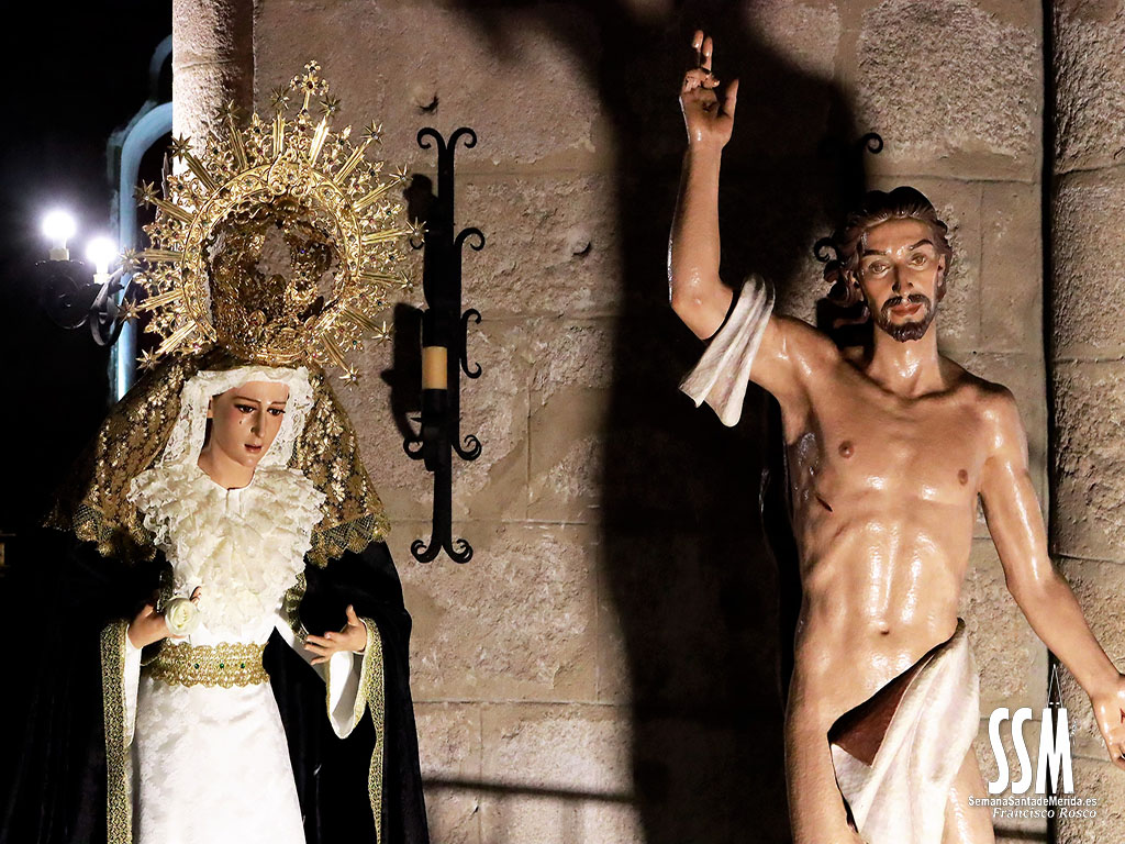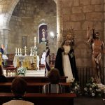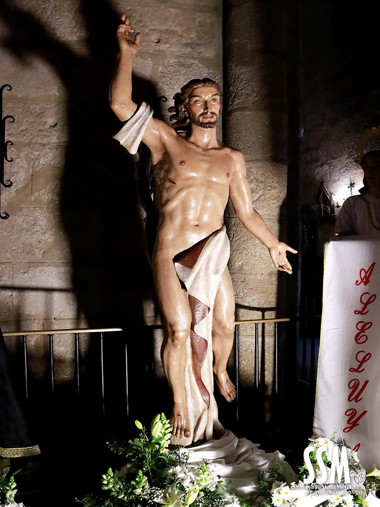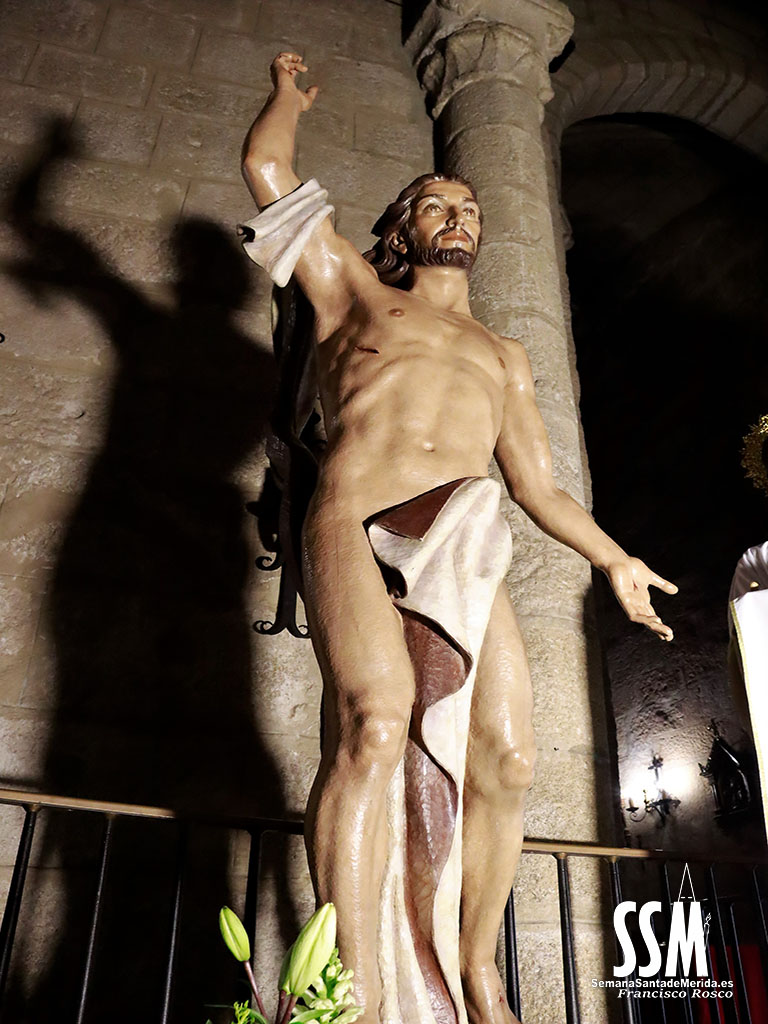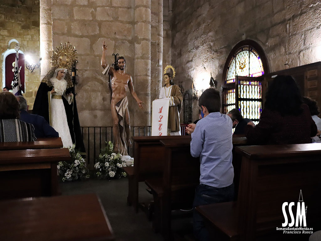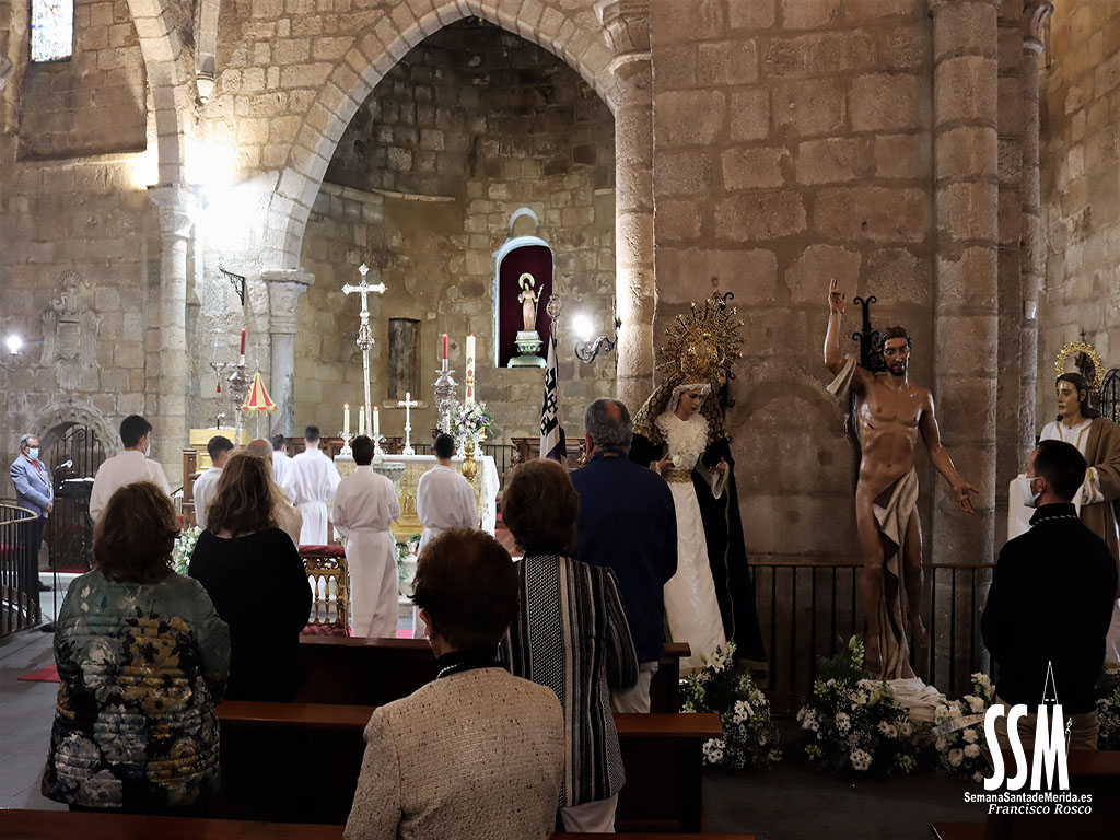 Y la certeza la encontrábamos en Santa Eulalia donde, nuevamente, San Juan ha anunciado la buena nueva y la Virgen del Mayor Dolor se ha encontrado con Jesús Resucitado. Una bellísima estampa que, junto al Altar Mayor, nos encontrábamos nada más entrar en la Basílica. Los colores rojo, verde y morado daban paso al blanco de la Resurrección.