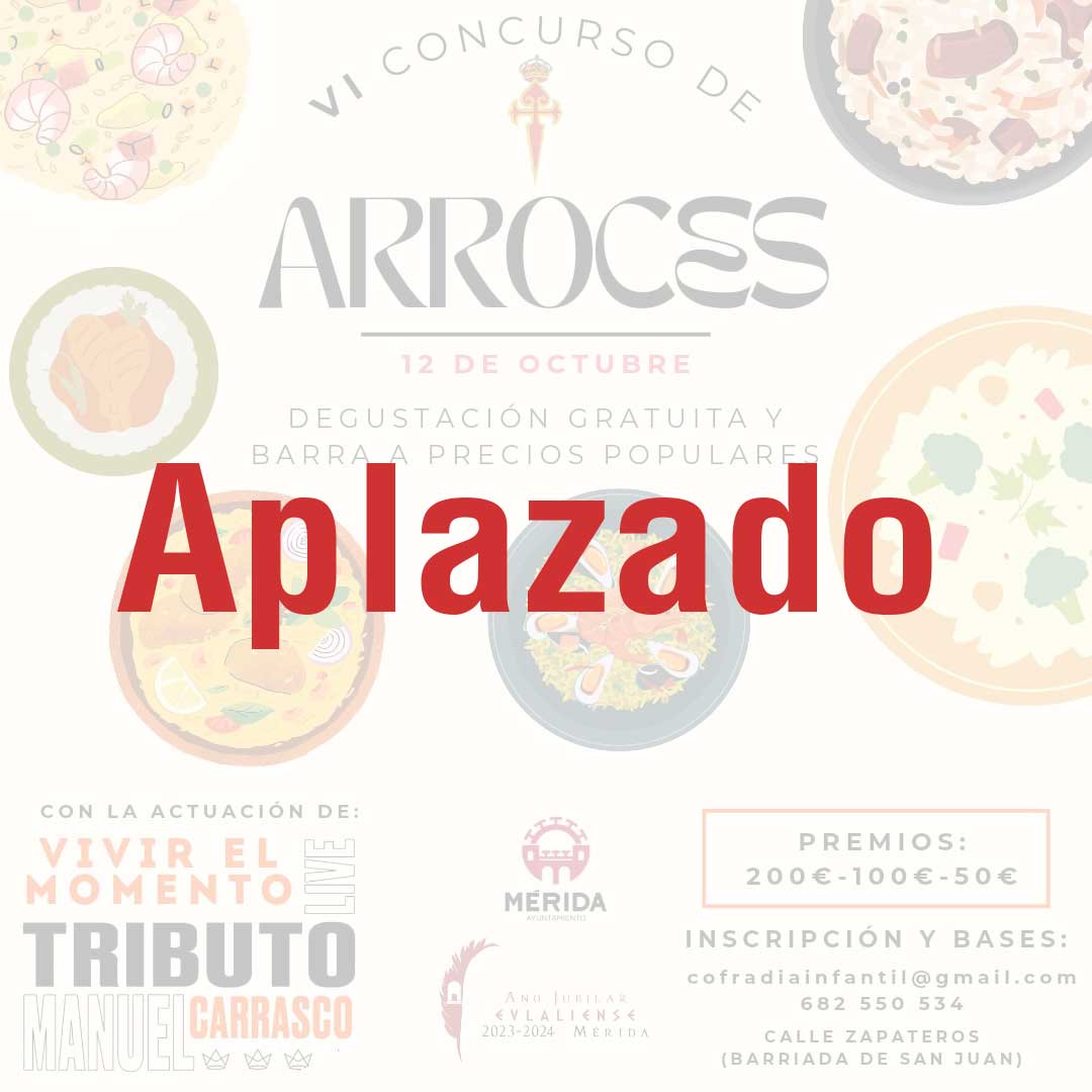 Ante las previsiones meteorológicas para este sábado, 12 de octubre, la Real Hermandad y Cofradía Infantil ha decidido aplazar la celebración del VI concurso de arroces al sábado 15 de marzo de 2025, segundo sábado de Cuaresma, coincidiendo con su convivencia solidaria “La Revirá”