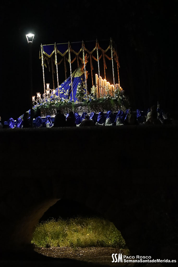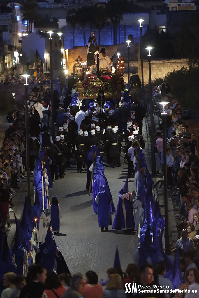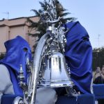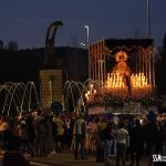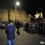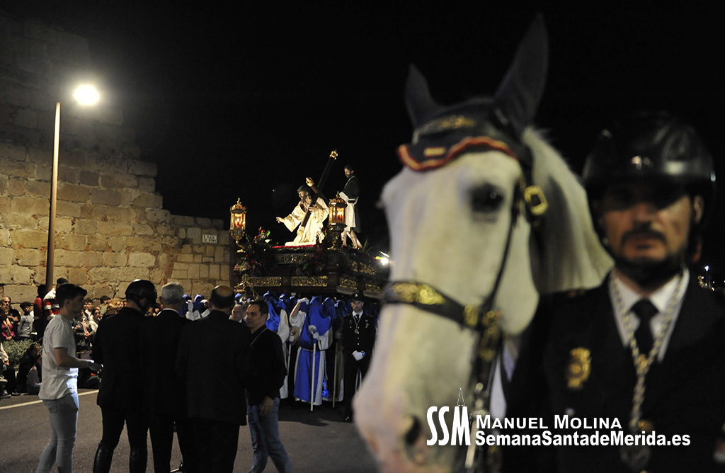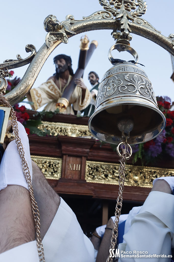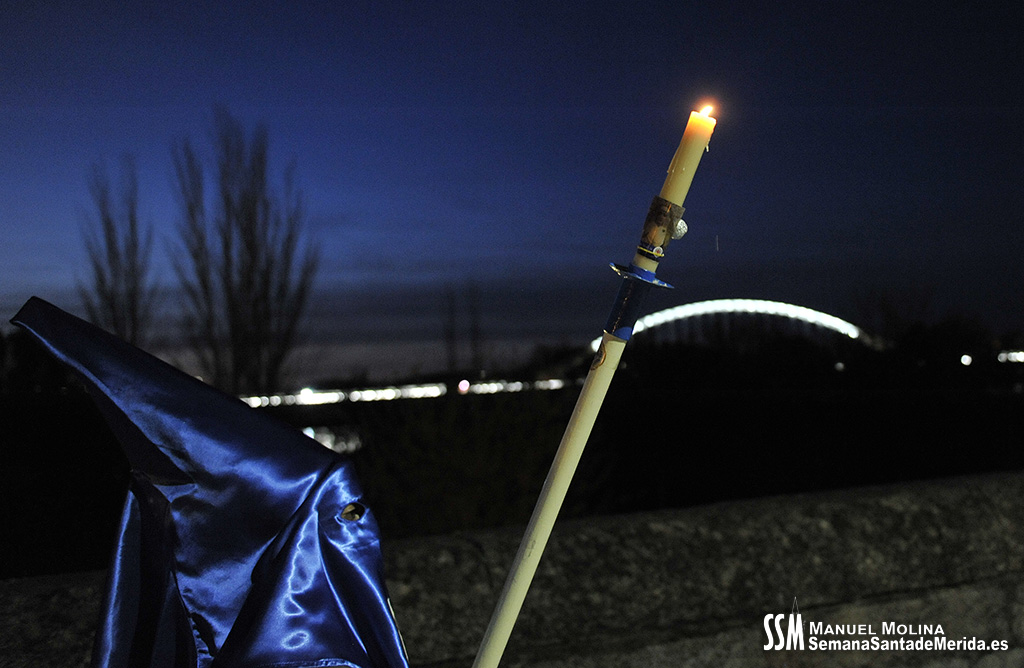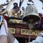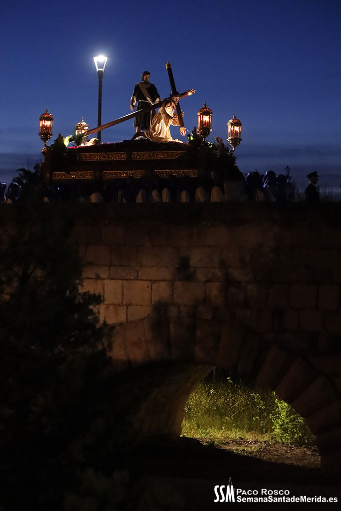 Así, mientras va sonando la melodía, llega el sonido, suave pero contundente, de la campana del trono sobre el que procesiona el Cristo de las Tres Caídas que, ayudado por su cirineo, golpea su rodilla en el último tramo del puente romano.