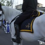 La composición músical de Tres Caídas tiene sus primeros compases con la alegría de los más pequeños en la tarde luminosa del Miércoles Santo y va cogiendo brío con los cascos de los caballos de la Policía Nacional golpeando contra el adoquinado del puente romano.
