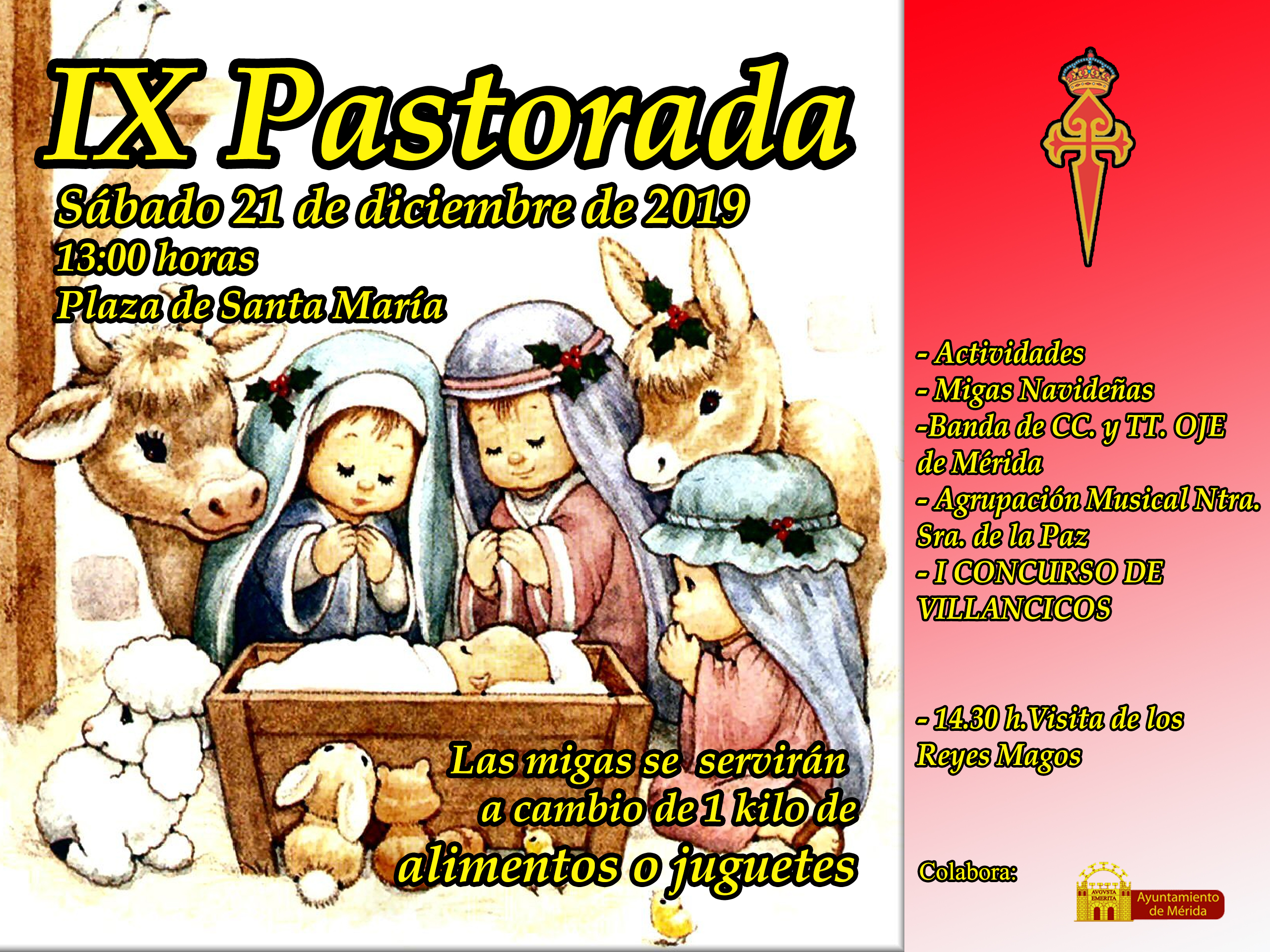 Por otro lado, habrá migas que se servirán a cambio de un kilo de alimentos como se viene haciendo desde el primer año o, si se prefiere, un juguete que se depositarán en el Belén que se ubicará en la Concatedral. Desde la Hermandad se invita a todos los emeritenses a esta actividad y, a los más pequeños, a que acudan vestidos de pastores o de los personajes que han representado en las fiestas del colegio.