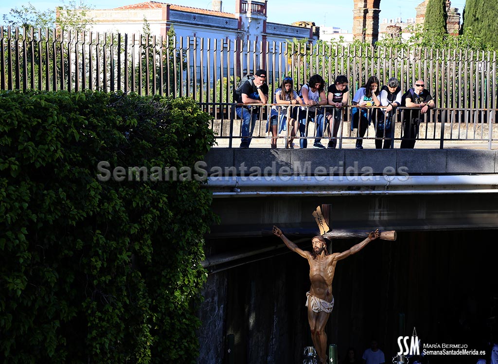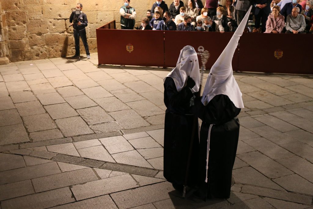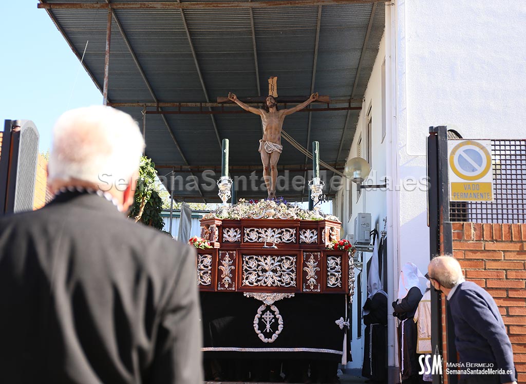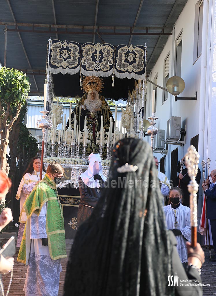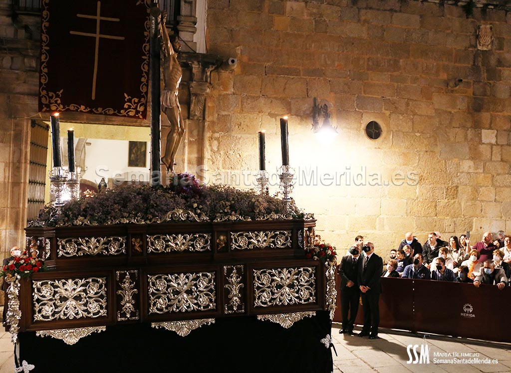 El palio avanza mientras escuchamos cantar “Dios te salve María, llena eres de gracia” y la Vera Cruz pone fin a su estación de penitencia, con un exquisito discurrir por las calles de Mérida. Una vez dentro, se escucha una voz: “Adiós, madre mía. Hasta el año que viene”.