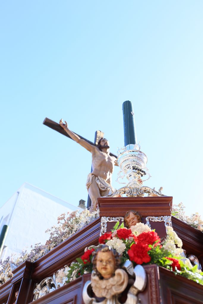 Cuanto el Señor de la Sindicales asomó por la puerta, afloraron las lágrimas en algunos de los allí presente. Con un exorno florar sencillo y con mucho gusto, un monte de brezo y a sus pies rosas rojas. La plata del impresionante trono, destalla con la luz del sol. Pero lo más impresionante es su mirada al cielo. La mirada de un último suspiro, pues hasta de lejos se puede escuchar como sale de su boca: «Señor, perdónalos porque no saben lo que hacen».