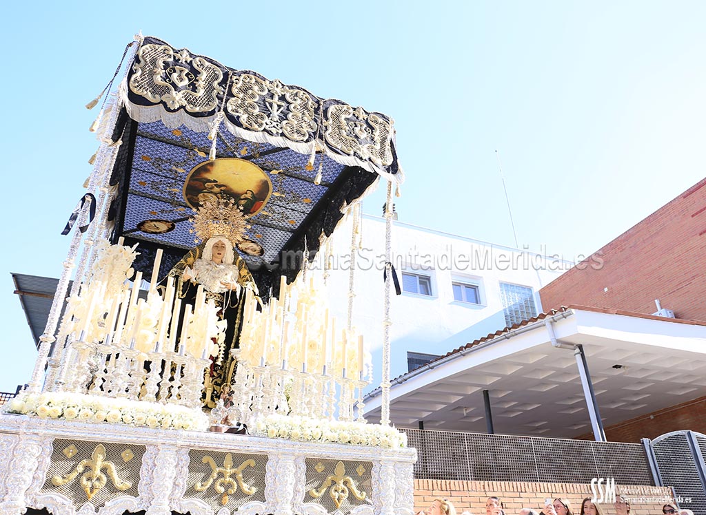 Acompañada por un par de acólitos y sus correspondientes madrinas, llegó el turno de la bella Nazaret. Con sus primeros andares se planta frente al barrio para deslumbrar con sus ojos verdes, los ojos verdes de Mérida y este año estrenando parihuela y un impresionante techo de palio de encaje, que deja entrar, – a esta hora de la tarde -, la luz del sol.