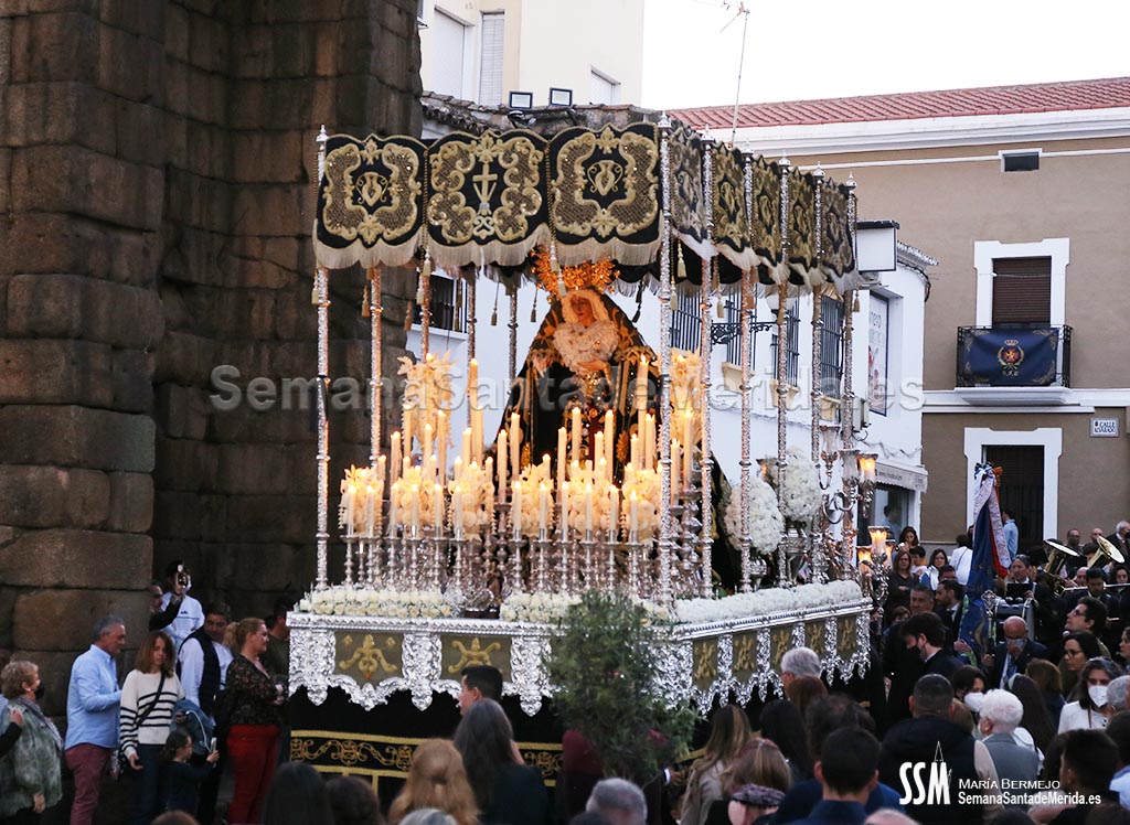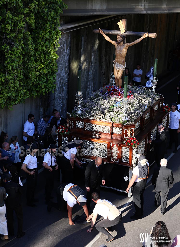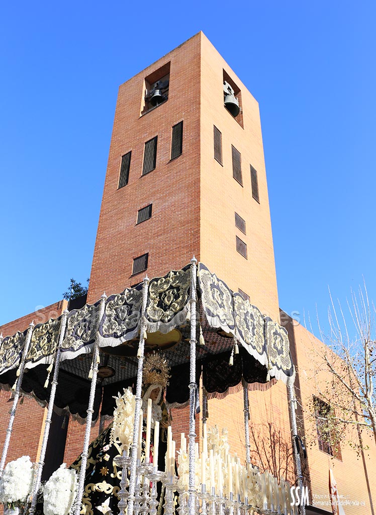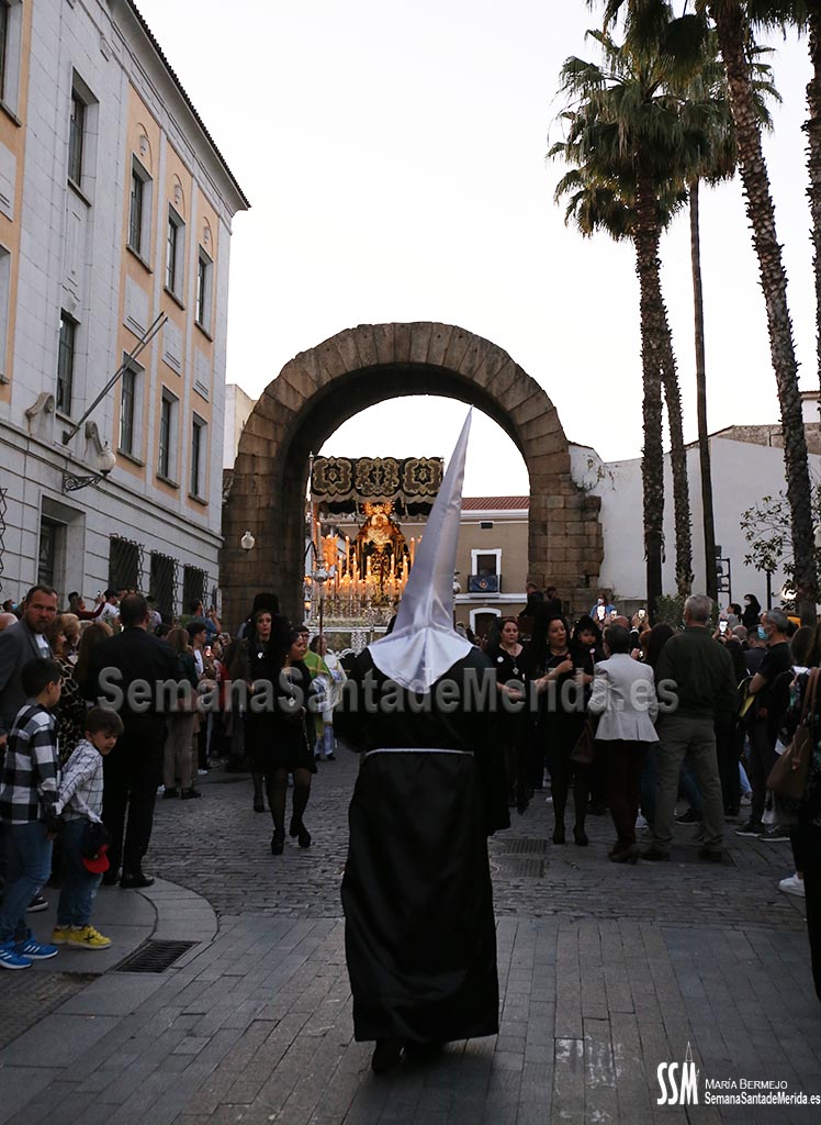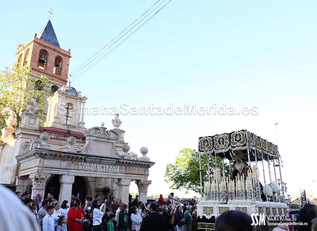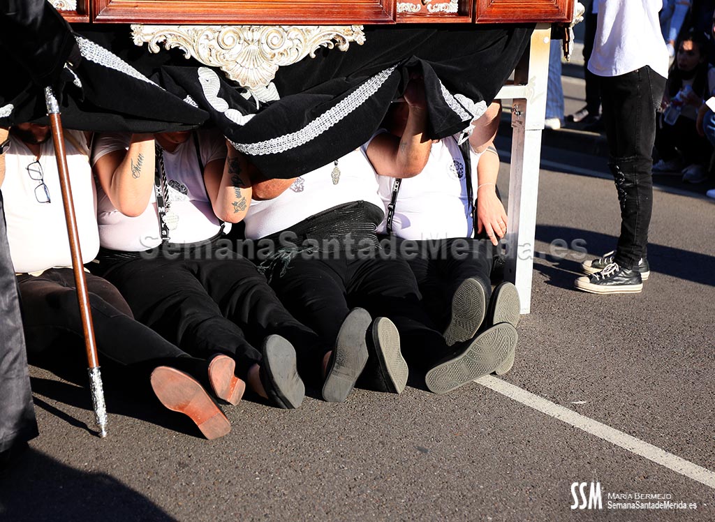 Mario Hernández fue el encargado de hacer la levantá del palio en las puertas de Santa María, así se lo pidió Mora, el capataz: “Al emeritense que más quiere a la Señora de los ojos verdes” y la hermandad continuó su catequesis plástica por carrera oficial para emprender el camino de vuelta.