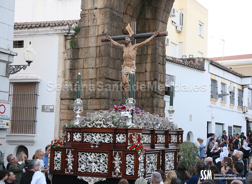 Con una puntualidad exquisita, pues la Vera Cruz en este 2022 va marcando el paso la tarde/noche del jueves santo en Mérida, llega a un Hornito abarrotado, y entre aplausos, la Franciscana Hermandad avanza por la Avda. De Extremadura, hacia un nuevo discurrir por el majestuoso Arco de Trajano.