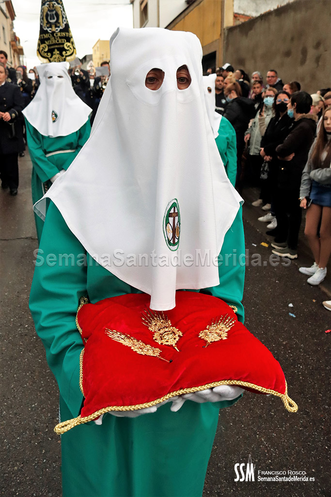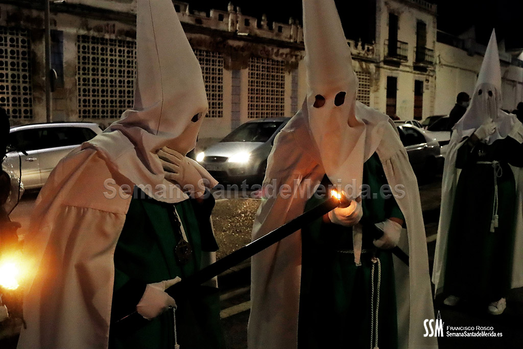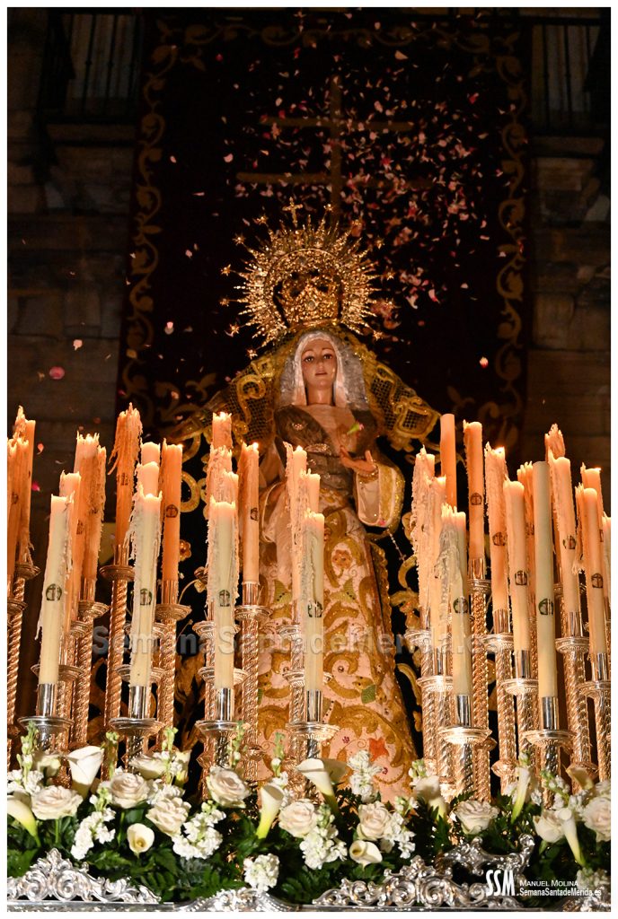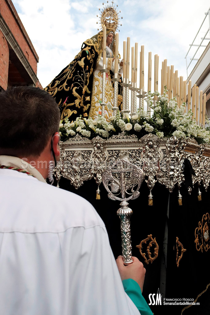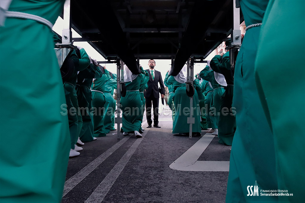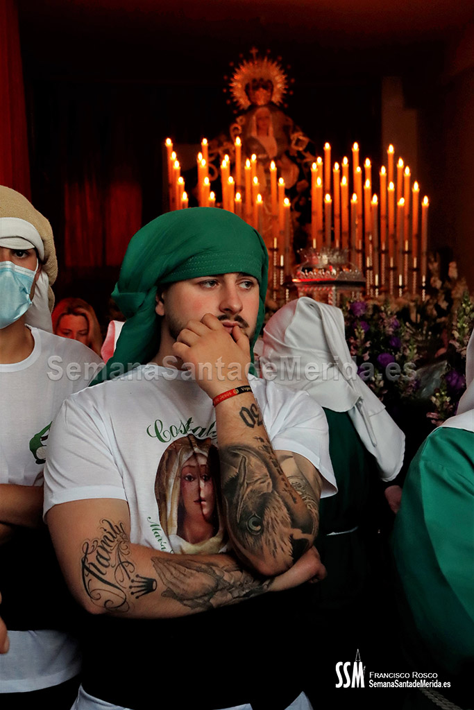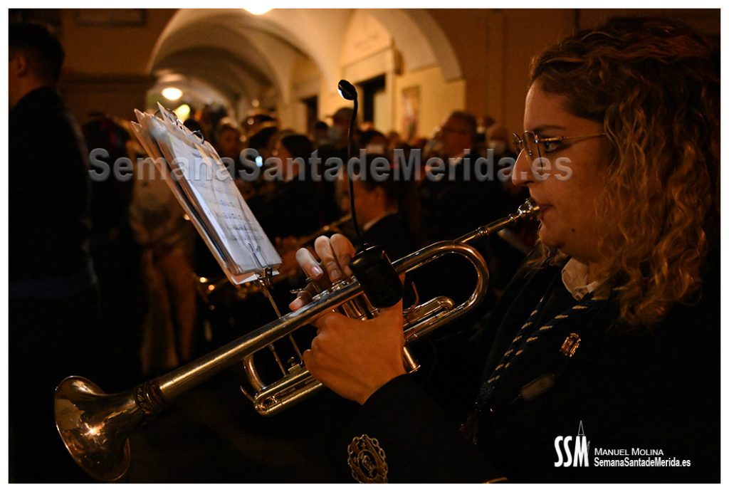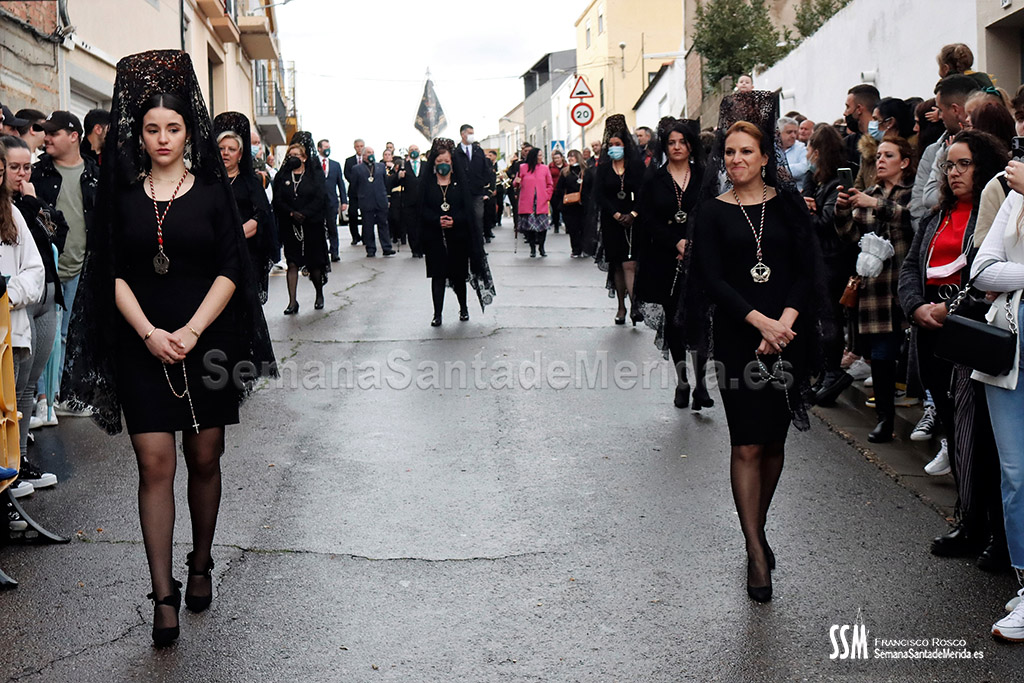 María Santísima de las Lágrimas, por su parte, salía a la calle por primera vez tras su restauración llevada a cabo en el pasado año, y desde atrás se encargaba de velar por todos los allí presentes, acompañada por la Agrupación Musical Nuestra Señora de la Paz de Mérida.