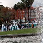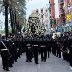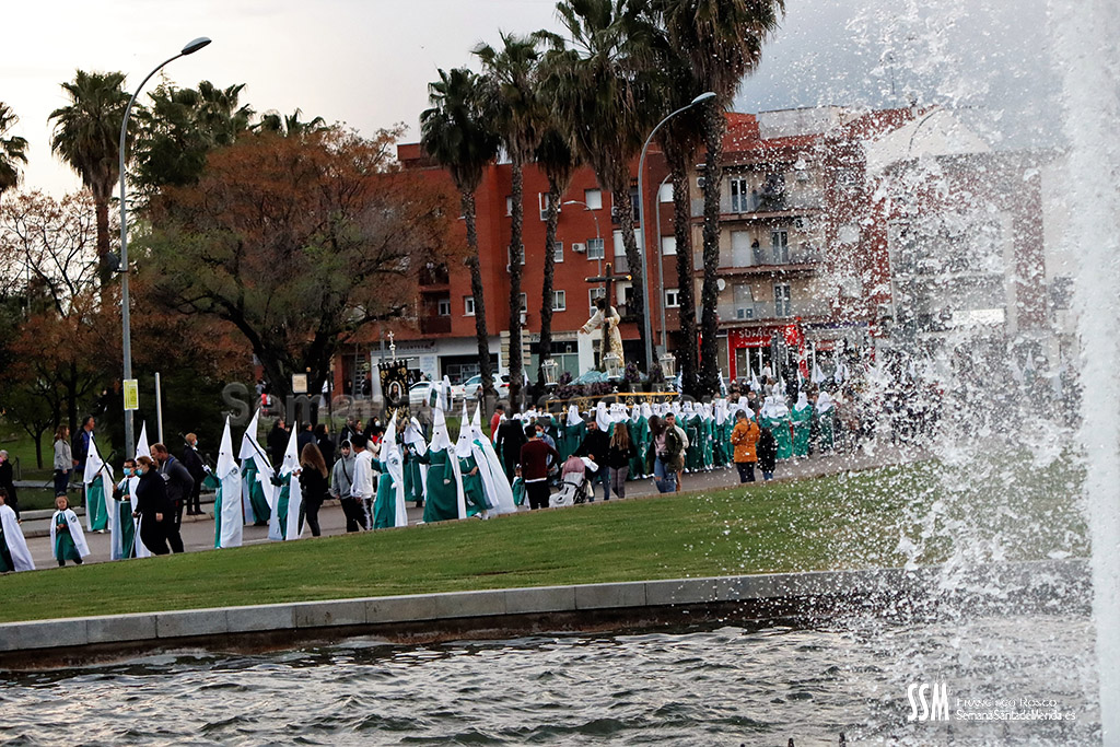 Con un paso más acelerado de lo habitual, puesto que la lluvia no paraba de amenazar, la cruz de guía comenzaba a dejar calles de San Juan atrás hasta comenzar la larga avenida Juan Carlos I. Sin embargo, al llegar al centro de la ciudad, decidieron recortar el recorrido, debido al retraso que llevaba la procesión, por lo que el Templo de Diana no pudo disfrutar de las dos imágenes de esta cofradía, ya que recortaron por Santa Eulalia.