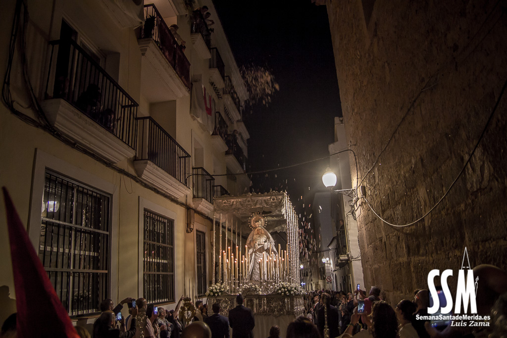 Y a su vez, saludar al tradicional balcón de doña Bati, en la confitería Gutiérrez, mecenas de la hermandad y cuya parada frente a su escaparate comprende uno de los momentos más anecdóticos de la Semana Santa emeritense, donde pasión y devoción se unen en un tradicional gesto de reconocimiento. Especialmente bella fue la revirá junto al Ayuntamiento que realizaron los costaleros de Nuestra Señora del Rosario con la música envolvente de la banda de Nuestra Señora de Guaditoca, de Guadalcanal, Sevilla. Quien iba regalando notas de música por cada esquina y que representa uno de los grandes atractivos de este Lunes Santo. La hermandad volvió a escoger calles del centro de la ciudad que representan dificultades añadidas para el cuerpo de costaleros y capataces, por su estrechez y por la complicación en los giros. Pero que, sin duda, dotan a esta estación de penitencia de una belleza sin igual. Especialmente emotivo fue el recorrido de Jesús de Medinaceli, Satísimo Cristo de las Injurias y Nuestra Señora del Rosario, por la calle Concepción, donde la titular de la hermandad recibió una petalada que conmovió a todos los asistentes. Con paso sereno, sin prisas y siguiendo el compás de las bandas de música protagonistas, la cofradía volvió a pasear por la estrecha calle Berzocana, donde los varales del paso de palio casi rozan con los balcones, y donde el esfuerzo de los costaleros se sintió en la respiración de los cientos de asistentes que allí esperaban a la cofradía.