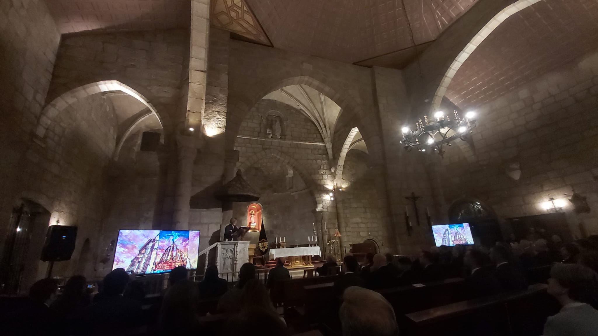En ese momento, en las dos grandes pantallas dispuestas a ambos lados del presbiterio, apareció la imagen del Papa Francisco que, mirando fijamente al público dijo «Buenas noches cofrades de Mérida, buenas noches emeritenses». Momento en el que un silencio sepulcral recorrió la Basílica y todas las miradas, muchas de ellas llorosas, se clavaron en las pantallas y, por supuesto, con la reacción habitual de subir los móviles y captar el momento.