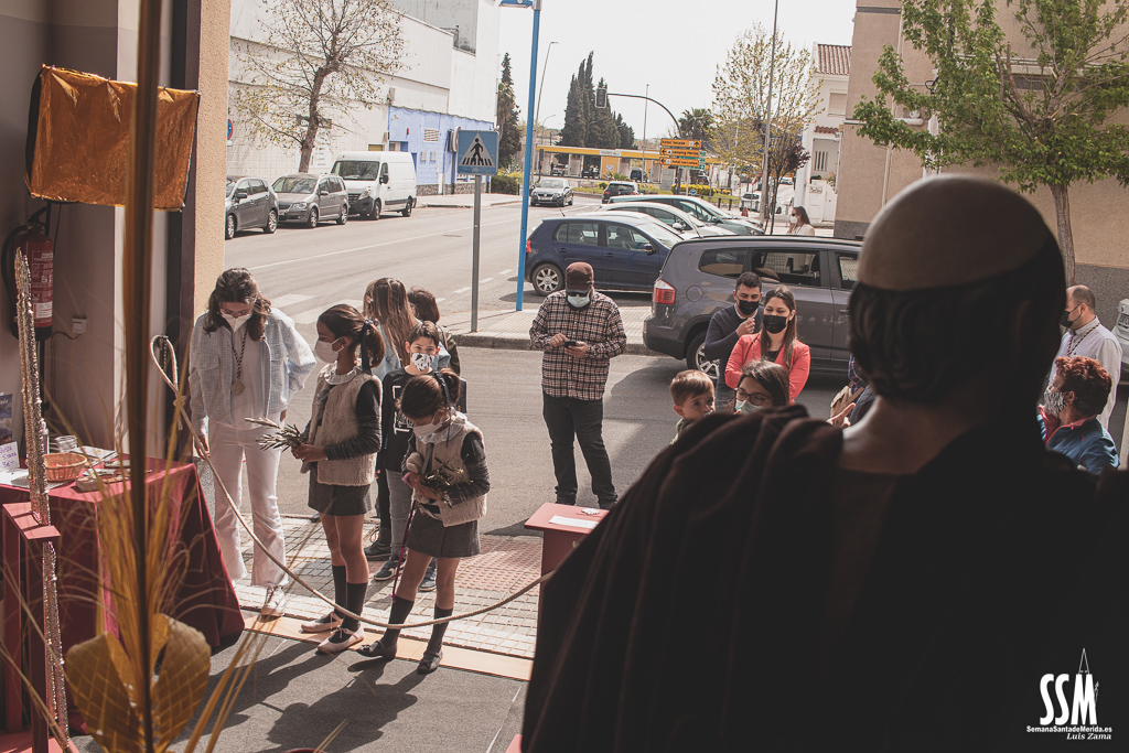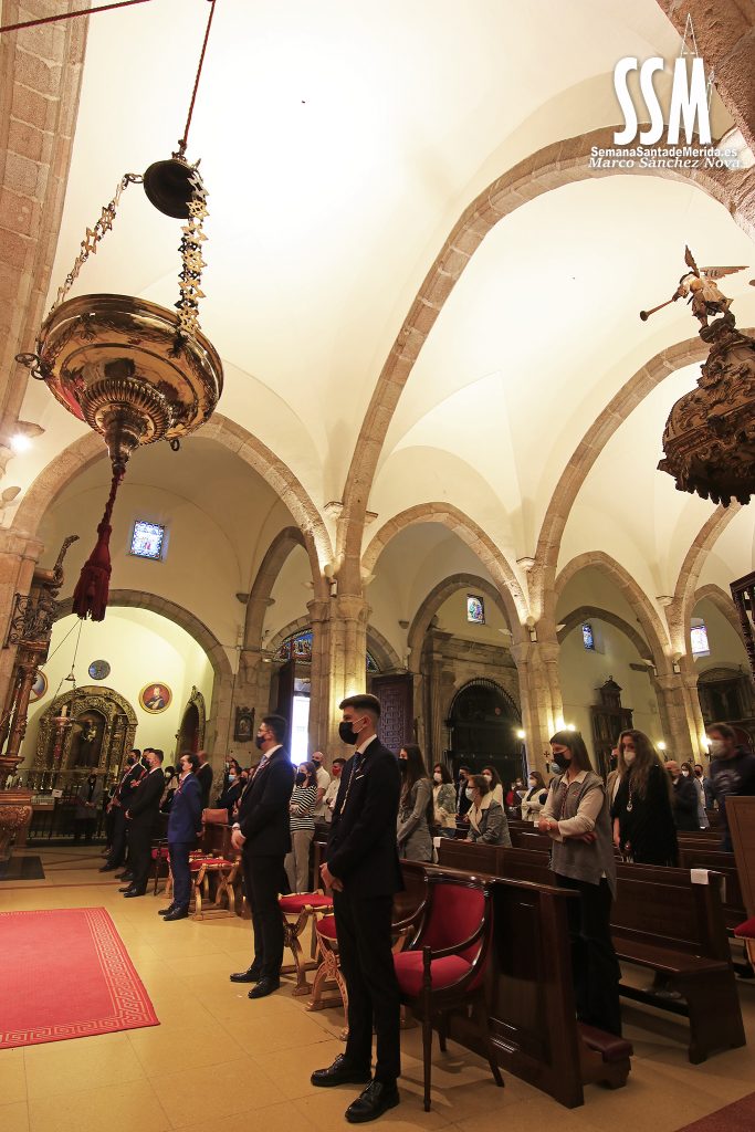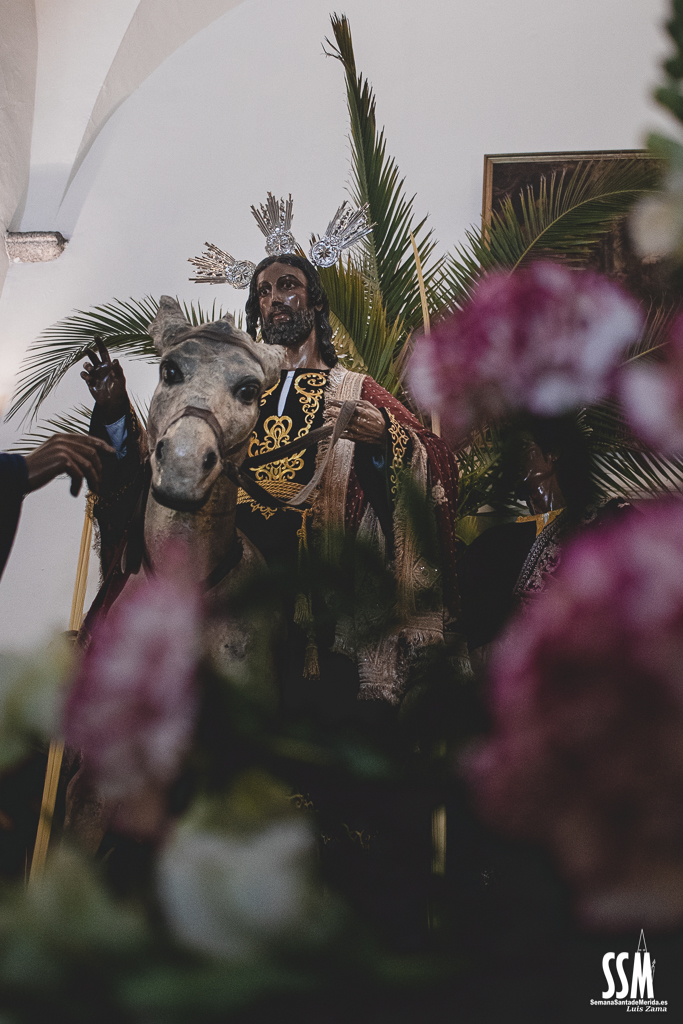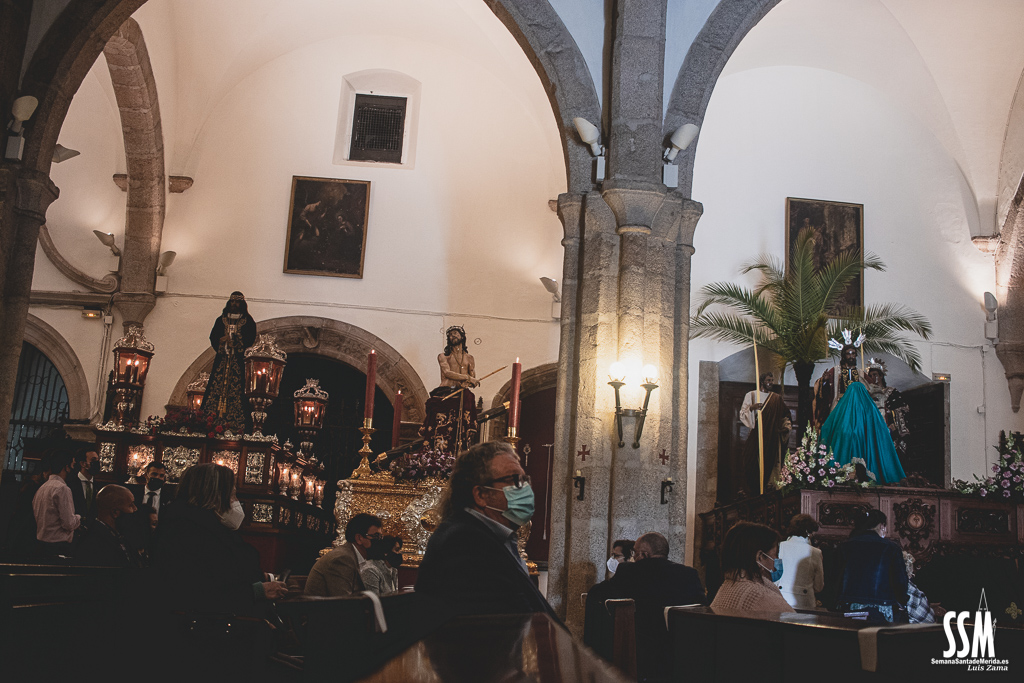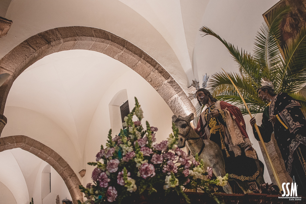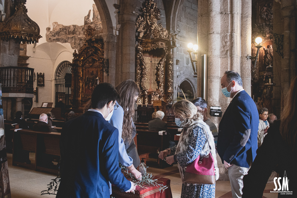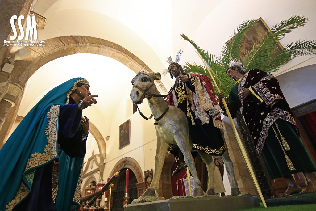 La puerta de la concatedral de Santa María estaba abierta de par en par a las diez de la mañana. Buena temperatura. Soplaba una brisa, melancólica. Pero bajo el dintel de la parroquia esperaba la Junta de Gobierno para recibir a todos los cofrades emeritenses. Hoy se abrían las puertas de la concatedral para que nadie saliera de ella, sino para que todos entrásemos. No se abría para que luciera su Cruz de Guía rodeada de la algarabía de los niños y niñas de la ciudad ondeando sus palmas. Se abría para que las palmas y la algarabía  del Domingo de Ramos se viviera dentro de la iglesia. La hermandad le ha dado la vuelta al Domingo de Ramos y lo ha convertido en un momento irrepetible. Y aunque muchos dirán que se ha hecho a la fuerza, obligado por las circunstancias, este momento de vida en hermandad compartida es algo casi histórico. Su iglesia hoy ha sido la nuestra. Su templo, ese que les aguarda en noches de toque de queda casi en silencio y en intimidad, hoy ha sido la casa de todos. La generosidad de este Domingo de Ramos, donde hemos sido nosotros los que hemos entrado y no ha salido nazareno alguno, ha marcado el ritmo de los cientos de corazones que durante toda la jornada han recorrido con emoción cada baldosa de esta iglesia milenaria.