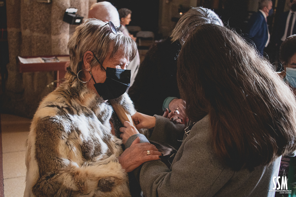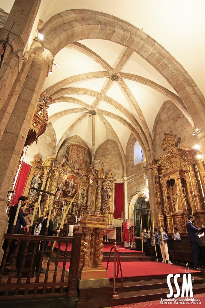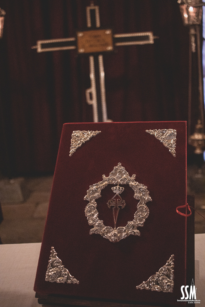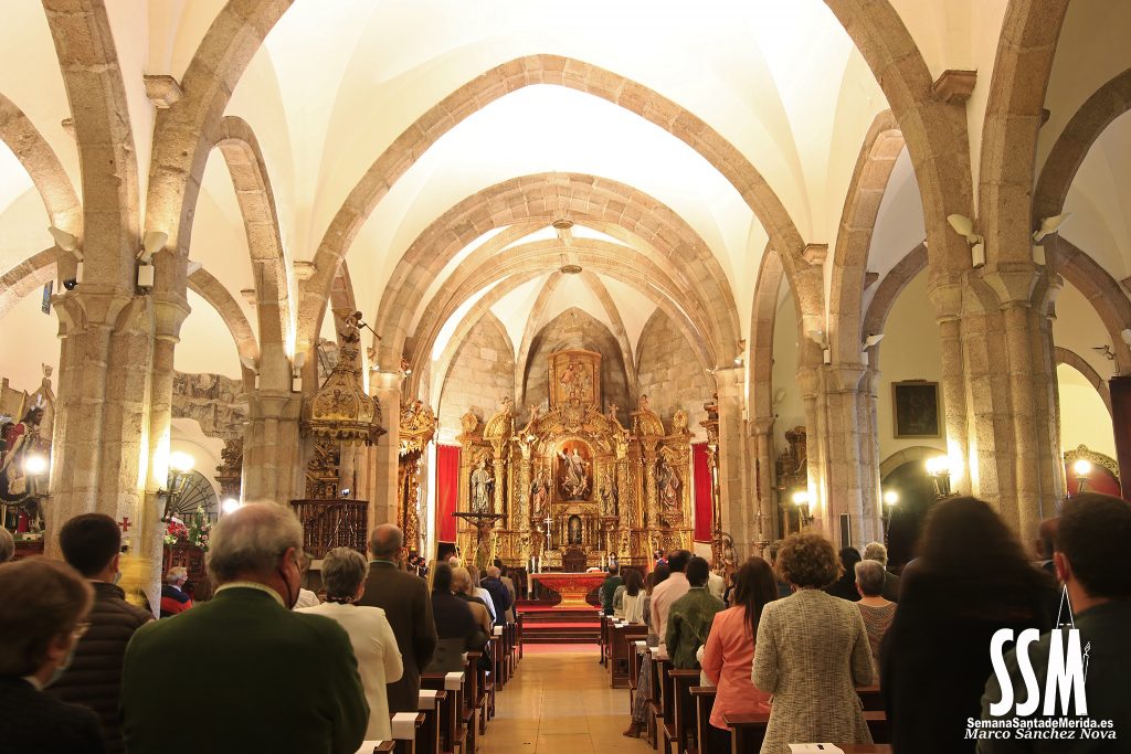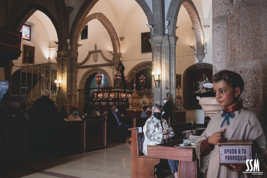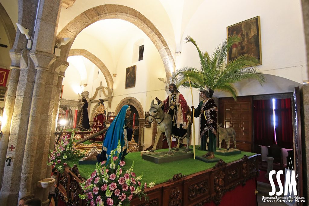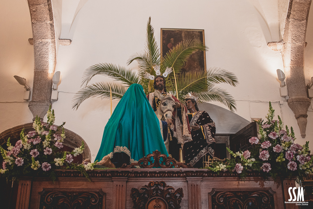 La puerta de la concatedral de Santa María estaba abierta de par en par a las diez de la mañana. Buena temperatura. Soplaba una brisa, melancólica. Pero bajo el dintel de la parroquia esperaba la Junta de Gobierno para recibir a todos los cofrades emeritenses. Hoy se abrían las puertas de la concatedral para que nadie saliera de ella, sino para que todos entrásemos. No se abría para que luciera su Cruz de Guía rodeada de la algarabía de los niños y niñas de la ciudad ondeando sus palmas. Se abría para que las palmas y la algarabía  del Domingo de Ramos se viviera dentro de la iglesia. La hermandad le ha dado la vuelta al Domingo de Ramos y lo ha convertido en un momento irrepetible. Y aunque muchos dirán que se ha hecho a la fuerza, obligado por las circunstancias, este momento de vida en hermandad compartida es algo casi histórico. Su iglesia hoy ha sido la nuestra. Su templo, ese que les aguarda en noches de toque de queda casi en silencio y en intimidad, hoy ha sido la casa de todos. La generosidad de este Domingo de Ramos, donde hemos sido nosotros los que hemos entrado y no ha salido nazareno alguno, ha marcado el ritmo de los cientos de corazones que durante toda la jornada han recorrido con emoción cada baldosa de esta iglesia milenaria.