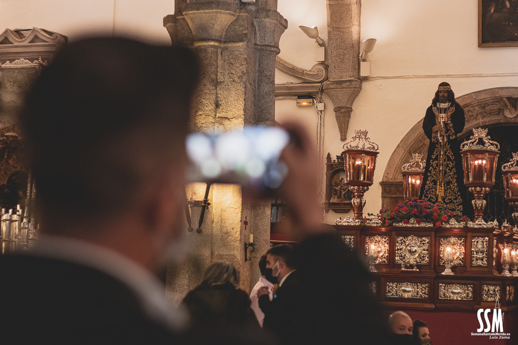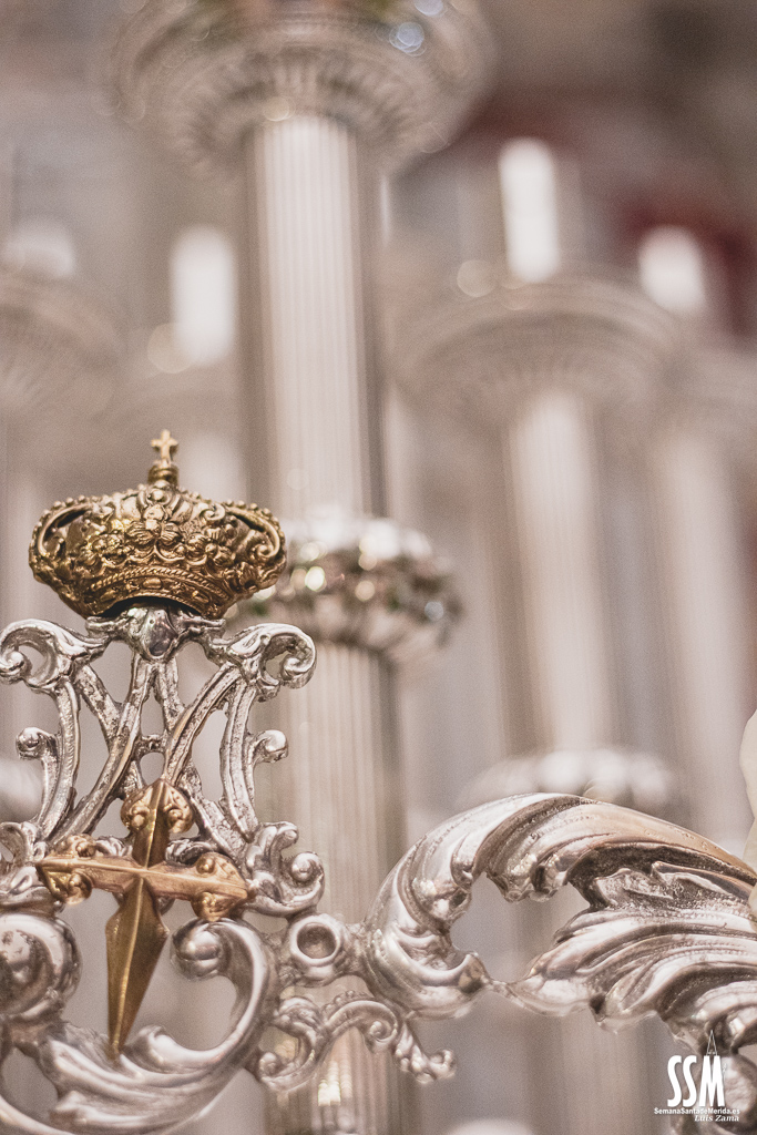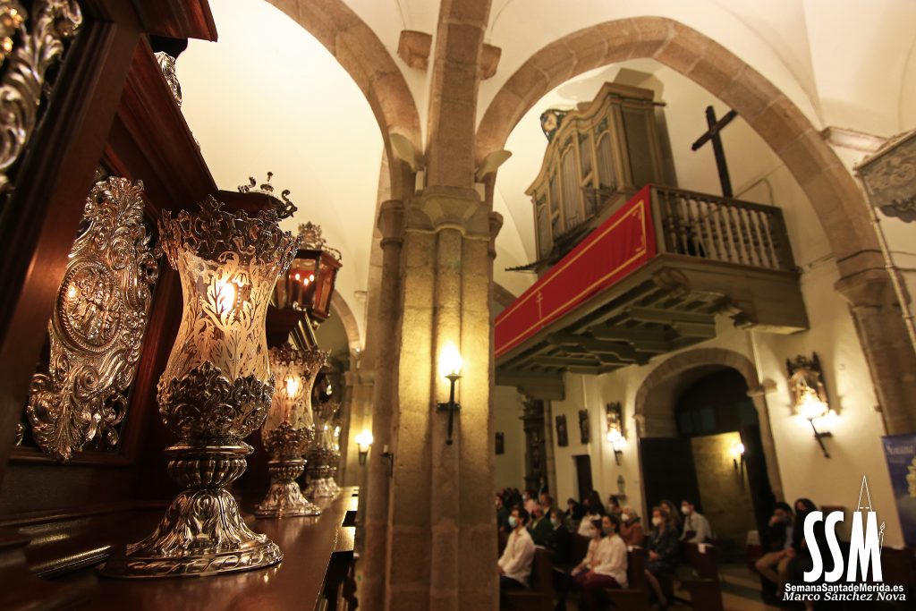 Frente a ella Medinaceli e Injurias. Impasibles. Reflexivos. Con su figura dispuesta frente a los fieles. Acongojan. Cierto halo de sufrimiento. Es momento para analizar todo lo que nos ha pasado en este año en “ruinas”, complejo, triste. En ellos vemos las caras de cada una de las personas que este virus se ha llevado por delante. En ellos se guarda el dolor de tantas familias emeritenses. En ellos descansan nuestras plegarias. En ellos confiamos nuestro dolor.