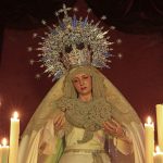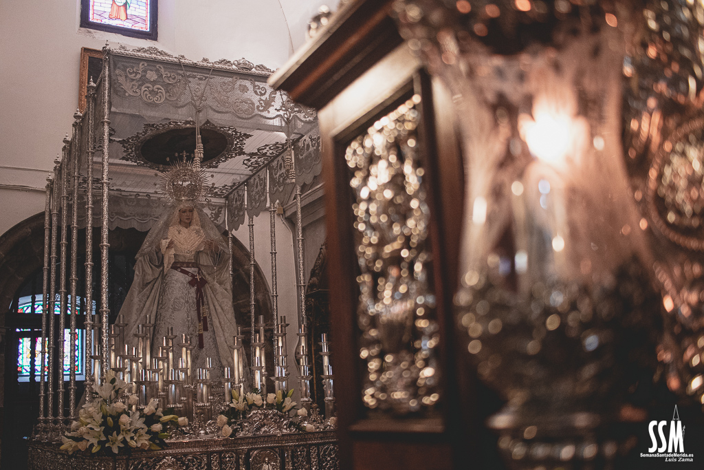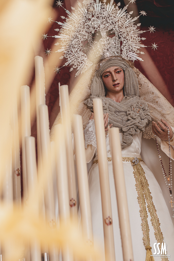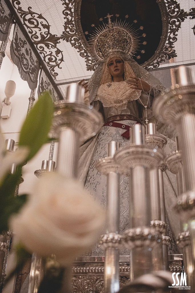 Es imposible mantener la mirada con Nuestra Señora del Rosario. Un hecho que, por cierto, te permitía vislumbrar su nueva saya, blanca y plateada, que la envolvía en un halo de magnificencia que te transportaba a los mejores rincones de su rachear por Mérida cada Lunes Santo.