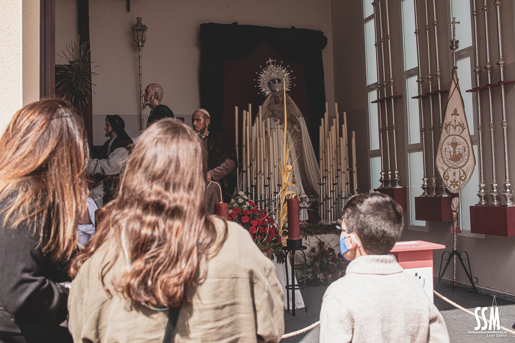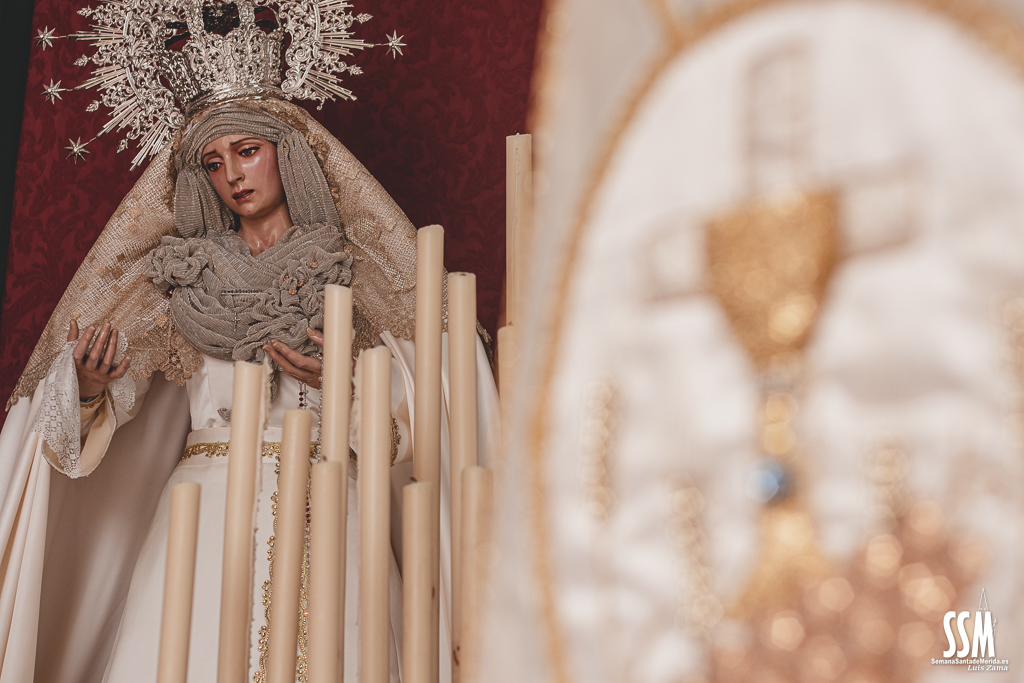 Un acierto de la Cofradía que consigue que en este Domingo de Ramos puedas estar más cerca que nunca de sus titulares, sentirlos. En una esquina, casi sin querer hacer ruido, se encuentra Nuestra Señora del Patrocinio. Como quien siente en sus manos la responsabilidad de llevar el peso de todos los que te rodean. Ella lleva el peso de tantos y tantos hermanos que confían en ella toda su vida. Ella, sin duda, en este complejo año de pandemia que llevamos vivido, ha soportado junto a sus cofrades el dolor que arrastramos por dentro. Y ella, allí situada en la Casa Hermandad, en este Domingo de Ramos único, mantiene la esperanza por un tiempo mejor.