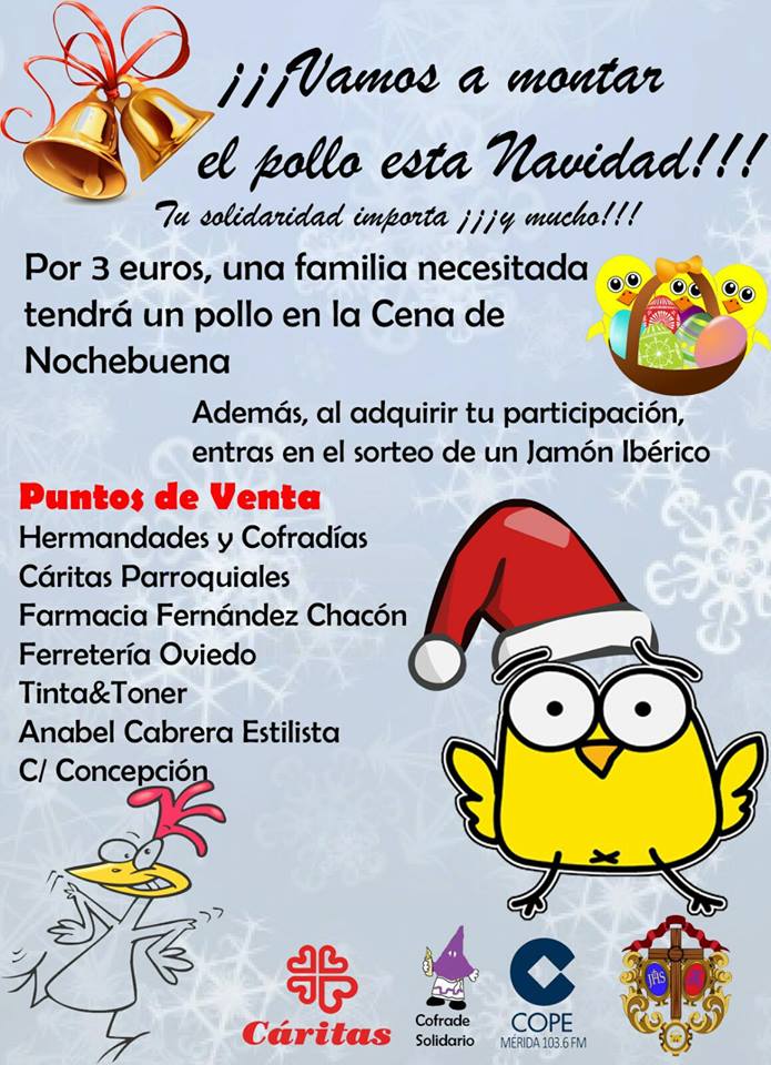 Como cada año, la Junta de Cofradías, el Cofrade Solidario, Cáritas Interparroquial y la Cadena Cope se unen para que, en la cena de Nochebuena, las familias necesitadas de Mérida tengan un pollo en su mesa. Con una colaboración de 3 euros, se compra un pollo y, además, el donante, tiene opción a poder ganar un jamón ibérico.