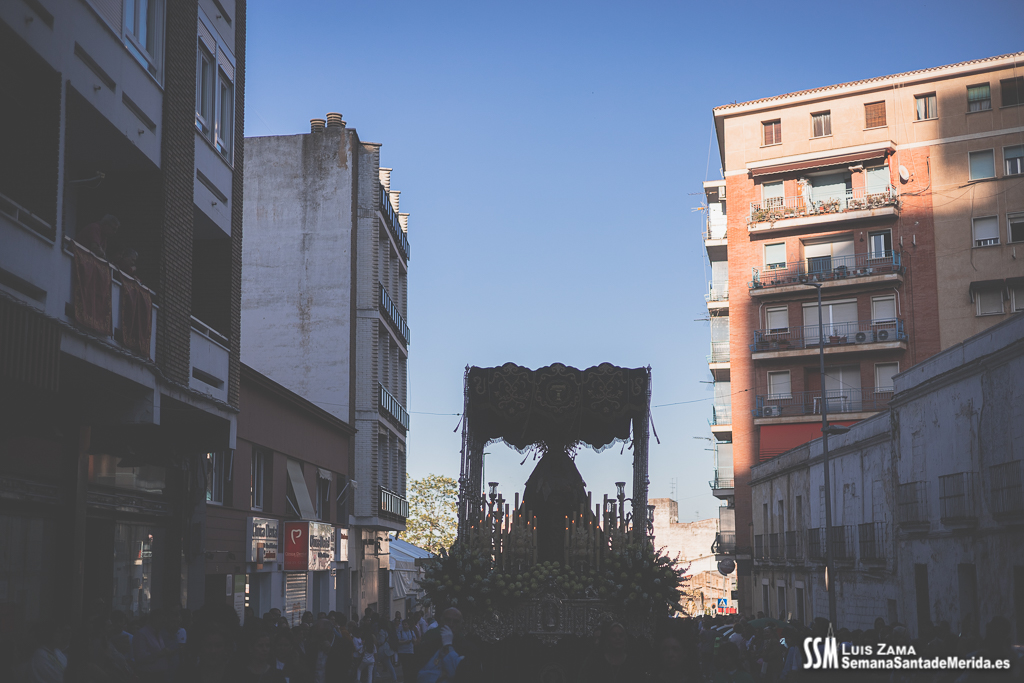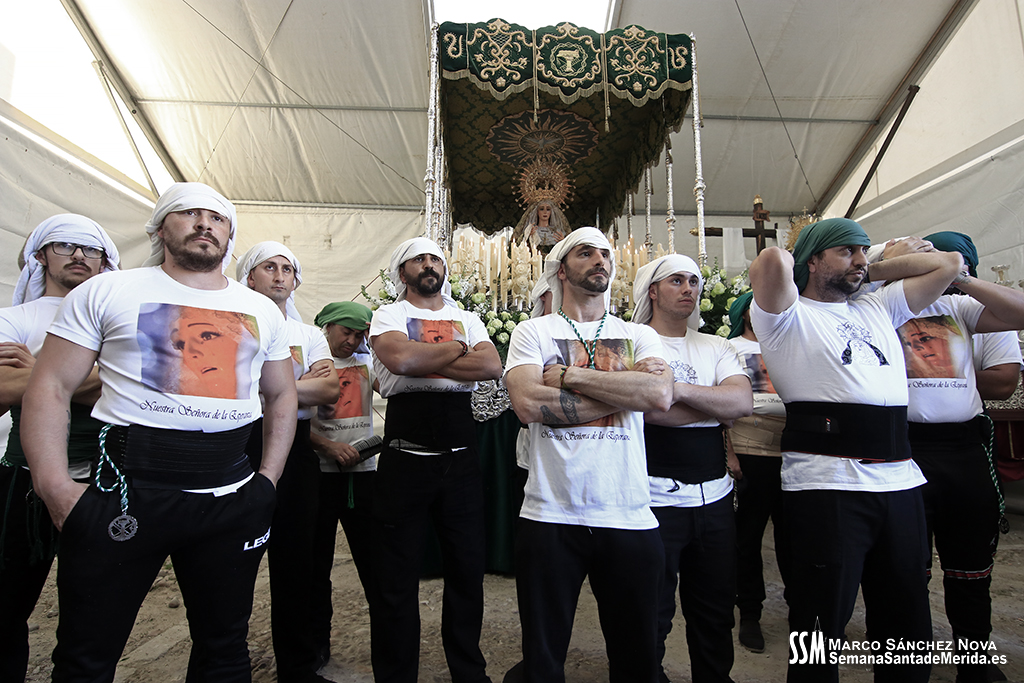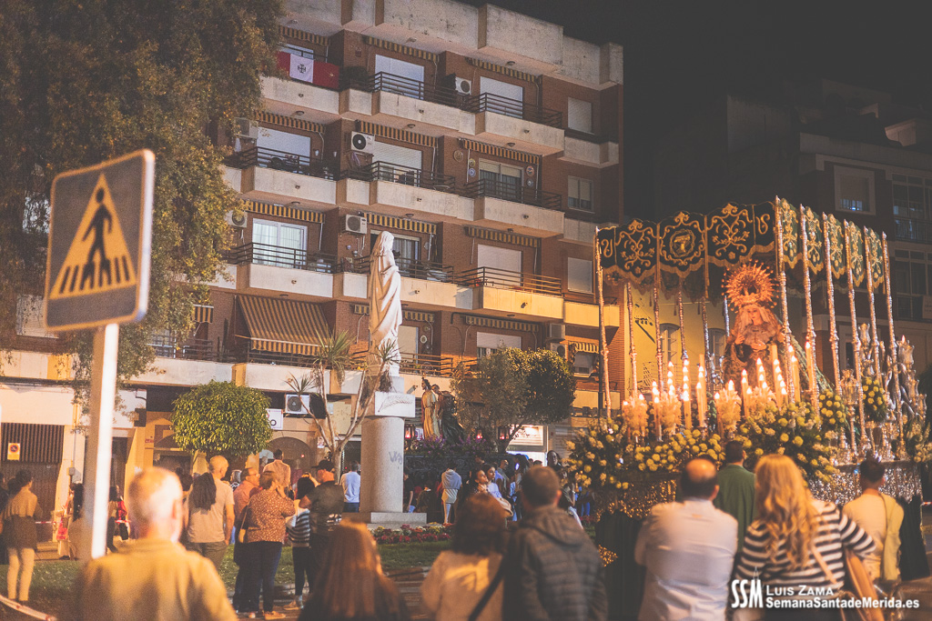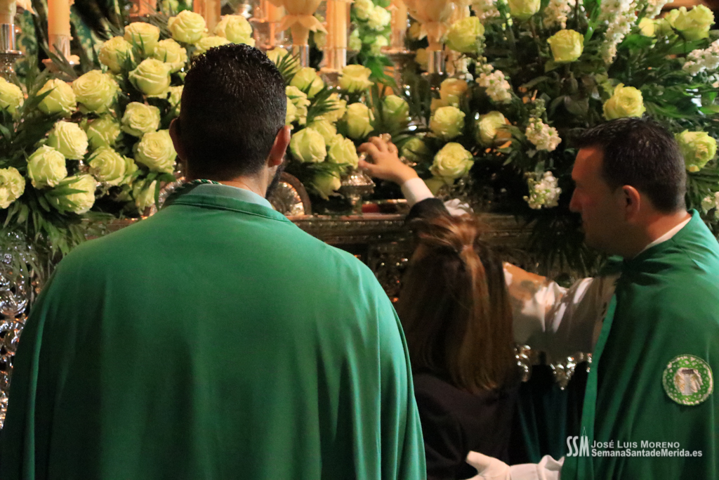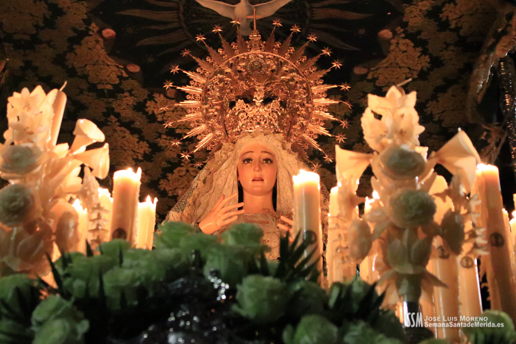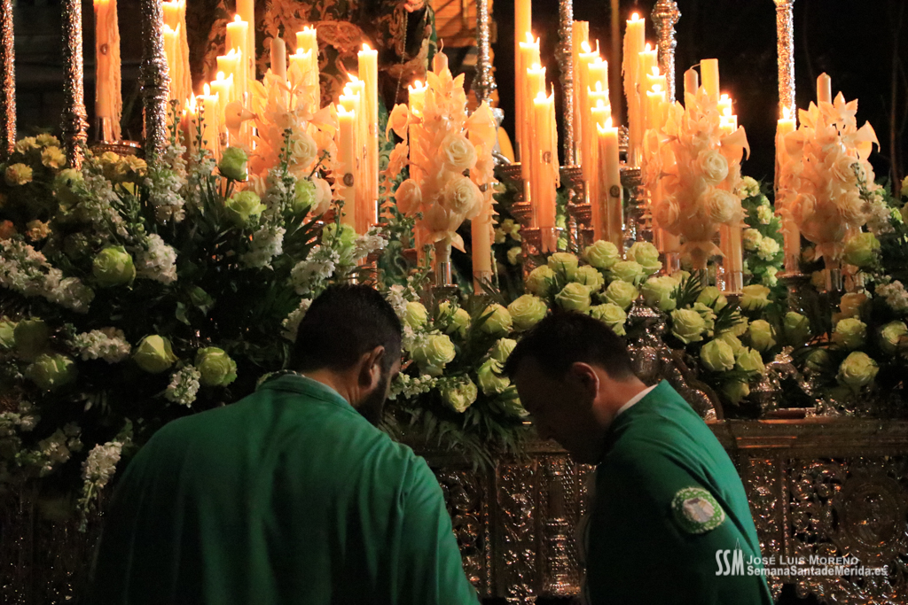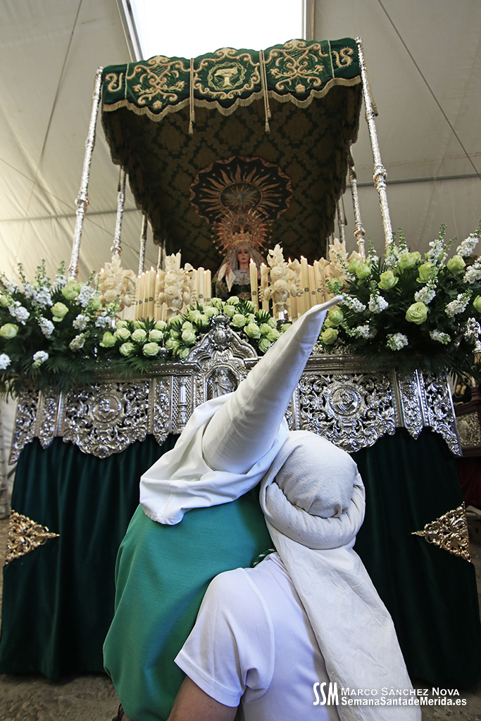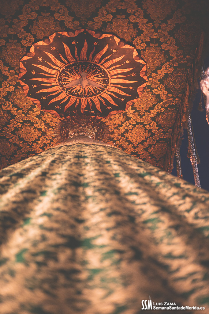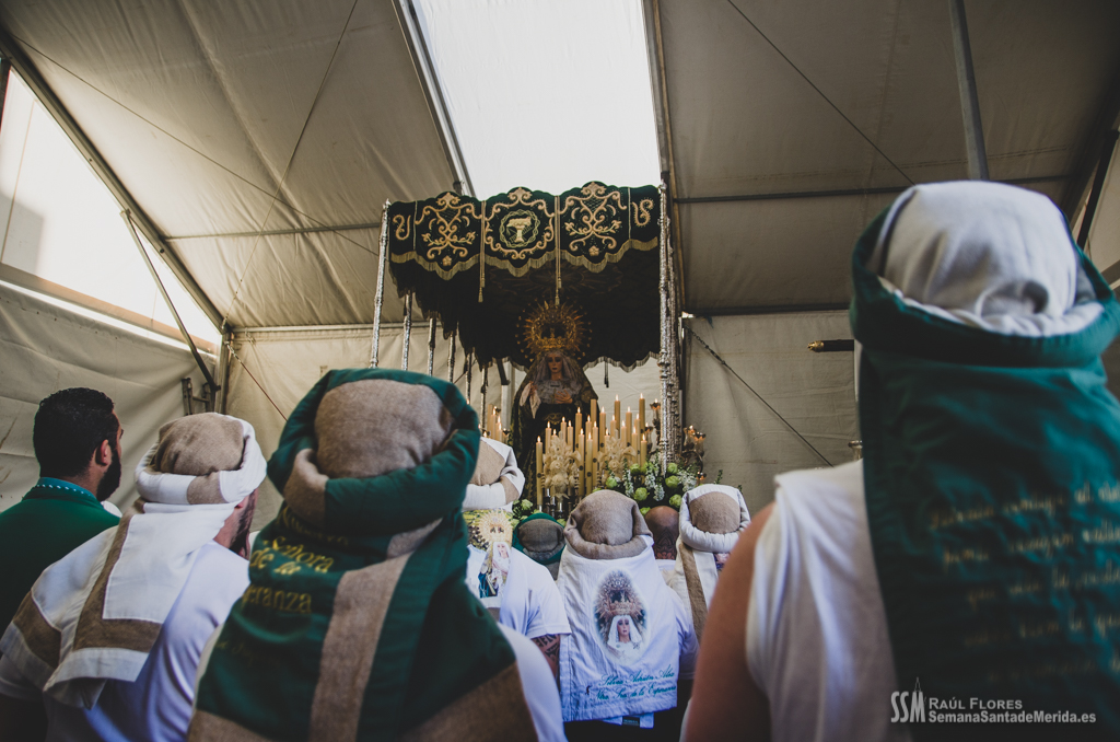 Sus costaleros la llevan en volandas, como si fuese levitando en el aire, ella los cubre con su manto y los protege, como una madre protege a su hijo. Todo fruto del trabajo y esfuerzo de sus costaleros y capataces, horas de ensayo y de falta de sueño para poder realizar el buen trabajo, mañana otra vez la sacaran a la calle, pero será como si no la hubiesen paseado el día anterior por las calles de la vieja Emérita Augusta.