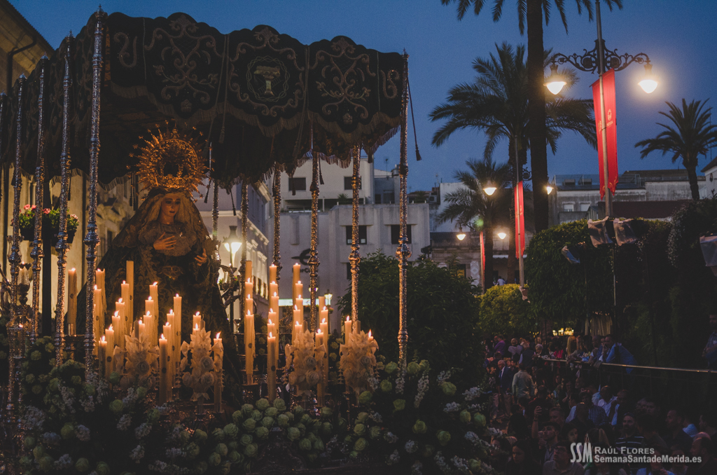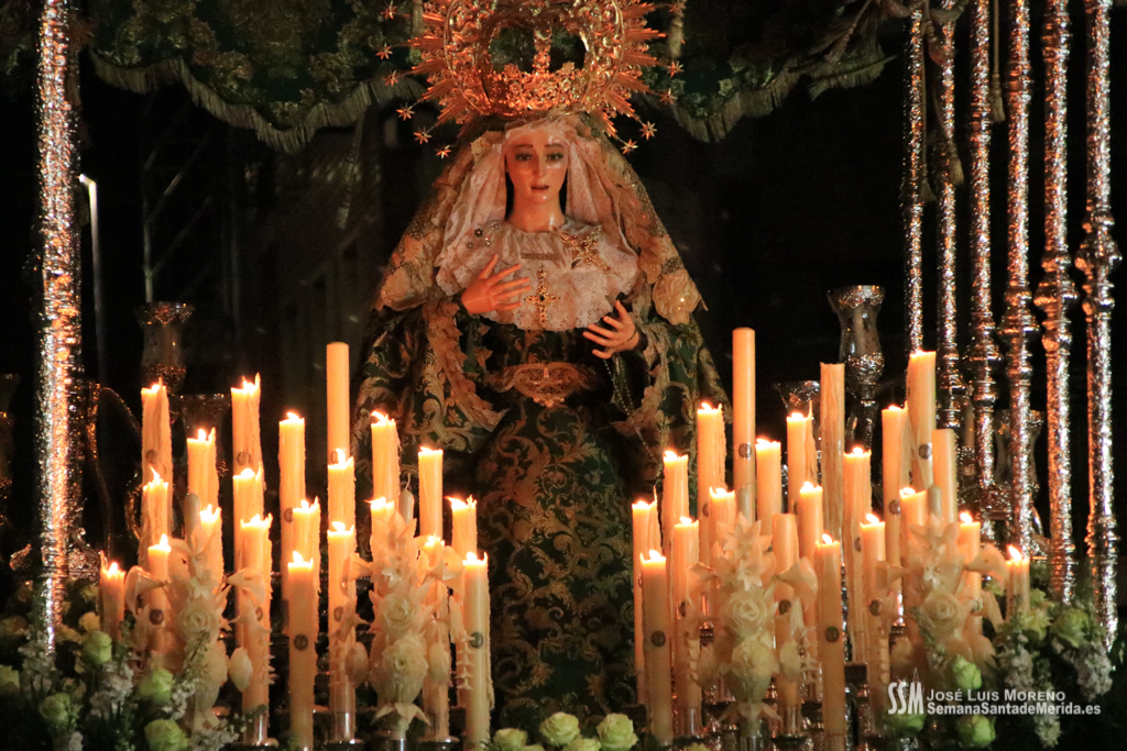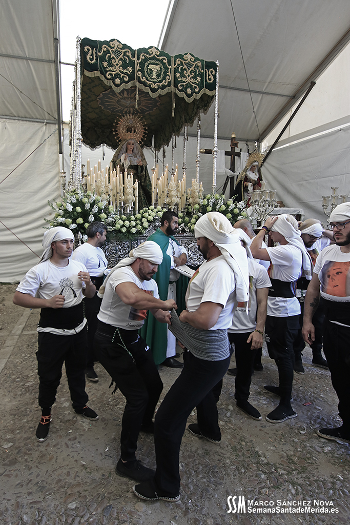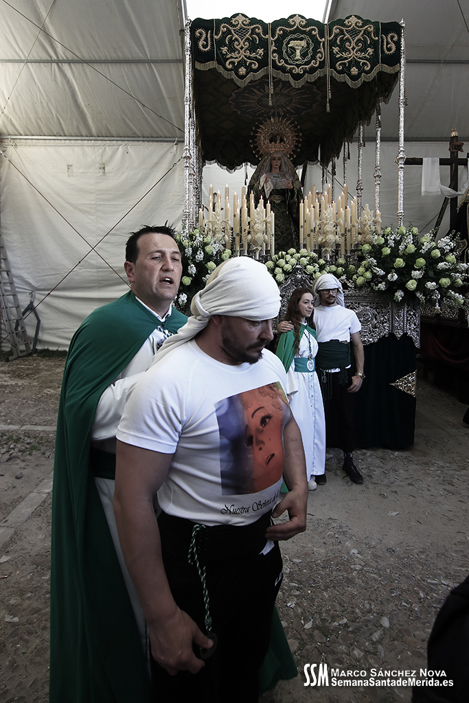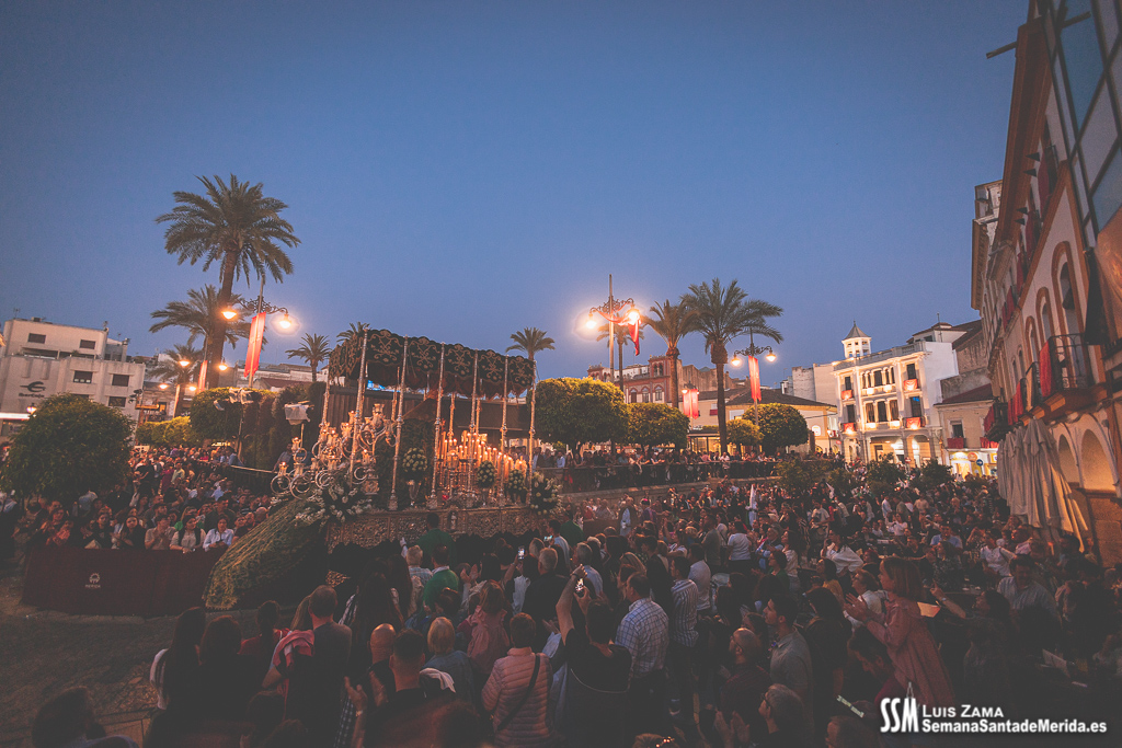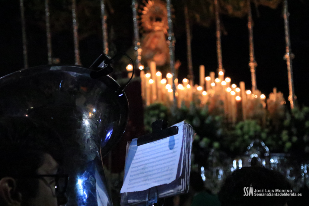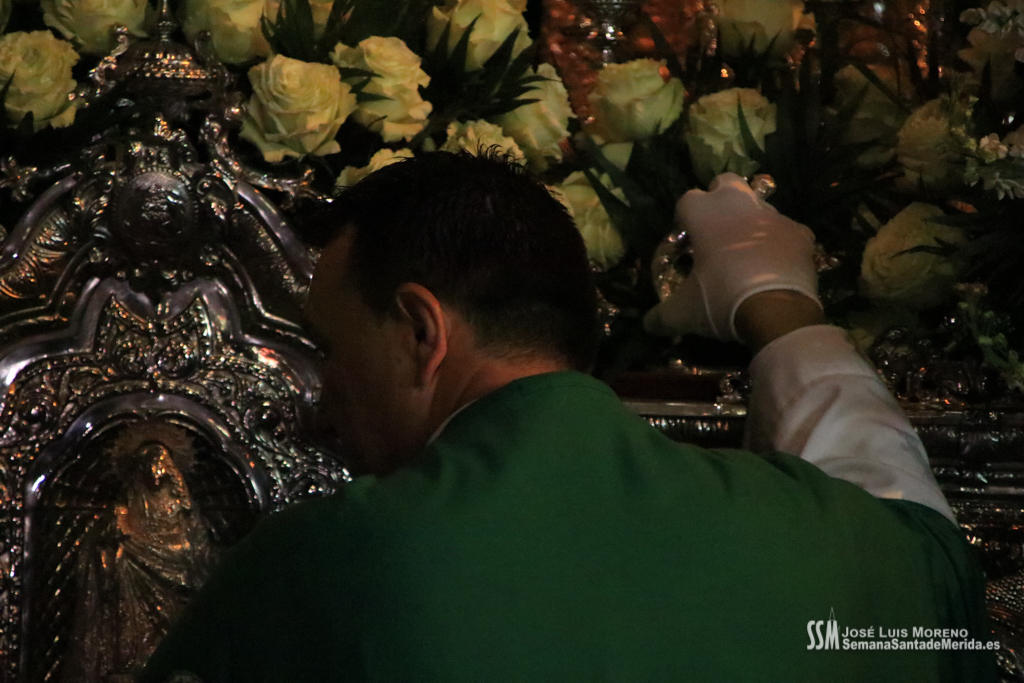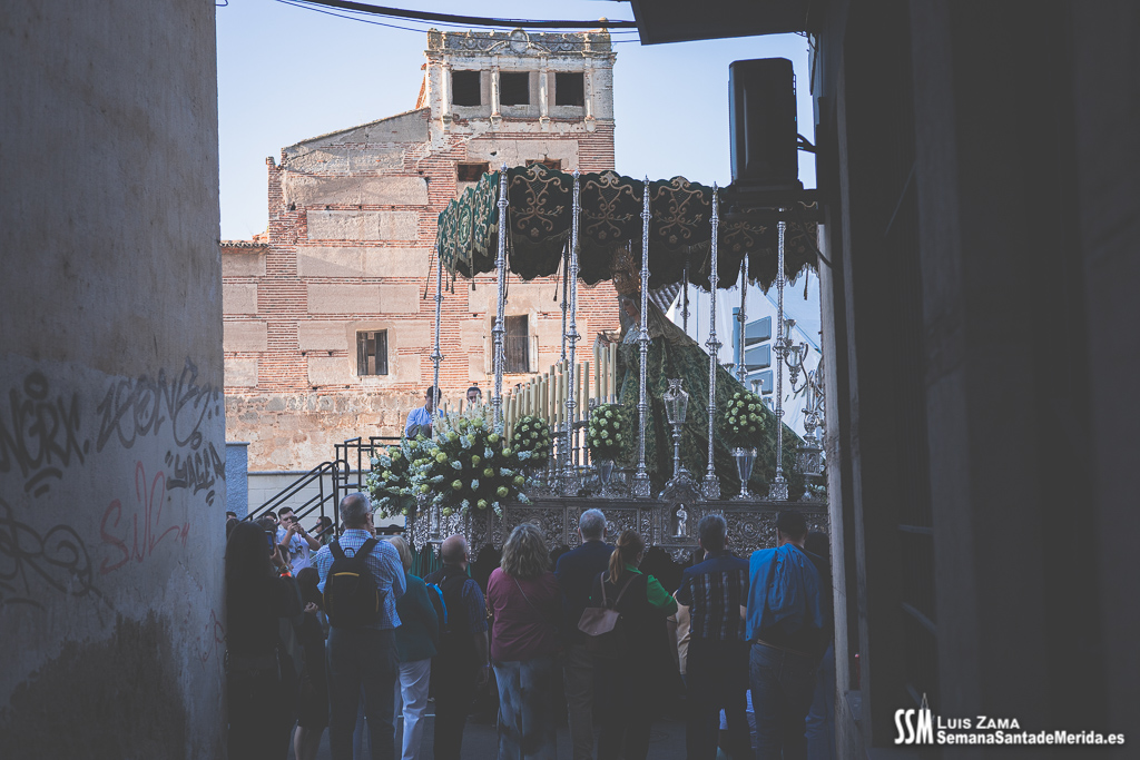 Sus costaleros la llevan en volandas, como si fuese levitando en el aire, ella los cubre con su manto y los protege, como una madre protege a su hijo. Todo fruto del trabajo y esfuerzo de sus costaleros y capataces, horas de ensayo y de falta de sueño para poder realizar el buen trabajo, mañana otra vez la sacaran a la calle, pero será como si no la hubiesen paseado el día anterior por las calles de la vieja Emérita Augusta.
