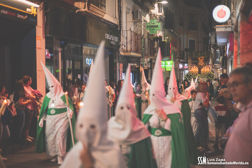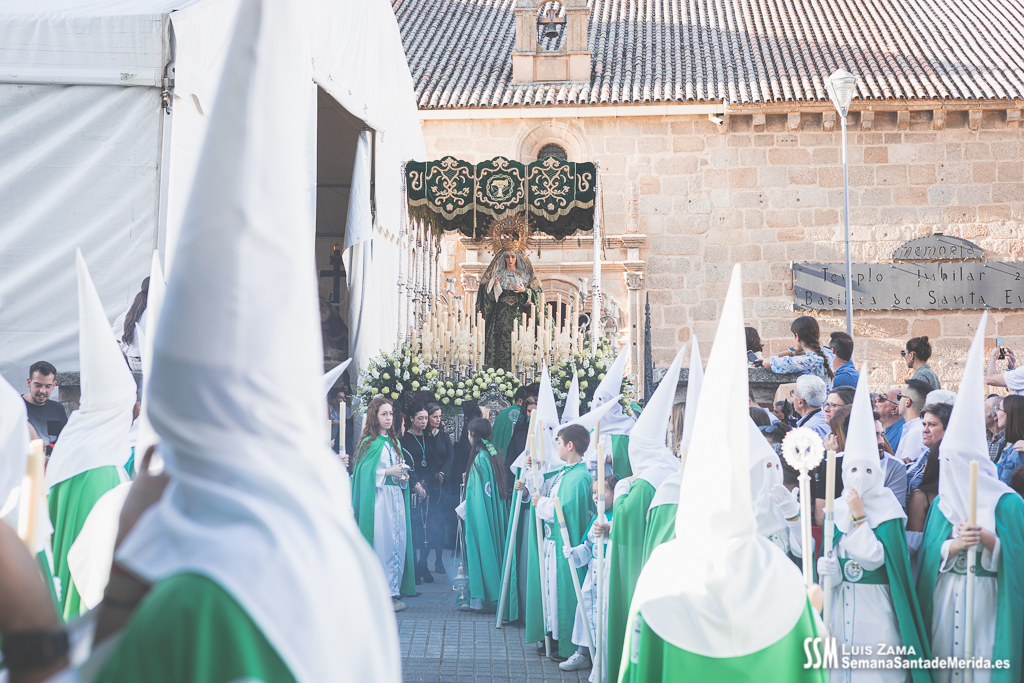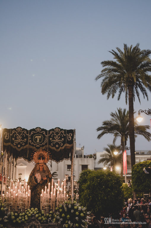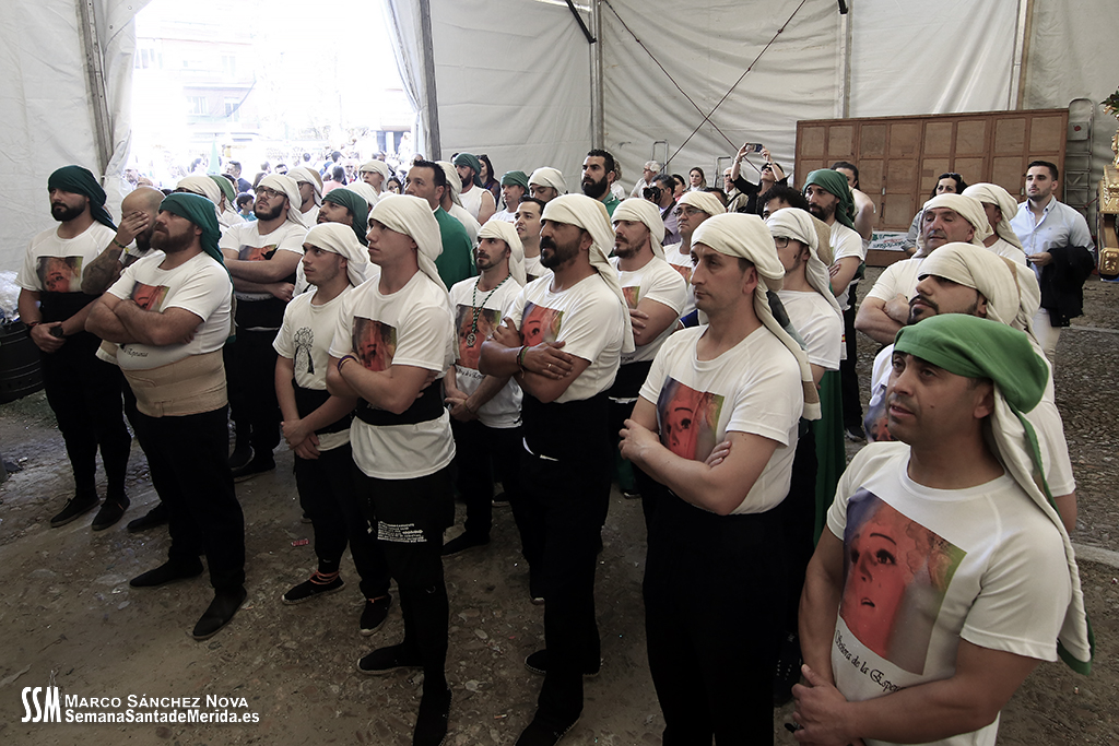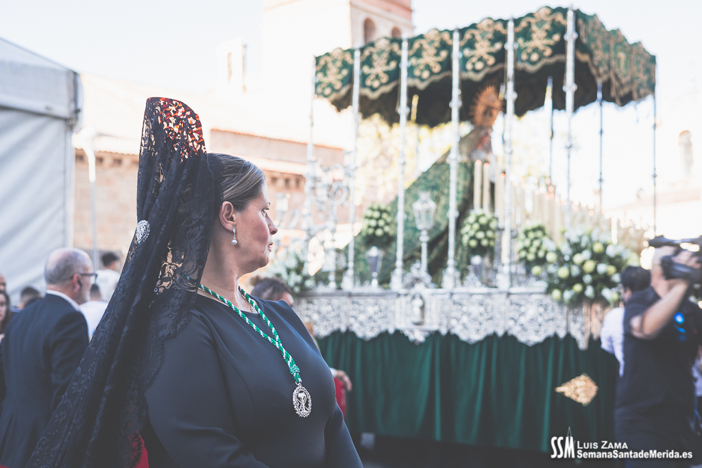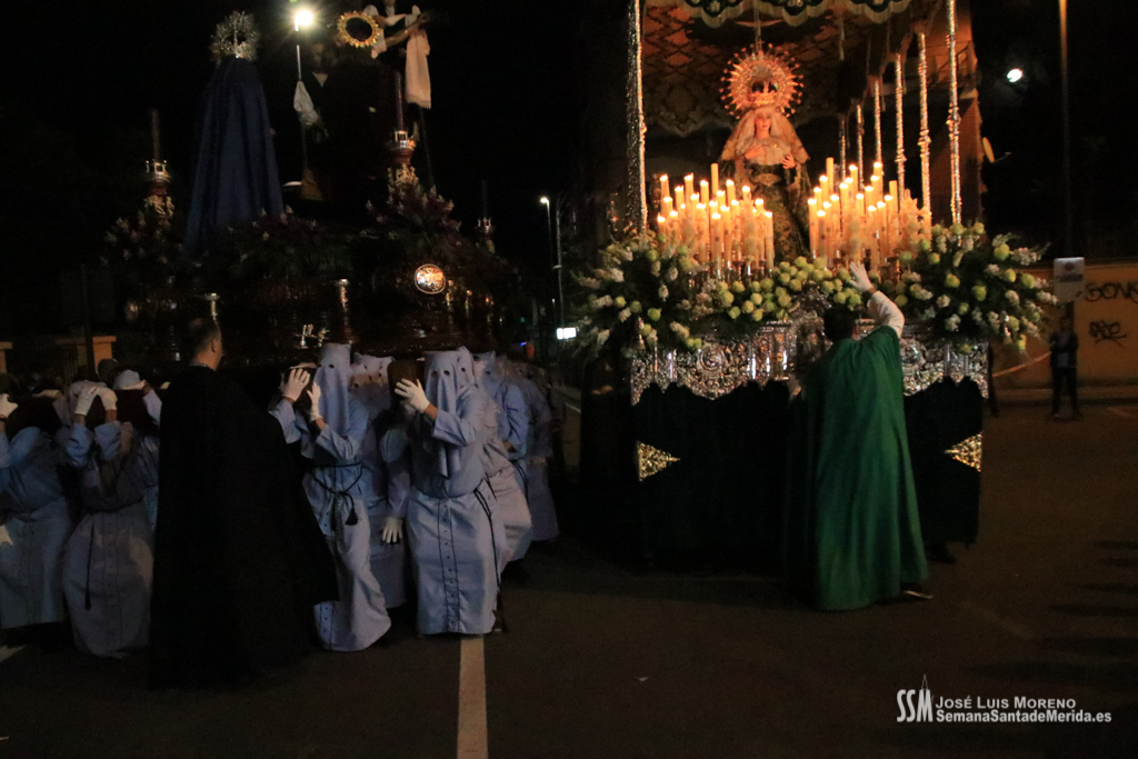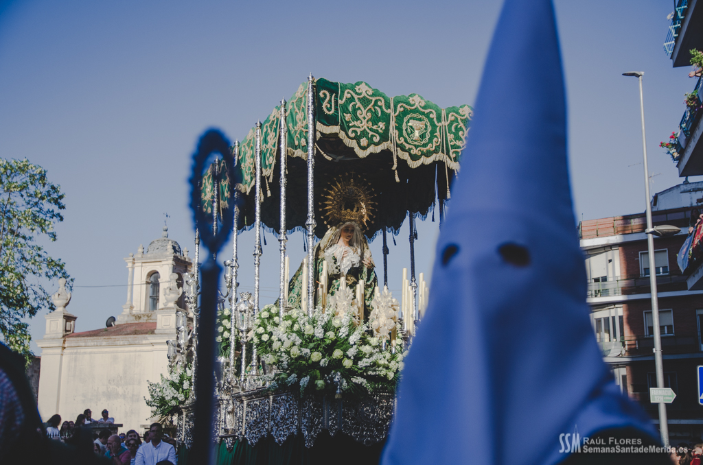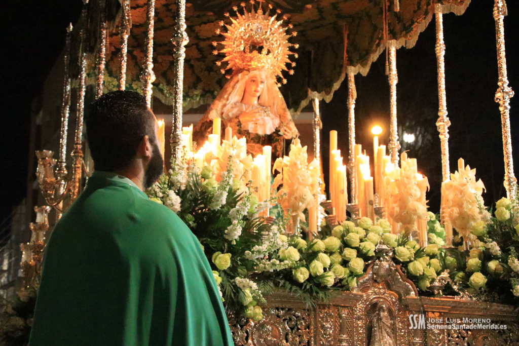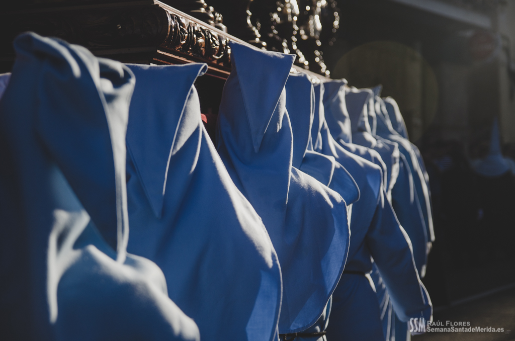 Sus costaleros la llevan en volandas, como si fuese levitando en el aire, ella los cubre con su manto y los protege, como una madre protege a su hijo. Todo fruto del trabajo y esfuerzo de sus costaleros y capataces, horas de ensayo y de falta de sueño para poder realizar el buen trabajo, mañana otra vez la sacaran a la calle, pero será como si no la hubiesen paseado el día anterior por las calles de la vieja Emérita Augusta.