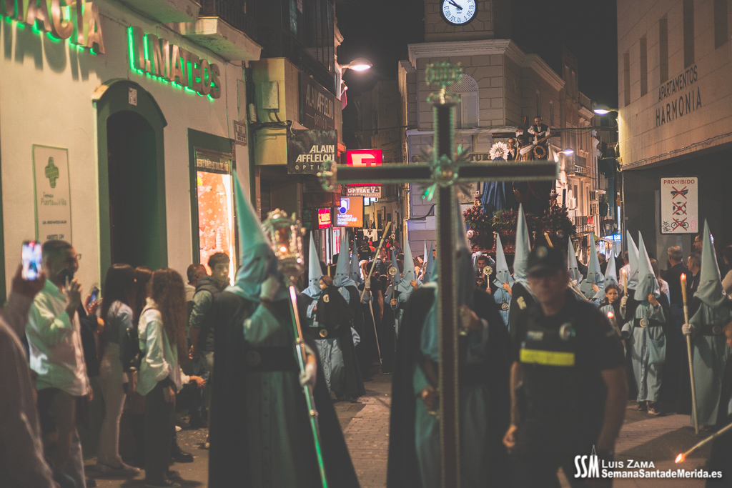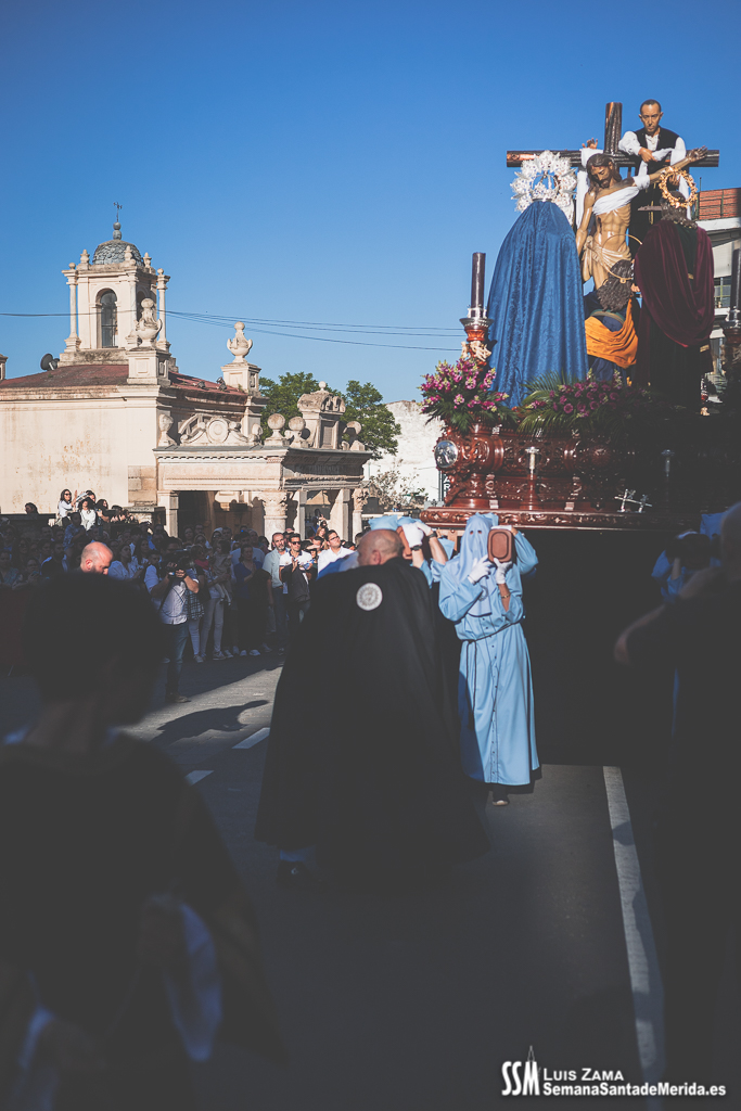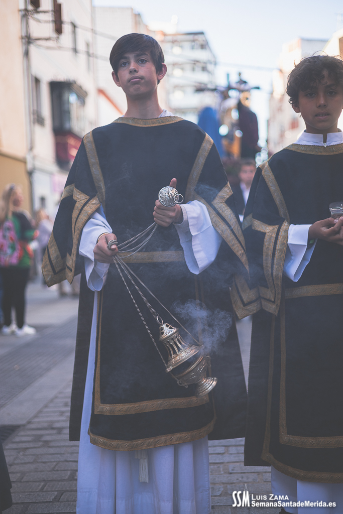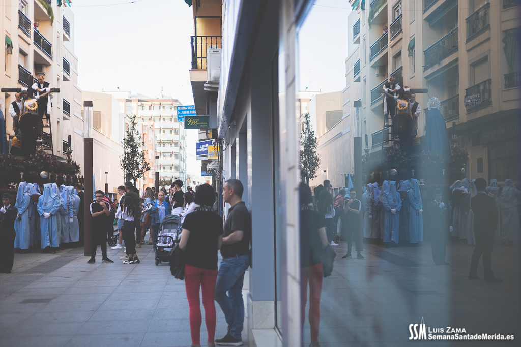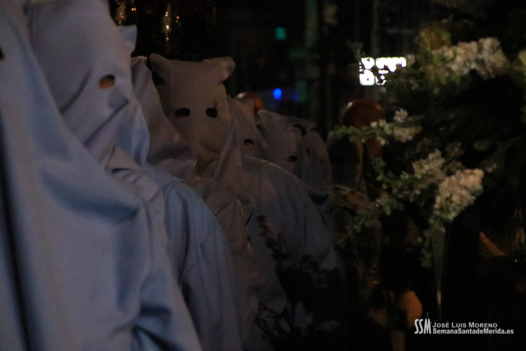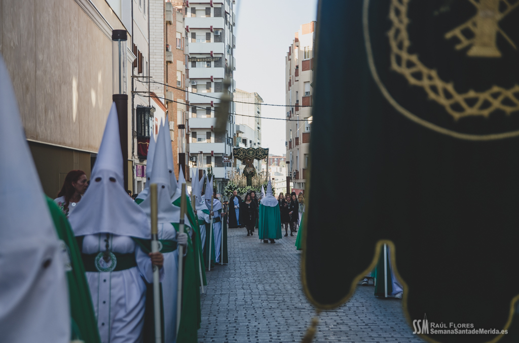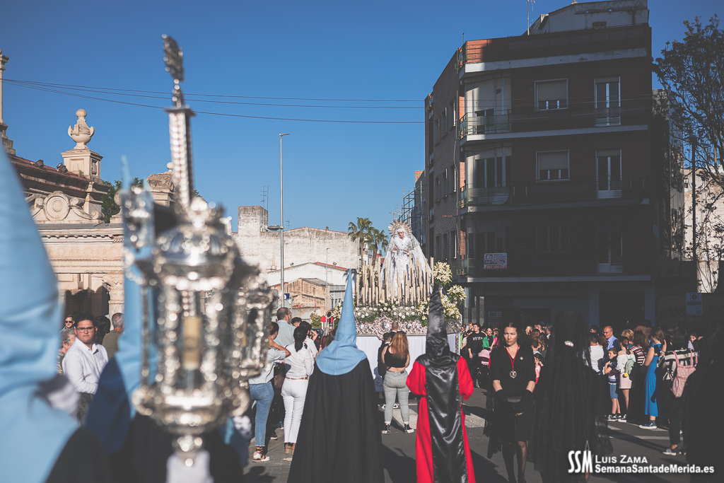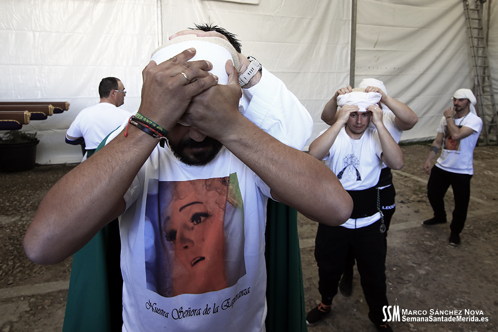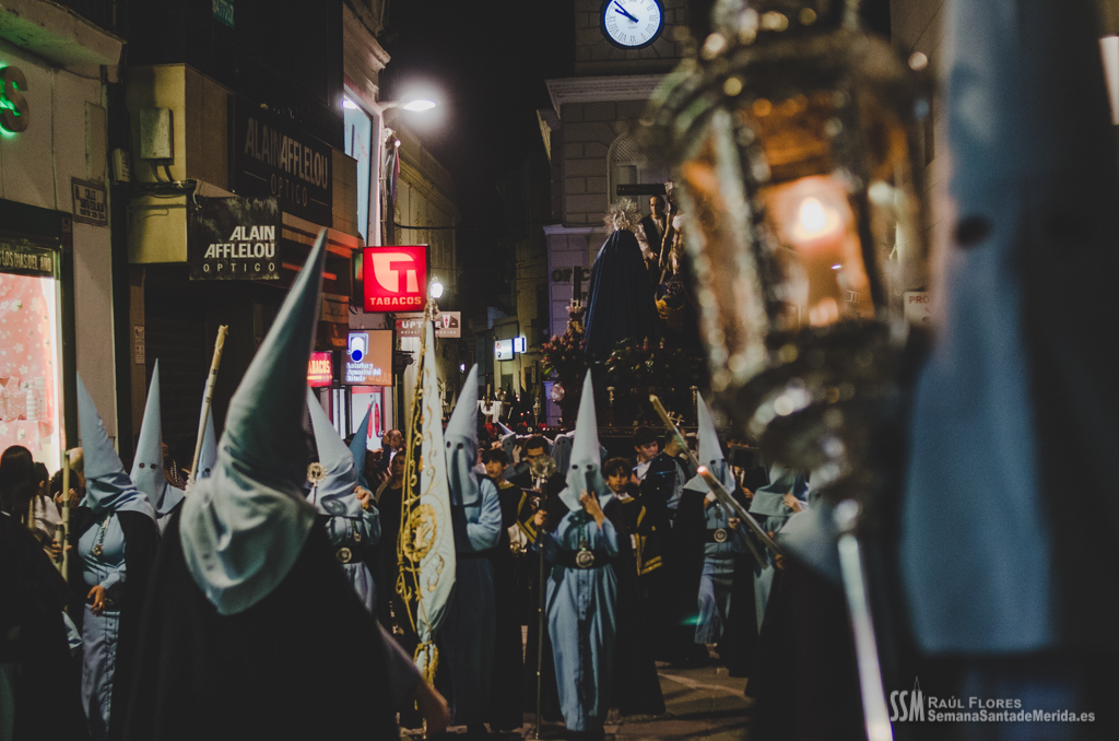 Sus costaleros la llevan en volandas, como si fuese levitando en el aire, ella los cubre con su manto y los protege, como una madre protege a su hijo. Todo fruto del trabajo y esfuerzo de sus costaleros y capataces, horas de ensayo y de falta de sueño para poder realizar el buen trabajo, mañana otra vez la sacaran a la calle, pero será como si no la hubiesen paseado el día anterior por las calles de la vieja Emérita Augusta.