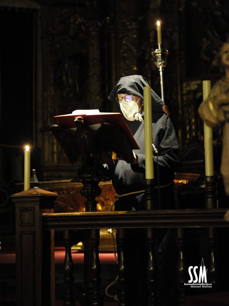 Las voces de la Capilla Gregoriana rompen el silencio de la noche y con sus cánticos invitan a todos los presentes a entrar en un dialogo íntimo con Cristo, a través de las estaciones de este Vía Crucis, que lentamente va desgranando el Sacerdote. Los miembros de la Junta de Cofradías dan lectura a cada uno de los fragmentos bíblicos que narran la Pasión de Cristo y cada estación suscita una reflexión manifestada por personas que han estado y están dando lo mejor de ellos mismos en la lucha contra la pandemia que nos asola, reconociendo que somos frágiles, que necesitamos que Dios proteja y ayude a quienes desde su tarea ayudan a combatir las consecuencias de esta enfermedad, a quienes tratan de encontrar remedio a tanto dolor, a quienes dan consuelo a los que la sufren y pidiendo que Dios acoja en el cielo a cuantos nos han dejado desde la más absoluta soledad.