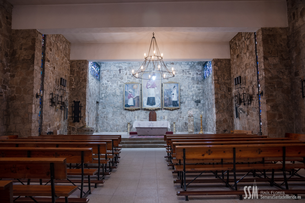 El presbiterio acoge tres cuadros del pintor Julián Pérez Muñoz que que reflejan la vida de San Francisco de Sales. Junto a la puerta de entrada se abre una pequeña capilla, forrada en madera, que acoge las imágenes titulares del paso del “Prendimiento de Jesús” de la Cofradía del Prendimiento de Jesús y Ntra. Señora de la Paz, labrada en madera maciza policromada, realizada en 1956 por el escultor emeritense Juan de Ávalos