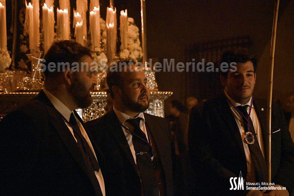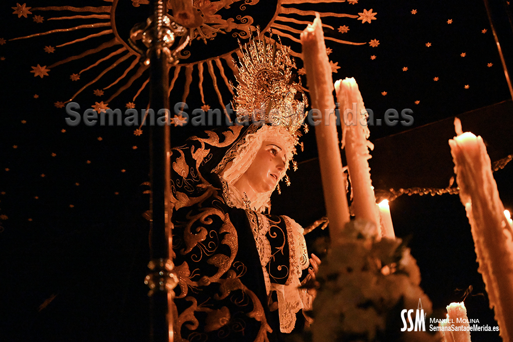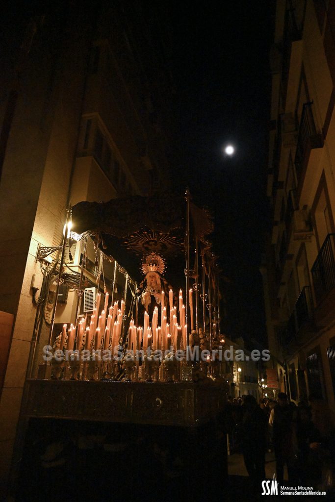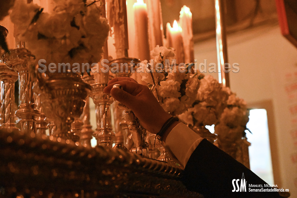 Las puertas de Santa María se abren y nuestra madre, María Santísima de los Dolores en su Soledad, nos está esperando dentro con la cara iluminada por su candelería. Sorprende verla aún bajo palio, como si no quisiera asumir lo que ha pasado esta tarde.