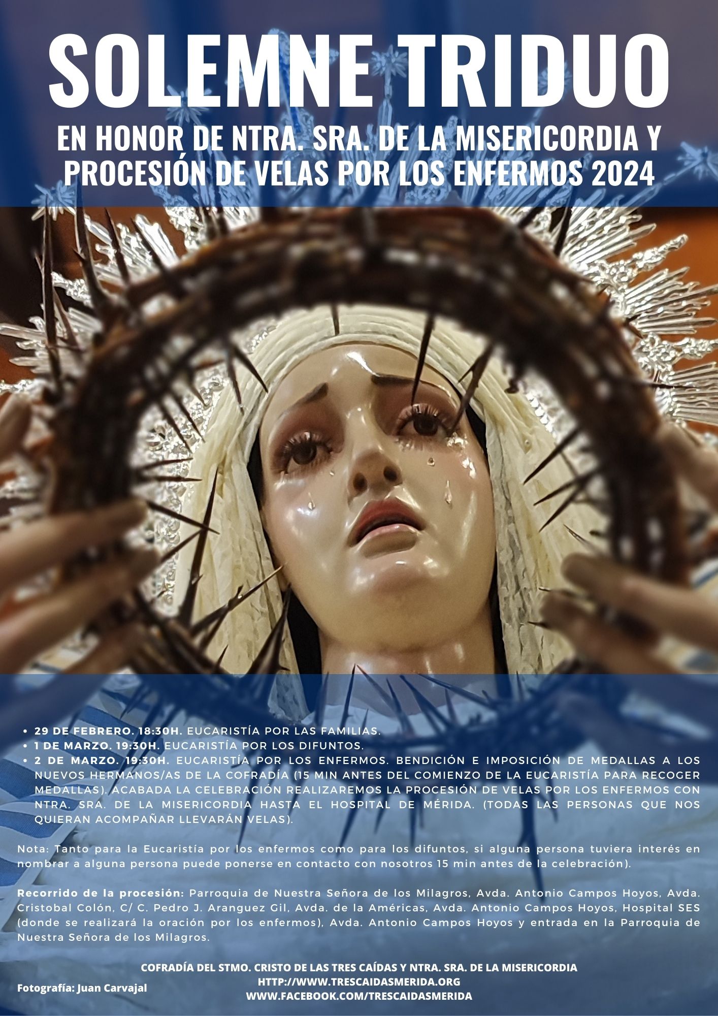 - 2 de Marzo. 19:30h. eucaristía por los enfermos. bendición e imposición de medallas a los nuevos hermanos/as de la Cofradía (15 min antes del comienzo de la eucaristía para recoger medallas). Acabada la celebración realizaremos la procesión de velas por los enfermos con ntra. Sra. de la misericordia hasta el hospital de mérida. (Todas las personas que nos quieran acompañar llevarán velas).