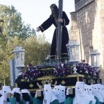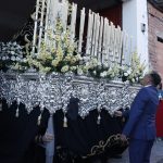 Las portadoras, con mimo, al unísono y de forma coordinada sacan la imagen, llega el momento esperado y con un cariño, del de verdad, del que se demuestra, se disponen a iniciar el recorrido de Jesús de la Humildad, que luce con orgullo, la nueva túnica realizada en el taller de bordados de la Hermandad. Un Jesús que con un brazo sujeta la Cruz y con el otro, extendido, parece querer dar las gracias a todos los vecinos que lo miran con devoción, sobre un monte de romero y siemprevivas, mientras que, en los laterales, las calas blancas se mezclan con las flores moradas, entre las que destacan las rosas lilas, símbolo de eternidad.