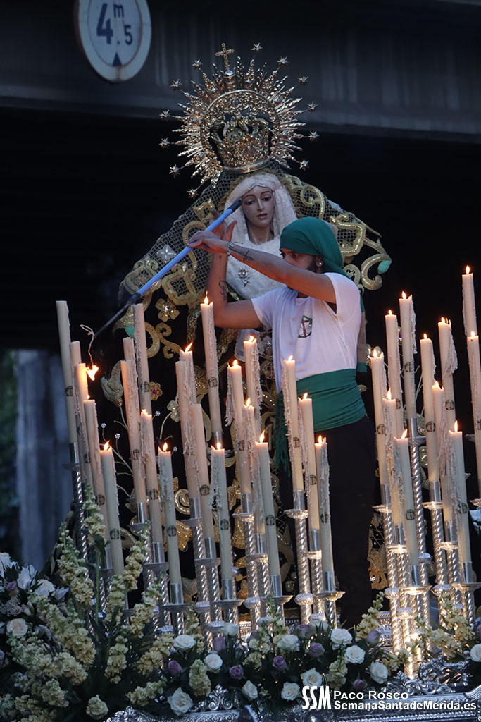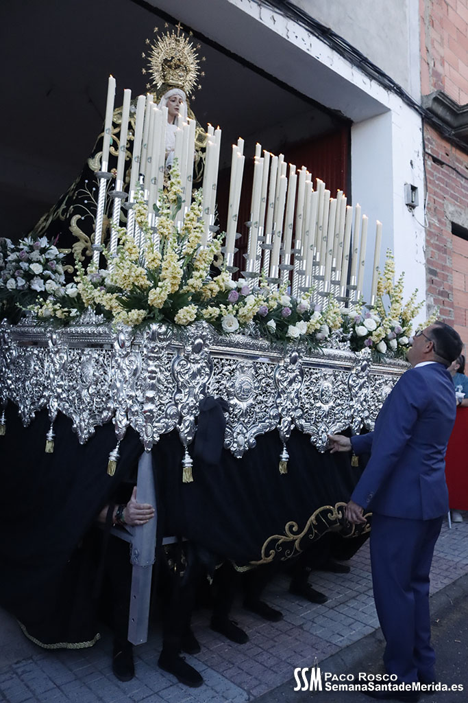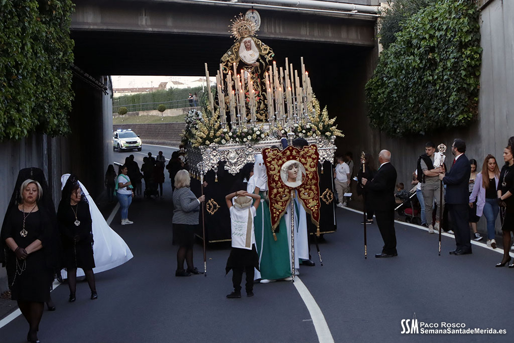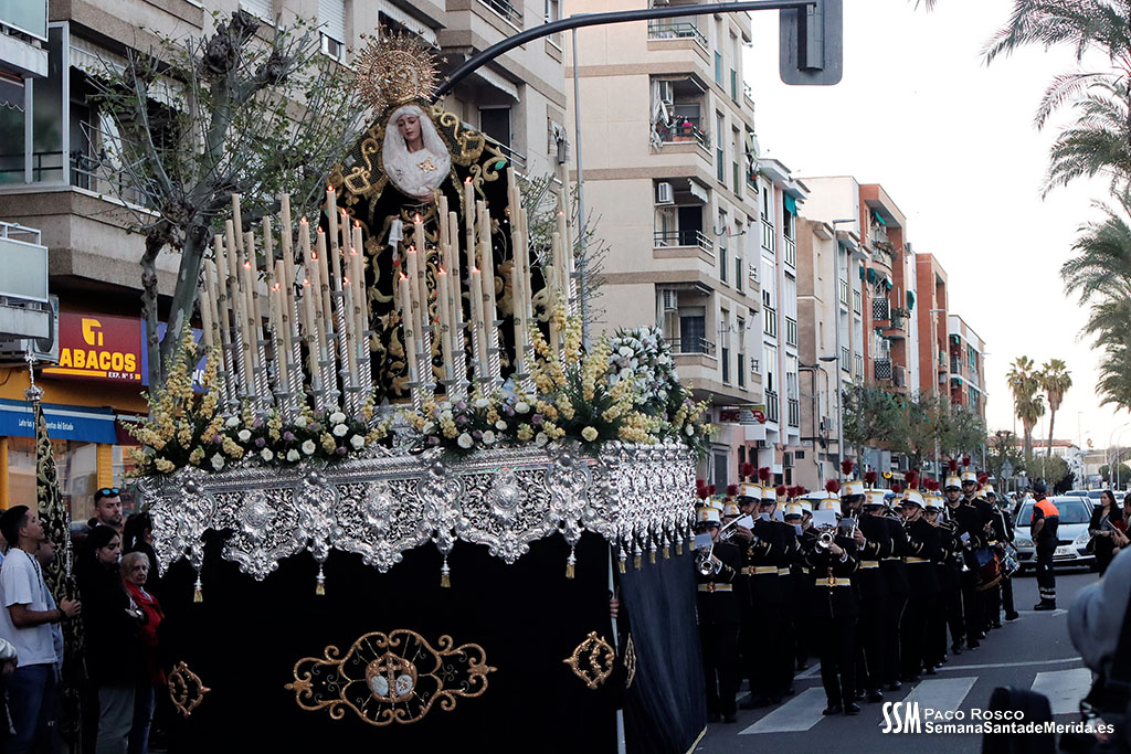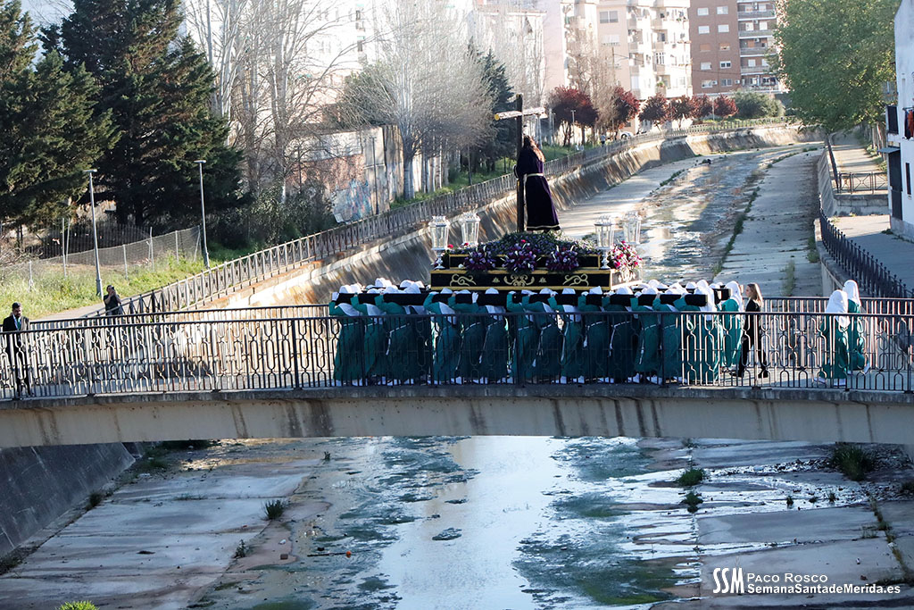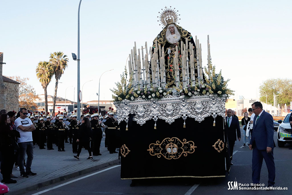 Despacito, poco a poco, en silencio, ante una gran expectación, sale la Señora del Barrio de San Juan. Ya en la calle, la reciben los sones de la agrupación de la Paz y es el momento, en el que los fieles no quieren o no pueden impedir que las lágrimas broten de sus ojos, son muchos los recuerdos y momentos vividos. “Al cielo con ella”, se escucha debajo del paso de la Virgen y suena “La Saeta” y los costaleros orgullosos, mueven a su Madre, que camina detrás de su Hijo, con el cariño de un barrio que los acompaña cuando cruzan por el puente sobre el Albarregas, una de las más imágenes más singulares de la Semana Santa de Mérida. La Hermandad cruza el parque de la Ermita y va dejando atrás las calles estrechas de San Juan para hacerse grande en la Avenida Juan Carlos I.