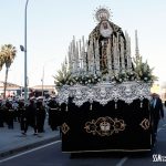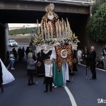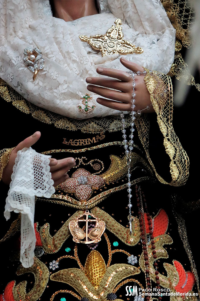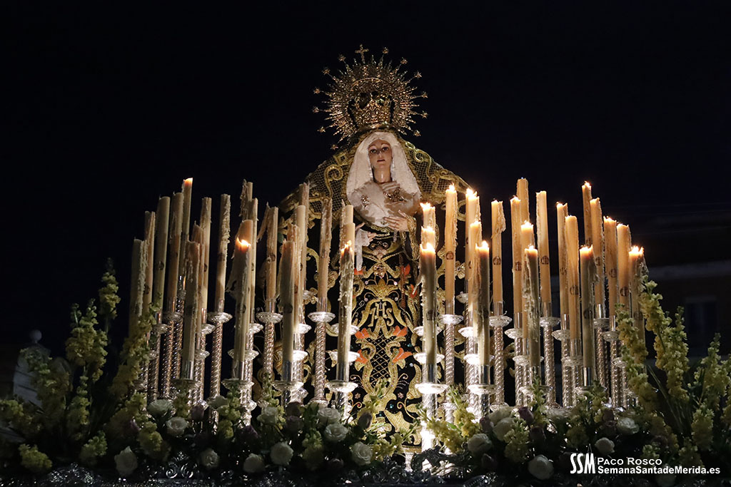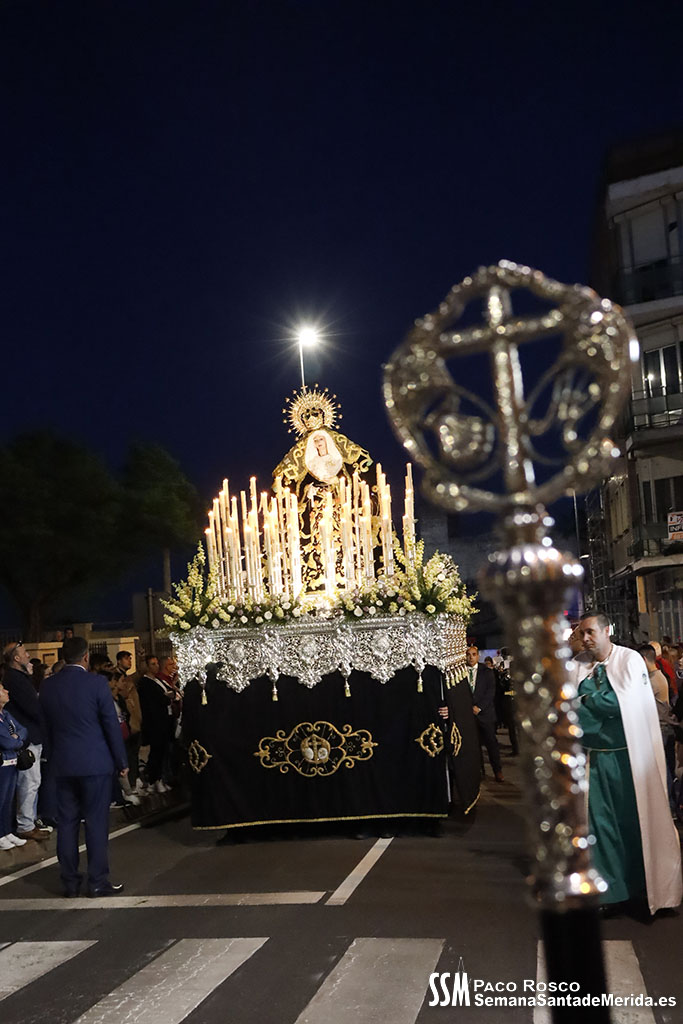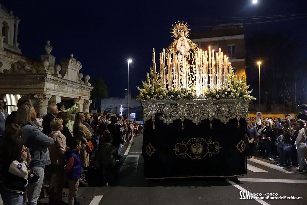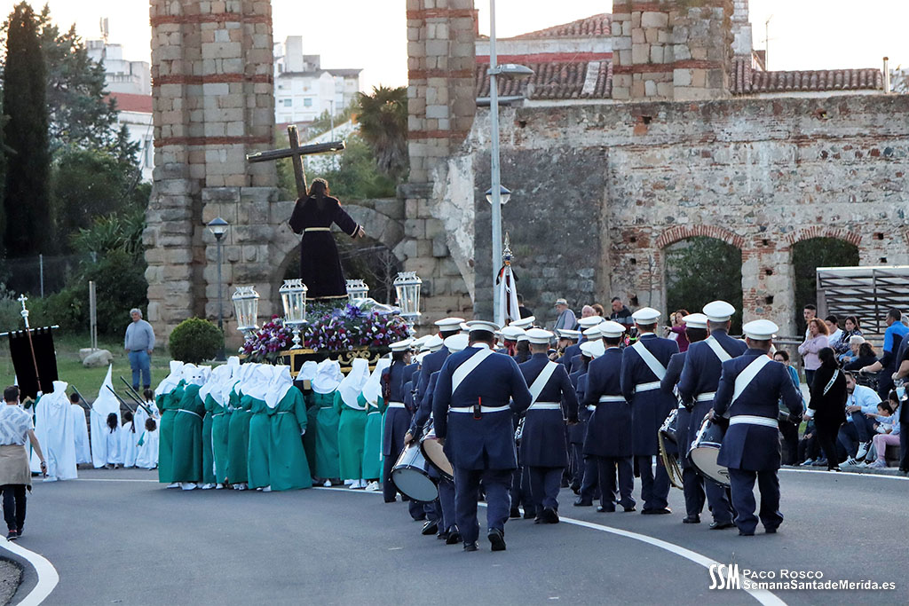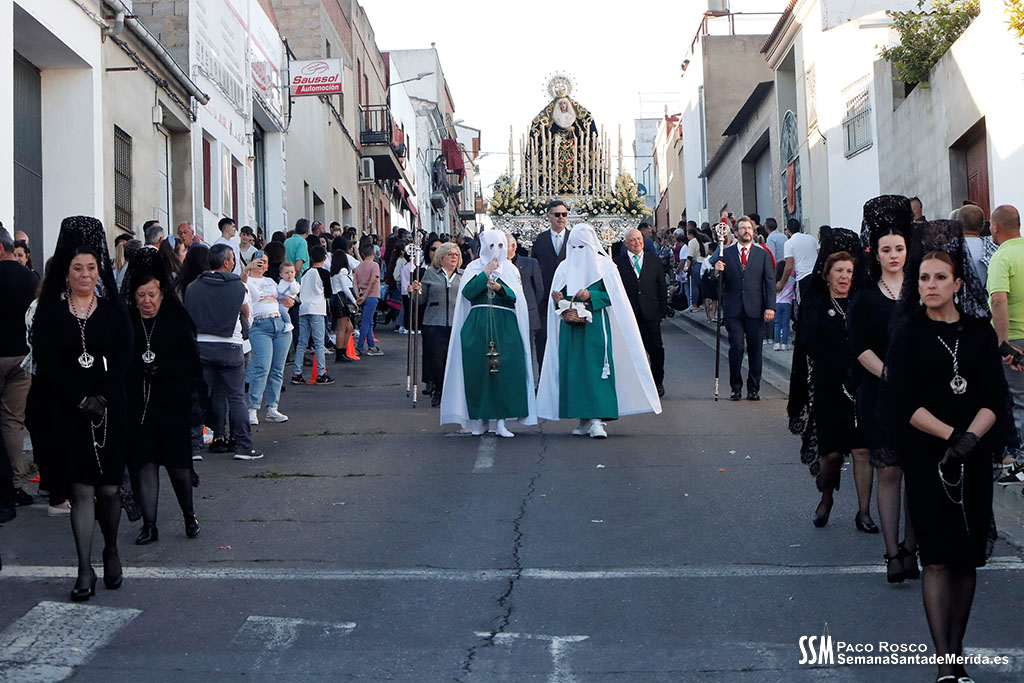 Despacito, poco a poco, en silencio, ante una gran expectación, sale la Señora del Barrio de San Juan. Ya en la calle, la reciben los sones de la agrupación de la Paz y es el momento, en el que los fieles no quieren o no pueden impedir que las lágrimas broten de sus ojos, son muchos los recuerdos y momentos vividos. “Al cielo con ella”, se escucha debajo del paso de la Virgen y suena “La Saeta” y los costaleros orgullosos, mueven a su Madre, que camina detrás de su Hijo, con el cariño de un barrio que los acompaña cuando cruzan por el puente sobre el Albarregas, una de las más imágenes más singulares de la Semana Santa de Mérida. La Hermandad cruza el parque de la Ermita y va dejando atrás las calles estrechas de San Juan para hacerse grande en la Avenida Juan Carlos I.