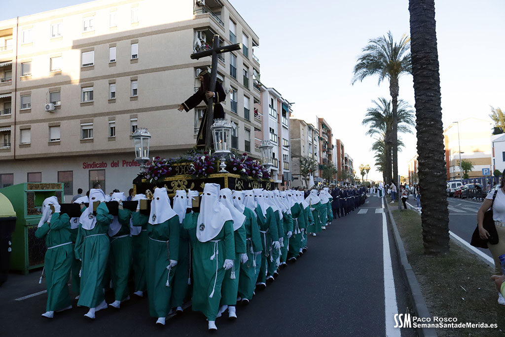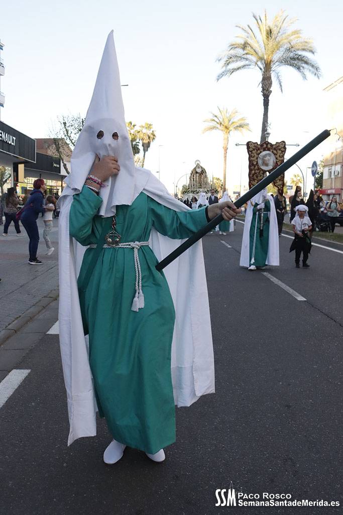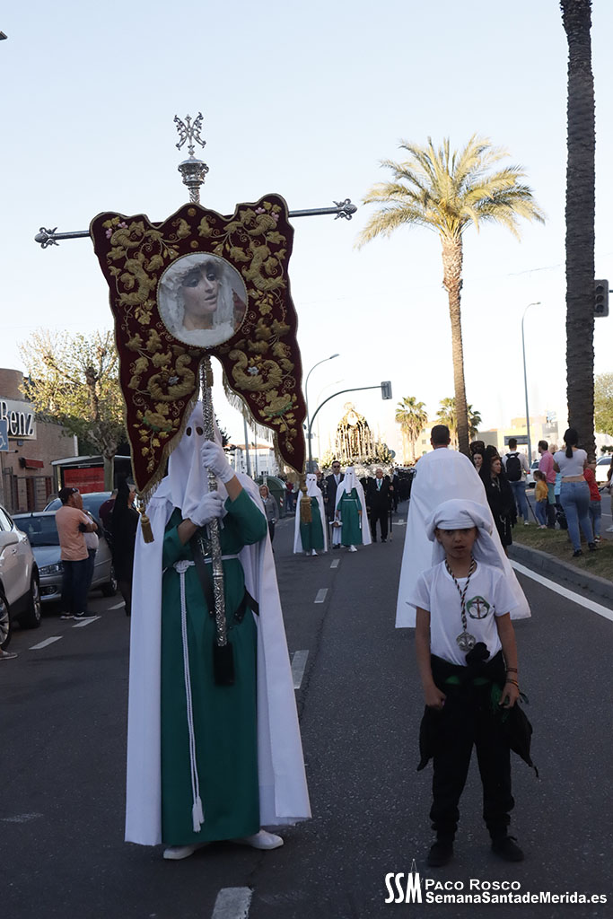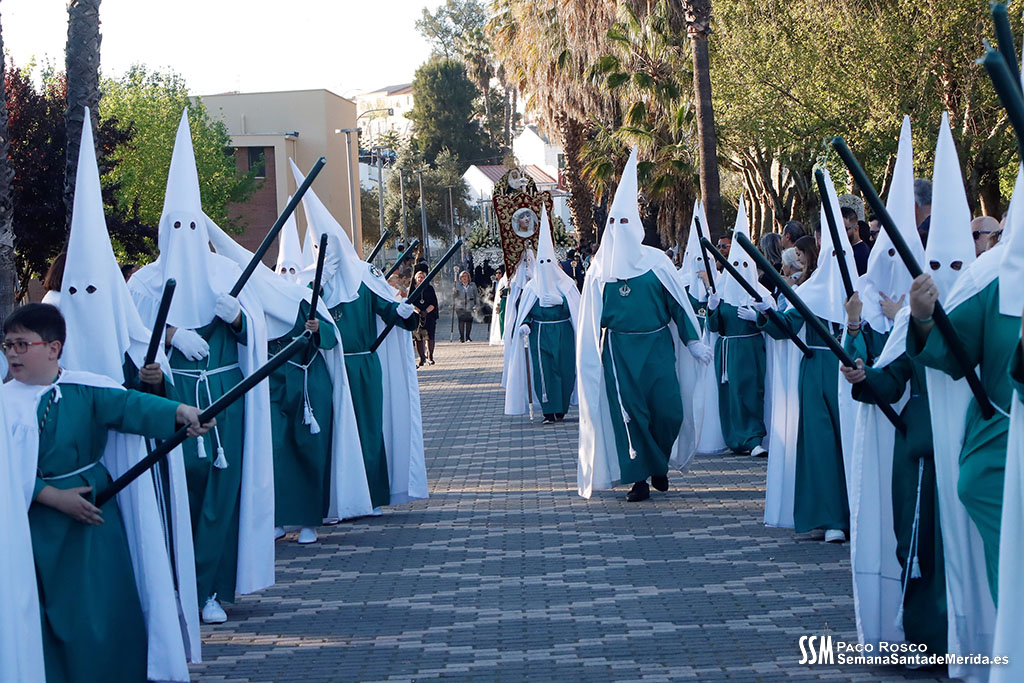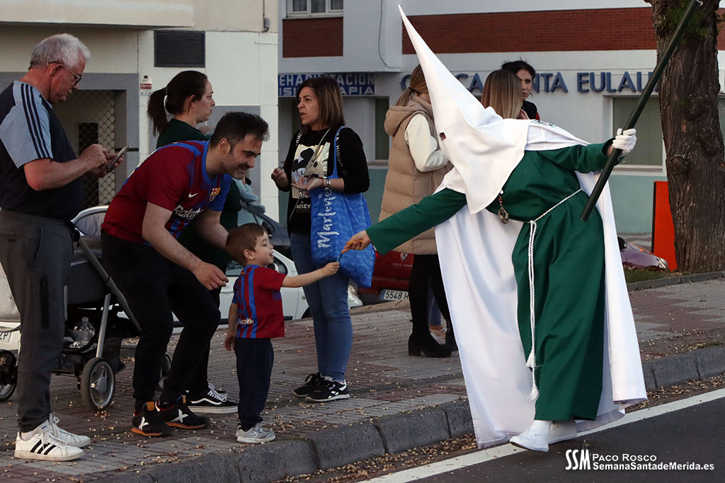 Una Hermandad que se encamina a la carrera oficial, pero que antes tiene una cita con la patrona de Mérida, con Santa Eulalia, a la que visitan en su Basílica, antes de disponerse a entrar en carrera oficial, y lo hacen con el orgullo, con la ilusión de los más pequeños que continúan con una sonrisa velando por sus titulares y así llegan a la Concatedral.