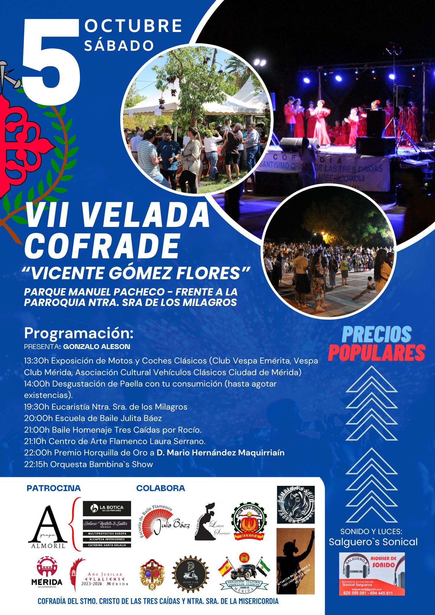Este próximo sábado 5 de octubre tendrá lugar la VII Velada Cofrade “Vicente Gómez Flores”, organizada por la Cofradía del Stmo. Cristo de las Tres Caídas y Ntra. Sra. de la Misericordia. El evento se llevará a cabo en el Parque Manuel Pacheco (frente a la Parroquia Ntra. Sra. de los Milagros en Nueva Ciudad).
